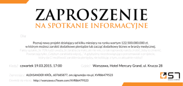 ZAPROSZENIE NA SPOTKANIE INFORMACYJNE Dla: Poznaj nowy projekt działający od kilku miesięcy na rynku wartym 122.500.000.000 zł, w którym możesz zarobić dodatkowe pieniądze lub zacząć dodatkowy biznes w branży medycznej. Fakty są takie, że 70% ludzi uważa, że zarabia za mało, ale nie wie, co tak naprawdę należy zrobić, żeby to zmienić. Powtarzają tylko „Gdybym zarabiał/a więcej…” A gdybyśmy niezobowiązująco porozmawiali o projekcie, który da Ci możliwość zarobienia pieniędzy, nie kolidując z tym, co aktualnie robisz? Kiedy? czwartek 19.03.2015, 17:00 Gdzie? Warszawa, Hotel Mercury Grand, ul. Krucza 28 Zapraszający: ALEKSANDER KRÓL, 607685877, [email protected], XVR86479523 Dowiedz się więcej: http://warszawa.s7team.com/XVR86479523