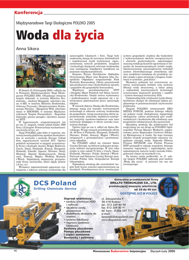 Konferencja Międzynarodowe Targi Ekologiczne POLEKO 2005 Woda dla życia Anna Sikora W dniach 15-18 listopada 2005 r. odbyły się w Poznaniu Międzynarodowe Targi Ekologiczne POLEKO 2005. Oficjalnego otwarcia targów dokonali: w imieniu Ministra Środowiska – Andrzej Mizgajski, sekretarz stanu w MŚ, w imieniu Ministra Środowiska, Ochrony Przyrody i Bezpieczeństwa Nuklearnego Niemiec - Margareta Wolf, sekretarz stanu w MŚOPiBN, w imieniu Międzynarodowych Targów Poznańskich - Bogusław Zalewski, prezes zarządu i dyrektor naczelny MTP. W tegorocznych, zorganizowanych już po raz 17. targach, wzięło udział blisko 1000 firm z 22 krajów. Powierzchnia wystawiennicza liczyła 15 tys. m2. Targi POLEKO, jako lider w regionie, stanowią swoistą platformę spotkań kontrahentów ze wschodu i zachodu Europy. Udział firm zagranicznych wyniósł 32%. Oprócz polskich wystawców w targach uczestniczyły firmy z Australii, Austrii, Belgii, Białorusi, Czech, Danii, Finlandii, Francji, Hiszpanii, Holandii, Irlandii, Japonii, Niemiec, Rosji, Słowacji, Stanów Zjednoczonych, Szwajcarii, Szwecji, Węgier, Wielkiej Brytanii i Włoch. Największą ekspozycję przygotowały firmy niemieckie, które zajęły prawie 1,6 tys. m2. Wystawcy zaprezentowali najnowsze rozwiązania z zakresu ochrony środowiska dla samorządów lokalnych i firm. Targi były znakomitą okazją do wymiany doświadczeń i współczesnej myśli technicznej, zaprezentowania nowych produktów, urządzeń i technologii służących ochronie środowiska oraz nawiązania współpracy handlowej na poziomie międzynarodowym. Krajowe Forum Dyrektorów Zakładów Oczyszczania Miast oraz Krajowa Izba Gospodarki Odpadami zorganizowały Park Techniki Komunalnej. Oferty prezentowali tam producenci oraz i dystrybutorzy sprzętu i pojazdów dla gospodarki komunalnej. Wspólnym przedsięwzięciem MTP i Związku Miast Polskich był Salon Investcity-Środowisko. Dzięki niemu wykonawcy i podwykonawcy mogli zapoznać się z inwestycjami planowanymi przez samorządy lokalne. W ramach Salonu Nauka dla Środowiska, którego misją jest transfer nowoczesnych technologii w zakresie ochrony środowiska do gospodarki, swoją innowacyjną ofertę zaprezentowały jednostki badawczo-rozwojowe, instytuty naukowo-badawcze oraz inne instytucje działające w sferze szeroko rozumianej ekologii. Oprócz tego po raz 4. odbył się Salon Recyklingu. W jego ramach przedstawiło ofertę ok. 90 firm (z Finlandii, Hiszpanii, Holandii, Niemiec, Polski, Szwecji, Węgier i Włoch), związanych z gromadzeniem i przetwarzaniem odpadów. Na POLEKO odbył się również Salon Czystej Energii, na którym pokazano propozycje sektora energetycznego. W tym roku wzięło w nim udział 75 firm z Czech, Danii, Finlandii, Niemiec, Polski, Szwecji i Włoch. Patronat nad Salonem Czystej Energii sprawowała Polska Izba Gospodarcza Energii Odnawialnej. Największą atrakcją dla uczestników targów były liczne nowości zaprezentowane na stoiskach. Przedstawiono m.in. rewolucyjny system gospodarki cieplnej dla budynków z wykorzystaniem dachów energetycznych i otworów geotermalnych, zapewniający znaczną redukcję kosztów ogrzewania w stosunku do konwencjonalnych źródeł ciepła. Zainteresowanie samorządowców wzbudził system fotowoltaicznego oświetlenia ulic oraz modułowa instalacja do produkcji ciepła i prądu z gazu ziemnego i biogazu, budowana w systemie „pod klucz”. Wystawcy pokazali też nowoczesne systemy oczyszczania ścieków oraz systemy filtracji wody deszczowej, a także jedną z najbardziej innowacyjnych technologii oczyszczania skażonych gruntów i osadów - system desorpcji termicznej AVA. Ciekawostką były celulozowe tynki dźwiękochłonne służące do eliminacji hałasu pogłosowego w pomieszczeniach użyteczności publicznej. Targom POLEKO towarzyszyło EKO MEDIA FORUM, podczas którego odbyły się pokazy mody ekologicznej, happeningi ekologiczne, salony prezentacji gier multimedialnych i konkursów dla młodzieży oraz programów edukacyjnych dla nauczycieli. Specjalną atrakcją dla publiczności był rozgrywany po raz drugi na POLEKO Ogólnopolski Turniej Maszyn Wodnych, organizowany przez Regionalne Centrum Edukacji Ekologicznej w Łodzi. Do tego turnieju szkolne zespoły przygotowały maszyny napędzane energią wody. Nagroda Główna Prezesa NFOŚiGW oraz Puchar Prezesa MTP przypadł w udziale zespołowi, którego maszyna najszybciej i najwydajniej (przy najmniejszym zużyciu wody) uniosła 3-kilogramowy ciężar na wysokość 4 m. Na koniec warto podkreślić, że 17. edycja targów POLEKO upłynęła pod hasłem „Woda dla życia”. A przecież nie ma nic cenniejszego. Generalny przedstawiciel firmy DCS Poland DRILLTO TRENCHLESS CO., LTD. produkującej maszyny wiertnicze od 10 do 40 ton Drilling Chemicals Service DOSTĘPNE JUŻ W POLSCE Osprzęt wiertniczy: • żerdzie, wiertnicze HDD i naftowe • obudowy sondy, poszerzacze • dodatkowe akcesoria do wiertnic • systemy lokalizacji • naprawy systemów lokalizacji. Systemy płuczkowe Pompy płuczkowe i części zamienne Bentonity i polimery 46 ul. Zakopiańska 9 30-418 Kraków tel.: 012 269 80 90 fax: 012 269 80 91 tel. kom.: 0 606 207 711 e-mail: [email protected] www.dcspoland.com Nowoczesne Budownictwo Inżynieryjne Styczeń-Luty 2006