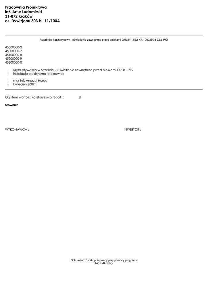 Pracownia Projektowa inż. Artur Ludomirski 31-872 Kraków os. Dywizjonu 303 bl. 11/100A Przedmiar kosztorysowy - oświetlenie zewnętrzne przed boiskami ORLIK - ZE2 KP/1002/E/08-ZE2-PK1 45500000-2 45000000-7 45100000-8 45200000-9 45300000-0 : : Kryta pływalnia w Strzelinie - Oświetlenie zewnętrzne przed bioskami ORLIK - ZE2 instalacje elektryczne i pokrewne : : mgr inż. Andrzej Herod kwiecień 2009r. Ogółem wartość kosztorysowa robót : zł Słownie: WYKONAWCA : INWESTOR : Dokument został opracowany przy pomocy programu NORMA PRO elektryka_STRZELIN_os_zewn-ZE2_(prz)_SST.ath KSIĄŻKA PRZEDMIARÓW Lp. Podstawa Opis i wyliczenia j.m. 1 Oświetlenie zewnętrzne - ZE2 1 KNR-W 2-01 KP/1002/Z/08-ZPE m d.1 0702-02 Kopanie koparkami podsiębiernymi rowów dla kabli o głębokości do 1.0 m i szer. dna do 0.4 m w gruncie kat. III-IV (80% mechanicznie) korekta ob- (75+15+60)*0.8 m miaru Poszcz 120.000 RAZEM 2 KNR-W 2-01 KP/1002/Z/08-ZPE m d.1 0701-02 Ręczne kopanie rowów dla kabli o głębokości do 1.0 m i szer. dna do 0.4 w gruncie kat. III (20% ręcznie) korekta ob- (75+15+60)*0.2 m miaru KP/1002/Z/08-ZPE Ułożenie rur oslonowych z PCW o średnicy do 140 mm (rura osłonowa dwudzielna AROT A110 PS) 12 KP/1002/Z/08-ZPE Układanie kabli o masie do 1.0 kg/m w rowach kablowych ręcznie -przewód YKY 5x6.0mm2 korekta ob- (75+15+60) miaru 1m 12.000 m 150.000 Norma PRO Wersja 4.13 Licencja: 9753 dla Pracownia Projektowa inz. Artur Ludomirski 150.000 m3 m3 5.000 RAZEM -2- 12.000 m RAZEM 8 KNR-W 2-01 KP/1002/Z/08-ZPE d.1 0708-05 Wykopy mechaniczne dla słupów elektroenergetycznych przy użyciu koparki podsiębiernej wraz z ręcznym zasypaniem o głębokości do 2.0 m w gruncie kat. I-II korekta ob- 1*5 miaru 30.000 1m RAZEM 7 KNNR 5 d.1 0707-02 120.000 30.000 RAZEM 6 KNNR 5 d.1 0705-01 analogia korekta obmiaru 120.000 120.000 RAZEM 5 KNR-W 2-01 KP/1002/Z/08-ZPE m d.1 0704-02 Ręczne zasypywanie rowów dla kabli o głębokości do 1.0 m i szer. dna do 0.4 m w gruncie kat. III (20% ręcznie) korekta ob- (75+15+60)*0.2 m miaru 30.000 120.000 RAZEM 4 KNR-W 2-01 KP/1002/Z/08-ZPE m d.1 0705-02 Mechaniczne zasypywanie spycharkami rowów dla kabli o głębokości do 1.0 m i szer. dna do 0.4 m w gruncie kat. III-IV (80% mechanicznie) korekta ob- (75+15+60)*0.8 m miaru 120.000 30.000 RAZEM 3 KNR-W 2-01 KP/1002/Z/08-ZPE m d.1 0704-01 Ręczne zasypywanie rowów dla kabli o głębokości do 1.0 m i szer. dna do analogia 0.4 m w gruncie kat. I-II (obsypka z piasku, M=2) korekta ob- (75+15+60)*0.8 m miaru Razem 5.000 elektryka_STRZELIN_os_zewn-ZE2_(prz)_SST.ath Lp. Podstawa 9 KNNR 5 d.1 1001-01 analogia korekta obmiaru KSIĄŻKA PRZEDMIARÓW Opis i wyliczenia KP/1002/Z/08-ZPE Montaż i stawianie słupów oświetleniowych o masie do 100 kg -słup stalowy 7mb 5 j.m. szt. szt. Poszcz 5.000 RAZEM 10 KNNR 5 d.1 1002-01 KP/1002/Z/08-ZPE Montaż wysięgników rurowych o masie do 15 kg na słupie -pojedyńcze korekta ob- 5 miaru KP/1002/Z/08-ZPE Montaż przewodów do opraw oświetleniowych - wciąganie w słupy, rury osłonowe i wysięgniki przy wysokości latarń do 7 m korekta ob- 5 miaru szt. 5.000 KP/1002/Z/08-ZPE Montaż opraw oświetlenia zewnętrznego na wysięgniku wraz ze źródłem światła -typ Jet-2 100W korekta ob- 5 miaru 13 KNNR 5 d.1 1304-01 14 KNNR 5 d.1 1304-02 15 KNNR 5 d.1 1301-01 16 KNNR 5 d.1 1304-05 17 KNNR 5 d.1 1304-06 kpl.prz ew. 5.000 szt. 1 szt KP/1002/Z/08-ZPE Uziemienie ochronne lub robocze, każdy następny pomiar 4 1 szt KP/1002/Z/08-ZPE Sprawdzanie i pomiar obwodu elektrycznego niskiego napięcia obwód o 1 fazie 1 1 pomiar KP/1002/Z/08-ZPE Skuteczność zerowania, pomiar pierwszy 1.0 1 szt KP/1002/Z/08-ZPE Skuteczność zerowania, każdy następny pomiar 4 1 szt Norma PRO Wersja 4.13 Licencja: 9753 dla Pracownia Projektowa inz. Artur Ludomirski 5.000 szt. KP/1002/Z/08-ZPE Uziemienie ochronne lub robocze, pomiar pierwszy 1 1 szt 1 szt 1 pomiar 1 szt -3- 5.000 kpl.prz ew. RAZEM 12 KNNR 5 d.1 1004-02 5.000 szt. RAZEM 11 KNNR 5 d.1 1003-02 Razem 1 szt 5.000 RAZEM 5.000 1.000 RAZEM 1.000 4.000 RAZEM 4.000 1.000 RAZEM 1.000 1.000 RAZEM 1.000 4.000 RAZEM 4.000