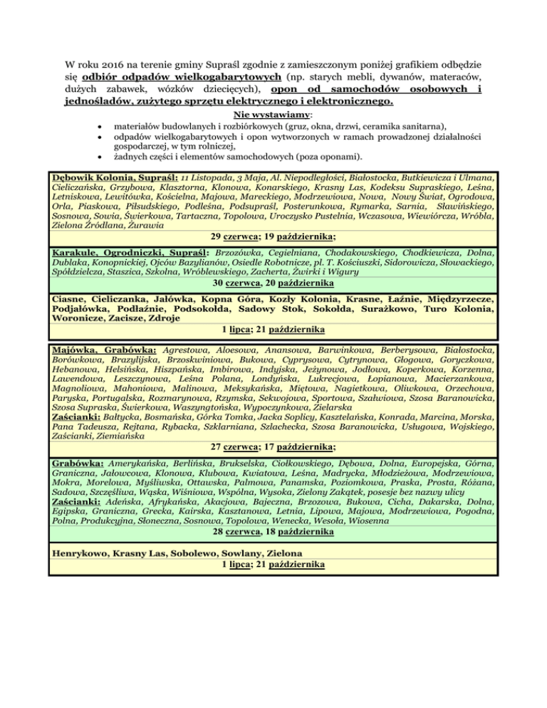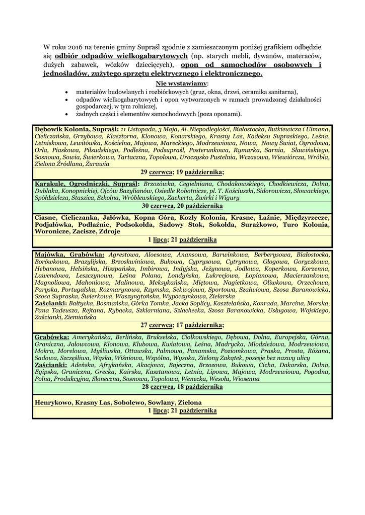 W roku 2016 na terenie gminy Supraśl zgodnie z zamieszczonym poniżej grafikiem odbędzie się odbiór odpadów wielkogabarytowych (np. starych mebli, dywanów, materaców, dużych zabawek, wózków dziecięcych), opon od samochodów osobowych i jednośladów, zużytego sprzętu elektrycznego i elektronicznego. Nie wystawiamy: materiałów budowlanych i rozbiórkowych (gruz, okna, drzwi, ceramika sanitarna), odpadów wielkogabarytowych i opon wytworzonych w ramach prowadzonej działalności gospodarczej, w tym rolniczej, żadnych części i elementów samochodowych (poza oponami). Dębowik Kolonia, Supraśl: 11 Listopada, 3 Maja, Al. Niepodległości, Białostocka, Butkiewicza i Ulmana, Cieliczańska, Grzybowa, Klasztorna, Klonowa, Konarskiego, Krasny Las, Kodeksu Supraskiego, Leśna, Letniskowa, Lewitówka, Kościelna, Majowa, Mareckiego, Modrzewiowa, Nowa, Nowy Świat, Ogrodowa, Orla, Piaskowa, Piłsudskiego, Podleśna, Podsupraśl, Posterunkowa, Rymarka, Sarnia, Sławińskiego, Sosnowa, Sowia, Świerkowa, Tartaczna, Topolowa, Uroczysko Pustelnia, Wczasowa, Wiewiórcza, Wróbla, Zielona Źródlana, Żurawia 29 czerwca; 19 października; Karakule, Ogrodniczki, Supraśl: Brzozówka, Cegielniana, Chodakowskiego, Chodkiewicza, Dolna, Dublaka, Konopnickiej, Ojców Bazylianów, Osiedle Robotnicze, pl. T. Kościuszki, Sidorowicza, Słowackiego, Spółdzielcza, Staszica, Szkolna, Wróblewskiego, Zacherta, Żwirki i Wigury 30 czerwca, 20 października Ciasne, Cieliczanka, Jałówka, Kopna Góra, Kozły Kolonia, Krasne, Łaźnie, Międzyrzecze, Podjałówka, Podłaźnie, Podsokołda, Sadowy Stok, Sokołda, Surażkowo, Turo Kolonia, Woronicze, Zacisze, Zdroje 1 lipca; 21 października Majówka, Grabówka: Agrestowa, Aloesowa, Anansowa, Barwinkowa, Berberysowa, Białostocka, Borówkowa, Brazylijska, Brzoskwiniowa, Bukowa, Cyprysowa, Cytrynowa, Głogowa, Goryczkowa, Hebanowa, Helsińska, Hiszpańska, Imbirowa, Indyjska, Jeżynowa, Jodłowa, Koperkowa, Korzenna, Lawendowa, Leszczynowa, Leśna Polana, Londyńska, Lukrecjowa, Łopianowa, Macierzankowa, Magnoliowa, Mahoniowa, Malinowa, Meksykańska, Miętowa, Nagietkowa, Oliwkowa, Orzechowa, Paryska, Portugalska, Rozmarynowa, Rzymska, Sekwojowa, Sportowa, Szałwiowa, Szosa Baranowicka, Szosa Supraska, Świerkowa, Waszyngtońska, Wypoczynkowa, Zielarska Zaścianki: Bałtycka, Bosmańska, Górka Tomka, Jacka Soplicy, Kasztelańska, Konrada, Marcina, Morska, Pana Tadeusza, Rejtana, Rybacka, Szklarniana, Szlachecka, Szosa Baranowicka, Usługowa, Wojskiego, Zaścianki, Ziemiańska 27 czerwca; 17 października; Grabówka: Amerykańska, Berlińska, Brukselska, Ciołkowskiego, Dębowa, Dolna, Europejska, Górna, Graniczna, Jałowcowa, Klonowa, Klubowa, Kwiatowa, Leśna, Madrycka, Młodzieżowa, Modrzewiowa, Mokra, Morelowa, Myśliwska, Ottawska, Palmowa, Panamska, Poziomkowa, Praska, Prosta, Różana, Sadowa, Szczęśliwa, Wąska, Wiśniowa, Wspólna, Wysoka, Zielony Zakątek, posesje bez nazwy ulicy Zaścianki: Adeńska, Afrykańska, Akacjowa, Bajeczna, Brzozowa, Bukowa, Cicha, Dakarska, Dolna, Egipska, Graniczna, Grecka, Kairska, Kasztanowa, Letnia, Lipowa, Majowa, Modrzewiowa, Pogodna, Polna, Produkcyjna, Słoneczna, Sosnowa, Topolowa, Wenecka, Wesoła, Wiosenna 28 czerwca, 18 października Henrykowo, Krasny Las, Sobolewo, Sowlany, Zielona 1 lipca; 21 października