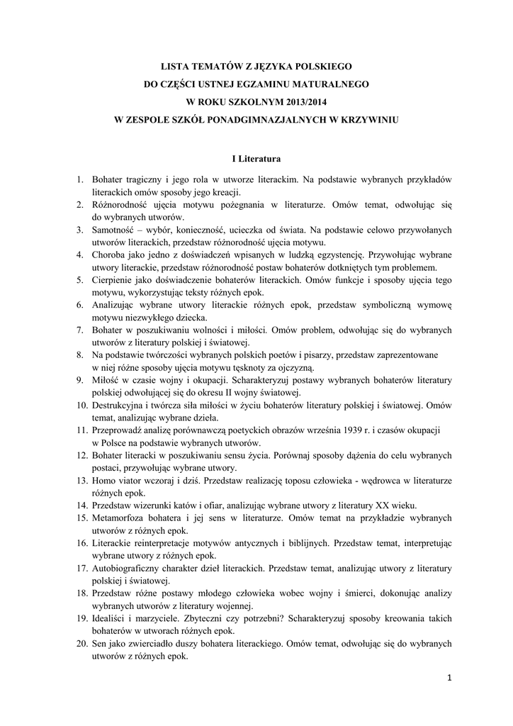 1 lista tematów z języka polskiego do części ustnej egzaminu