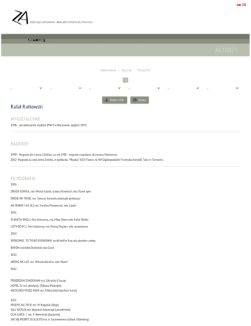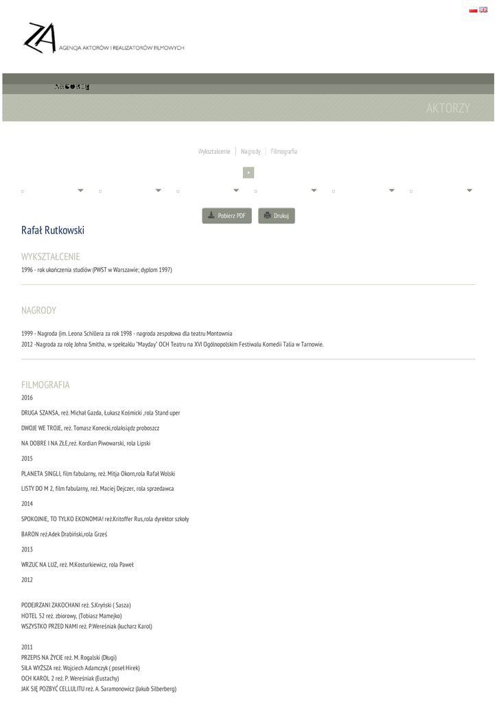 AKTORZY AKTORZY Pobierz PDF Drukuj Rafał Rutkowski WYKSZTAŁCENIE 1996 - rok ukończenia studiów (PWST w Warszawie; dyplom 1997) NAGRODY 1999 - Nagroda (im. Leona Schillera za rok 1998 - nagroda zespołowa dla teatru Montownia 2012 -Nagroda za rolę Johna Smitha, w spektaklu "Mayday" OCH Teatru na XVI Ogólnopolskim Festiwalu Komedii Talia w Tarnowie. FILMOGRAFIA 2016 DRUGA SZANSA, reż. Michał Gazda, Łukasz Kośmicki ,rola Stand uper DWOJE WE TROJE, reż. Tomasz Konecki,rolaksiądz proboszcz NA DOBRE I NA ZŁE,reż. Kordian Piwowarski, rola Lipski 2015 PLANETA SINGLI, film fabularny, reż. Mitja Okorn,rola Rafał Wolski LISTY DO M 2, film fabularny, reż. Maciej Dejczer, rola sprzedawca 2014 SPOKOJNIE, TO TYLKO EKONOMIA! reż.Kritoffer Rus,rola dyrektor szkoły BARON reż.Adek Drabiński,rola Grześ 2013 WRZUC NA LUZ, reż. M.Kosturkiewicz, rola Paweł 2012 PODEJRZANI ZAKOCHANI reż. S.Kryński ( Sasza) HOTEL 52 reż. zbiorowy, (Tobiasz Mamejko) WSZYSTKO PRZED NAMI reż. P.Wereśniak (kucharz Karol) 2011 PRZEPIS NA ŻYCIE reż. M. Rogalski (Długi) SIŁA WYŻSZA reż. Wojciech Adamczyk ( poseł Hirek) OCH KAROL 2 reż. P. Wereśniak (Eustachy) JAK SIĘ POZBYĆ CELLULITU reż. A. Saramonowicz (Jakub Silberberg) BYĆ JAK KAZIMIERZ DEYNA reż. A. Wieczur-Bluszcz (Ksiądz) 2010 DALEKO OD NOSZY reż. K. Jaroszyński (dr. Kraśnik) USTA USTA reż. B. Ignaciuk (Andrzej) 2009 DOM NAD ROZLEWISKIEM reż. Adek Drabiński (Wiktor) GRZESZNI I BOGACI rez. Maciej Kowalewski (Alfred, Manfred) 2008 FUNIO, SZEFUNIO I RESZTA ... CZYLI DZIECIAKI RATUJĄ ŚWIAT, reż. James Crowley (Kucharz Rolmops) NIECH ŻYJE POGRZEB!!!, reż Darek Błaszczyk, obsada aktorska, NIE KŁAM KOCHANIE, reż. Piotr Wereśniak (Igor, kolega Marcina), MAŁA WIELKA MIŁOŚĆ, reż. Łukasz Karwowski (urzędnik banku), LEJDIS, reż. Tomasz Konecki (Dariusz, przyjaciel Tomka), IDEALNY FACET DLA MOJEJ DZIEWCZYNY,Tomasz Konecki (ojciec Kajetan), 39 I PÓŁ , reż. Mitia Okorn, Łukasz Pałkowski (właściciel pizzerii), 2007 EKIPA, reż. Agnieszka Holland, Kasia Adamik, Borys Lankosz, Magdalena Łazarkiewicz (Jan Bater, minister skarbu), 2006 SZATAN Z 7 KLASY , reż. Kaimierz Tarnas (złodziej), OKAZJA, reż. Grzegorz Warchoł (komendant straży miejskiej), NIANIA, reż. Jerzy Bogajewicz (złodziej), DUBLERZY, reż. Marcin Ziębiński (pielęgniarz Wojtek), 2005-2006 TANGO Z ANIOŁEM , reż. Tomasz Konecki, Jarosław Marszewski (Jacek Kwiryński "Kwiryn", genetyk), 2005 KRYMINALNI (Tomasz Leyman, przyjaciel Siezierskiego), DZIKI 2. POJEDYNEK Obsada aktorska (agent Lolek), OFICER , reż. Maciej Dejczer (kelner; nie występuje w napisach), 2004 MĘSKIE - ŻEŃSKIE, reż. Krystyna Janda (fryzjer Paweł Kostrzewa), CAMERA CAFE , reż. Jerzy Bogajewicz, Wojciech Adamczyk (Dariusz Fijałkowski, doradca personalny; odcinek 13_2), 2003 CIAŁO, reż. Tomasz Korzecki, Andrzej Saramonowicz (komandos "Lalka"), 2000 PÓŁ SERIO, reż. Tomasz Korzecki 1997 POKÓJ 107, reż. Mirosław Dębiński 1994 BANK NIE Z TEJ ZIEMI Obsada aktorska (Julek Montecki), Teatr TV: 1999 BIGDA IDZIE!, Andrzej Wajda 1997 LEŚNE LICHO, reż. Cezary Morawski (Cień, Zwątpienie), KSIĘGA RAJU, reż. Robert Gliński (Celnik), DZIADY (1997), reż. Jan Eglert BAMBUKO, reż. Agnieszka Glińska (Absurd), 1995 IWANOW , reż. Jan Englert WYBRANE ROLE TEATRALNE: 2011 SEKS POLSKI reż. A. Krawczuk Teatr Montownia Warszawa 2010 WSZYSTKO, CO CHCIELIBYŚCIE WIEDZIEĆ O TEATRZE, A BOICIE SIĘ ZAPYTAĆ, reż. zespół Teatr Montownia Warszawa JESZCZE BĘDZIE PRZEPIĘKNIE reż. Przemysław Wojcieszek, (Mariusz) Teatr Polonia Warszawa KUBUŚ FATALISTA I JEGO PAN, reż. K. Stelmaszyk Teatr Montownia Warszawa 2009 OJCIEC POLSKI, reż. Michał Walczak Teatr Polonia Warszawa KRZYSZTOF M. HIPNOZA, reż. Krzysztof Materna Teatr Polonia Warszawa EDMOND, rez. K. Stelmaszyk (Mężczyzna w barze, obserwator, menadżer burdelu, mężczyzna w lombardzie, recepcjonista, kaznodzieja, przesłuchujący, kapelan więzienia) Teatr Montownia Warszawa SIOSTRY PRZYTULANKI reż. G. Castellanos (Brat Benedykt – bibliotekarz) Teatr na Woli Warszawa 2008 BÓG, reż. K. Janda, (Idiotos; Bóg) Teatr Polonia Warszawa TO NIE JEST KRAJ DLA WIELKICH LUDZI, rez. Michał Walczak Teatr Montownia Warszawa UTWÓR SENTYMENTALNY NA CZTERECH AKTORÓW, rez. Piotr Cieplak Teatr Montownia Warszawa 2007 KAMIENIE W KIESZENIACH, rez. K. Stelmaszyk Teatr Montownia Warszawa 2006 WOJNA NA TRZECIM PIĘTRZE, rez. P. Aigner Teatr Montownia Warszawa LOVV, reż. M. Pasieczny , (Abel) Teatr Montownia Warszawa 2005 PEER GYNT , rez. M. Pasieczny Teatr Montownia Warszawa 2004 SMUTNA KRÓLEWNA, rez. P. Aigner (Błazen) Teatr Montownia Warszawa 2003 HISTORIA O NARODZENIU PANA JEZUSA NA DWORCU CENTRALNYM rez. P. Cieplak Teatr Montownia Warszawa 2002 TESTOSTERON, rez. A. Glińska, (Kornel) Teatr Montownia Warszawa 2001 MCQICHOTE, reż. P. Ziniewicz, (Don Kiszot) Teatr Montownia Warszawa 2000 O MÓJ TATO, BIEDNY TATO, ... reż. A. Krawczuk, (Pani Różomilska) Teatr Studio Warszawa TRANSATLANTYK, reż. W. Śmigasiewicz, (Major Tomasz Kobrzycki) Teatr Montownia Warszawa 1999 HISTORIA O RAJU UTRACONYM, CZYLI... BĘDZIE LEPIEJ reż. P. Cieplak Teatr Montownia Warszawa PO NASZEMU, reż. Montownia, (Patryk Patalan) Teatr Powszechny im. Zygmunta Hübnera 1998 NIEDOCZYSTE reż. J. Gajewski , (Rafael Rutek) Teatr Powszechny Warszawa WSPÓLNY POKÓJ reż. W. Śmigasiewicz (Lucjan Salis) Teatr Studio Warszawa 1997 ŚPIEW NOCY LETNIEJ reż. M. Wojtyszko Teatr Montownia Warszawa ŚLEBODA reż. W. Śmigasiewicz, (Bronek Wałęcka) Teatr Powszechny Warszawa ZDOBYCIE BIEGUNA POŁUDNIOWEGO reż. C. Morawski , (Seifert, zwany Łosiem z Herne) Teatr Powszechny Warszawa 1996 SKARB reż. S. Tym (Człowiek) Teatr Powszechny Warszawa ZABAWA, reż. A. Warchulska (Parobek )B Teatr Powszechny Warszawa SZELMOSTWA SKAPENA, reż. zespół, (Geront, Oktaw) Teatr Powszechny Warszawa 1995 KABARET MODERNISTYCZNY, reż. W. Komasa PWST Warszawa CYD, reż. Z. Kucówna (Don Fer