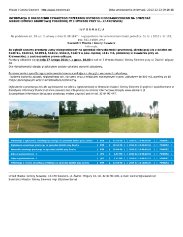 Miasto i Gmina Siewierz - http://www.siewierz.pl/ Data umieszczenia informacji: 2013-12-23 09:10:38 INFORMACJA O OGŁOSZENIU CZWARTEGO PRZETARGU USTNEGO NIEOGRANICZONEGO NA SPRZEDAŻ NIERUCHOMOŚCI GRUNTOWEJ POŁOŻONEJ W SIEWIERZU PRZY UL. KRAKOWSKIEJ INFORMACJA Na podstawie art. 38 ust. 2 ustawy z dnia 21.08.1997 r. o gospodarce nieruchomościami (tekst jednolity: Dz. U. z 2010 r. Nr 102, poz. 651 z późn. zm.) Burmistrz Miasta i Gminy Siewierz informuje, że ogłosił czwarty przetarg ustny nieograniczony na sprzedaż nieruchomości gruntowej, składającej się z działek nr: 5539/11, 5539/12, 5539/13, 5541/2, 5542/2, 5543/2 o pow. łącznej 1811 m2, położonej w Siewierzu przy ul. Krakowskiej, z zastrzeżeniem prawa odkupu. Przetarg odbędzie się w dniu 27 lutego 2014 r. o godz. 10.00 w sali nr 2 Urzędu Miasta i Gminy Siewierz przy ul. Żwirki i Wigury 16. Dla nieruchomości objętej przetargiem zostały ustalone warunki zabudowy. Przeznaczenie i sposób zagospodarowania terenu wynikające z decyzji o warunkach zabudowy: - budowa budynku zajazdu regionalnego tzn. karczmy wraz z miejscami noclegowymi o pow. zabudowy do 500 m2, parking do 15 miejsc parkingowych wraz z infrastrukturą techniczną. Ogłoszenie o przetargu zostało wywieszone na tablicy ogłoszeniowej w Urzędzie Miasta i Gminy Siewierz (II piętro) i opublikowane w Biuletynie Informacji Publicznej www.siewierz.bip.info.pl oraz na stronie internetowej Urzędu www.siewierz.pl Szczegółowe informacje dotyczące przetargu można uzyskać pod nr tel. 32 64 99 447. Informacja o ogłoszeniu czwartego przetargu na sprzedaż działki przy Zamku [ PDF ] [ 83.45 KB ] [ 2013-12-23 09:19:06 ] [ POBIERZ ] Ogłoszenie czwartego przetargu na sprzedaż działki przy Zamku [ PDF ] [ 96.56 KB ] [ 2013-12-23 09:19:16 ] [ POBIERZ ] Warunki czwartego przetargu na sprzedaż działki przy Zamku [ PDF ] [ 79.00 KB ] [ 2013-12-23 09:19:25 ] [ POBIERZ ] Zdjęcie panoramiczne - 1 [ JPG ] [ 2.93 MB ] [ 2013-12-23 09:20:59 ] [ POBIERZ ] Zdjęcie panoramiczne - 2 [ JPG ] [ 2.12 MB ] [ 2013-12-23 09:21:23 ] [ POBIERZ ] Informacja o wyniku czwartego przetargu na sprzedaż działek przy Zamku [ PDF ] [ 63.68 KB ] [ 2014-03-10 10:56:36 ] [ POBIERZ ] Urząd Miasta i Gminy Siewierz, 42-470 Siewierz, ul. Żwirki i WIgury 16, tel. 32 64 99 400, e-mail: [email protected] Burmistrz Miasta i Gminy Siewierz mgr Zdzisław Banaś