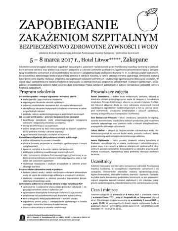 ZAPOBIEGANIE ZAKAŻENIOM SZPITALNYM BEZPIECZEŃSTWO ZDROWOTNE ŻYWNOŚCI I WODY szkolenie dla kadry kierowniczej jednostek Państwowej Inspekcji Sanitarnej i podmiotów leczniczych 5 – 8 marca 2017 r., Hotel Litwor*****, Zakopane Szkoleniestanowi przegląd aktualnych zagadnień związanych z zadaniami realizowanymi przez Państwową Inspekcję Sanitarną w jednostkach ochronie zdrowia oraz prezentację nowych przepisów w zakresie zamówień publicznych.Zagadnienia prezentowane będą z perspektywy inspektorów sanitarnych a także podmiotów leczniczych i uwzględniać będą praktyczne działania m. in. w zakresiezakażeń szpitalnych, bezpieczeństwa zdrowotnego wody oraz promocji zdrowia w zakresie żywienia, w tym w zakresie żywienia szpitalnego. Omówione zostaną także praktyczne aspekty realizacji programu obowiązkowych szczepień ochronnych i skutecznego egzekwowania obowiązku szczepień. W czasie zajęć zaprezentowane zostaną modelowe rozwiązania w zakresie realizacji programów zdrowotnych i kampanii społecznych. Szczegółowo przedstawiona zostanie także ostatnia duża nowelizacja Prawa zamówień publicznych w optyce kierowników jednostek sektora finansów publicznych. Program szkolenia Prowadzący zajęcia Zakażenia szpitalne - rosnące zagrożenie i wyzwania dla PIS • skala zjawiska i jego struktura i dynamika • zapobieganie i kontrola zakażeń szpitalnych • ochrona antybiotyków i wyzwania dot. szczepów lekoopornych • identyfikacja obszarów krytycznych i działanie systemowe w zakresie profilaktyki zakażeń • praktyka nadzoru epidemiologicznego w podmiotach leczniczych Jak szczepić w XXI wieku – priorytet bezpieczeństwo szczepień • kwalifikacje zawodowe osób przeprowadzających szczepienia ochronne i bezpieczna procedura szczepienia • dostęp do informacji o szczepieniach • wpływ zwiększenia się ilości nieszczepionych na stopień zapadalności na wybrane choroby i zdrowie populacji • egzekwowanie obowiązku szczepień ochronnych Prawidłowe odżywienie jako podstawa zdrowia publicznego • wpływ odżywania na zdrowie człowieka • dieta w leczeniu pacjentów w chorobach cywilizacyjnych i innych dolegliwościach • żywienie szpitalne w leczeniu i opiece nad pacjentem • praktyczne problemy prawidłowego żywienia chorych • rola i instrumenty działania Państwowej Inspekcji Sanitarnej w zakresie promocji zdrowia w obszarze zdrowego żywienia oraz w nadzorze nad żywieniem szpitalnym • modelowe rozwiązania i studium przypadków w zakresie prawidłowego żywienia Bezpieczeństwo zdrowotne wody w praktyce • badanie jakości wody i nadzór nad bezpieczeństwem zdrowotnym wody od ujęcia do ostatecznego odbiorcy w przepisach i praktyce • skuteczne rozwiązania w zakresie procedur zapewnienia bezpieczeństwa zdrowotnego wody Zamówienia publiczne w ochronie zdrowia wobec nowelizacji PZP • uproszczenie i zwiększenie elastyczności procedur zamówień – negocjacje warunków umów z wykonawcami • ograniczenie obowiązków formalnych i informatyzacja procesu • zwiększenie roli pozaekonomicznych kryteriów wyboru oferty • konkurencyjność mniejszych oferentów – warunki udziału • zagadnienia prawa pracy i zabezpieczenia społecznego w świetle wymagań i kryteriów stawianych wykonawcom • dopuszczalne zmiany w umowie z wykonawcą Paweł Grzesiowski – doktor nauk medycznych, pediatra, ekspert w dziedzinie zdrowia publicznego przez wiele lat związany z Narodowym Instytutem Zdrowia Publicznego, obecnie w ramach Instytutu Profilaktyki Zakażeń aktywnie działa na rzecz wdrażania skutecznych metod zapobiegania zagrożeniom epidemiologicznym w tym w zakresie szczepień ochronnych, stosowania antybiotyków i zakażeń szpitalnych, ceniony prelegent licznych sympozjów i konferencji. Centrum Edukacji Menedżerskiej Promotor 61-512 Poznań, ul. Pamiątkowa 2/8, tel. +48 61 855 23 14, fax +48 61 224 51 63 e-mail [email protected], www.promotor.poznan.pl Ewa Bednarczyk-Witoszek – lekarz medycyny, specjalista laryngolog, autorka bestselerowej książki Dieta dobrych produktów, jest ekspertem żywienia optymalnego oraz żywienia osób z różnymi dolegliwościami, propagatorka zdrowego odżywiania. Łukasz Weber – ekspert ds. bezpieczeństwa zdrowotnego wody, doświadczony praktyk w zakresie badań wody, procedur nadzoru i zarządzania jakością wody od ujęcia do ostatecznego odbiorcy. Iwona Piątkowska – radca prawny, prowadzi własną kancelarię w Krakowie, specjalizuje się w prawie medycznym i administracyjnym, prawie pracy i przepisach w zakresie ubezpieczeń społecznych i zdrowotnych; posiada wieloletnie doświadczenie w obsłudze prawnej podmiotów leczniczych, reprezentuje także podmioty tworzące podmioty lecznicze. Uczestnicy Szkolenie kierowane jest do kadry kierowniczej jednostek Państwowej Inspekcji Sanitarnej, w szczególności inspektorów sanitarnych i ich zastępców, kierowników oddziałów nadzoru epidemiologicznego, higieny komunalnej, oddziałów nadzoru żywności i żywienia. Zapraszamy także kadrę kierowniczą podmiotów leczniczych, w tym przewodniczących zespołów kontroli zakażeń szpitalnych i ich członków, pielęgniarki epidemiologiczne, intendentóworaz inne zainteresowane osoby. Czas i miejsce Szkolenie odbędzie się w dniach 5 – 8 marca 2017 r. (niedziela – środa ), w Hotelu Litwor*****, przy ul. Krupówki 40, w Zakopanem (dojazd od ul. Piłsudskiego). Zajęcia rozpoczną się w niedzielę, 5 marca 2017 r., o godz. 15:00. W poszczególnych dniach zajęcia realizowane będą w godzinach: dzień I – od 15:00 do 18:30, dzień II i III – od 10:00 do 16:00 oraz dzień IV – od 9:00 do 13:00. ZAPOBIEGANIE ZAKAŻENIOM SZPITALNYM BEZPIECZEŃSTWO ZDROWOTNE ŻYWNOŚCI I WODY Warunki udziału Cena uczestnictwa jednej osoby w szkoleniu wynosi 1 390,- zł netto*. Cena obejmuje udział w zajęciach i warsztatach, materiały szkoleniowe,książkę Dieta dobrych prod