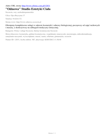 Adres URL strony http://www.efirmy.com.pl/12831 "Odnowa" Studio Estetyki Ciała Szczecin, woj. zachodniopomorskie Ulica: Ojca Beyzyma 17 Telefon: 914241172 Strona www: http://www.odnowa.szczecin.pl Oferujemy kompleksowe usługi w zakresie kosmetyki i odnowy biologicznej, począwszy od zajęć ruchowych i masaży, a skończywszy na zabiegach medycyny estetycznej. Kategorie: Firmy i usługi Szczecin, Salony kosmetyczne Szczecin Słowa kluczowe: kosmetyka, gabinet kosmetyczny, wypełnianie zmarszczek, mezoterapia, mikrodermabrazja, zamykanie naczynek, wyszczuplanie, masaż, sauna, solarium, gimnastyka, szczecin Numer ID: 12831, liczba odsłon: 307, aktywacja: 02/03/2012 11:30:48 Strona 1 / 1