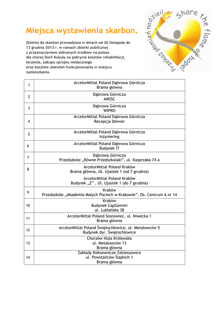 Miejsca wystawienia skarbon. Zbiórka do skarbon prowadzona w dniach od 26 listopada do 13 grudnia 2013 r. w ramach zbiórki publicznej z przeznaczeniem zebranych środków na pomoc dla chorej Darii Kukuły na pokrycie kosztów rehabilitacji, leczenia, zakupu sprzętu medycznego oraz kosztów ułatwień funkcjonowania w miejscu zamieszkania. 1. 1 ArcelorMittal Poland Dąbrowa Górnicza Brama główna 2. 2 Dąbrowa Górnicza AMSSC 3. 3 4. 4 Dąbrowa Górnicza WIPRO ArcelorMittal Poland Dąbrowa Górnicza Recepcja Denver 5. 5 ArcelorMittal Poland Dąbrowa Górnicza Inżyniering 6 ArcelorMittal Poland Dąbrowa Górnicza Budynek IT 7 Dąbrowa Górnicza Przedszkole „Równe Przedszkolaki”, ul. Kasprzaka 74 a 8 ArcelorMittal Poland Kraków Brama główna, Ul. Ujastek 1 (od 7 grudnia) ArcelorMittal Poland Kraków Budynek „Z” , Ul. Ujastek 1 (do 7 grudnia) 10. 9 11. 10 12. 11 13. 12 14. 13 15. 14 Kraków Przedszkole „Akademia Małych Pociech w Krakowie”, Os. Centrum A nr 14 Kraków Budynek CapGemini ul. Lublańska 38 ArcelorMittal Poland Sosnowiec, ul. Niwecka 1 Brama główna ArcelorMittal Poland Świętochłowice, ul. Metalowców 5 Budynek dyr. Świętochłowice Chorzów Huta Królewska ul. Metalowców 13 Brama główna Zakłady Koksownicze Zdzieszowice ul. Powstańców Śląskich 1 Brama główna
