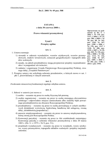 ©Kancelaria Sejmu s. 1/99 Dz.U. 2001 Nr 49 poz. 508 USTAWA z dnia 30 czerwca 2000 r. Prawo własności przemysłowej Tytuł I Przepisy ogólne Art. 1. 1. Ustawa normuje: 1) stosunki w zakresie wynalazków, wzorów użytkowych, wzorów przemysłowych, znaków towarowych, oznaczeń geograficznych i topografii układów scalonych; 2) zasady, na jakich przedsiębiorcy mogą przyjmować projekty racjonalizatorskie i wynagradzać ich twórców; 3) zadania i organizację Urzędu Patentowego Rzeczypospolitej Polskiej, zwanego dalej „Urzędem Patentowym”. 2. Przepisy ustawy nie uchybiają ochronie przedmiotów, o których mowa w ust. 1 pkt 1, przewidzianej w innych ustawach. Art. 2. Zwalczanie nieuczciwej konkurencji reguluje odrębna ustawa. Art. 3. 1. Ilekroć w ustawie jest mowa o: 1) osobie – rozumie się przez to osobę fizyczną lub prawną; 2) osobie zagranicznej – rozumie się przez to osobę niemającą obywatelstwa polskiego i odpowiednio miejsca zamieszkania albo siedziby bądź poważnego przedsiębiorstwa na obszarze Rzeczypospolitej Polskiej; 3) przedsiębiorcy – rozumie się przez to osobę prowadzącą w celach zarobkowych działalność wytwórczą, budowlaną, handlową lub usługową, zwaną dalej „działalnością gospodarczą”; 4) umowie międzynarodowej – rozumie się przez to umowę międzynarodową, której stroną jest Rzeczpospolita Polska; 5) Konwencji paryskiej – rozumie się przez to Akt sztokholmski zmieniający Konwencję paryską o ochronie własności przemysłowej z dnia 20 marca 1883 r. (Dz. U. z 1975 r. Nr 9, poz. 51); 6) projektach wynalazczych – rozumie się przez to wynalazki, wzory użytkowe, wzory przemysłowe, topografie układów scalonych i projekty racjonalizatorskie. 2013-02-06 Opracowano na podstawie: tj. Dz. U. z 2003 r. Nr 119, poz. 1117, z 2004 r. Nr 33, poz. 286, z 2005 r. Nr 10, poz. 68, Nr 163, poz. 1362, Nr 167, poz. 1398, z 2006 r. Nr 170, poz. 1217 i 1218, Nr 208, poz. 1539, z 2007 r. Nr 99, poz. 662, Nr 136, poz. 958, z 2008 r. Nr 180, poz. 1113, Nr 216, poz. 1368, Nr 227, poz. 1505, z 2010 r. Nr 182, poz. 1228, z 2012 r. poz. 1544. ©Kancelaria Sejmu s. 2/99 7) Biurze Międzynarodowym – rozumie się przez to Międzynarodowe Biuro Własności Intelektualnej utworzone na podstawie Konwencji o ustanowieniu Światowej Organizacji Własności Intelektualnej z dnia 14 lipca 1967 r. (Dz. U. z 1975 r. Nr 9, poz. 49); 8) międzynarodowym znaku towarowym – rozumie się przez to znak towarowy zarejestrowany w trybie określonym w Porozumieniu lub Protokole; 9) Porozumieniu – rozumie się przez to Porozumienie madryckie o międzynarodowej rejestracji znaków z dnia 14 kwietnia 1891 r. (Dz. U. z 1993 r. Nr 116, poz. 514 i 515); 10) Protokole – rozumie się przez to Protokół do Porozumienia madryckiego o międzynarodowej rejestracji znaków z dnia 27 czerwca 1989 r. (Dz. U. z 2003 r. Nr 13, poz. 129 i 130); 11) Konwencji o patencie europejskim – rozumie się przez to Konwencję o udzielaniu patentów europejskich z dnia 5 października 1973 r. zmienioną aktem zmieniającym artykuł 63 Konwencji z dnia 17 grudnia 1991 r. oraz decyzjami Rady Administracyjnej Europejskiej Organizacji Patentowej z dnia 21 grudnia 1978 r., 13 grudnia 1994 r., 20 października 1995 r., 5 grudnia 1996 r. oraz 10 grudnia 1998 r., wraz z Protokołami stanowiącymi jej integralną część (Dz. U. z 2004 r. Nr 79, poz. 737 i 738). 2. Przepisy ustawy dotyczące przedsiębiorców stosuje się odpowiednio również do osób prowadzących działalność inną niż gospodarcza, a także do jednostek organizacyjnych niemających osobowości prawnej. Art. 4. 1. Jeżeli umowa międzynarodowa lub przepisy prawa Unii Europejskiej obowiązujące bezpośrednio w krajach członkowskich określają szczególny tryb udzielania ochrony na wynalazki, wzory użytkowe, wzory przemysłowe, znaki towarowe, oznaczenia geograficzne lub topografie układów scalonych, w sprawach nieuregulowanych w tej umowie lub w tych przepisach albo pozostawionych w kompetencji organów krajowych przepisy ustawy stosuje się odpowiednio. 2. Umowa międzynarodowa lub przepisy, o których mowa w ust. 1, rozstrzygają w szczególności o tym, w jakim języku prowadzone jest postępowanie związane z udzielaniem ochrony i w jakim języku powinna być sporządzona dokumentacja zgłoszeń wynalazków, wzorów użytkowych, wzorów przemysłowych, znaków towarowych, oznaczeń geograficznych i topografii układów scalonych. Art. 5. 1. Osoby zagraniczne korzystają z uprawnień wynikających z ustawy na podstawie umów międzynarodowych. 2. Osoby zagraniczne mogą, jeżeli nie narusza to postanowień umów międzynarodowych, korzystać z uprawnień wynikających z ustawy na zasadzie wzajemności. Przesłanki wzajemności, dla celów postępowania przed Urzędem Patentowym, stwierdza – po zasięgnięciu opinii właściwego ministra – Prezes Urzędu Patentowego. Art. 6. 1. Na warunkach określonych w ustawie udzielane są patenty oraz dodatkowe prawa ochronne na wynalazki, prawa ochronne na wzory użytkowe i znaki towaro- 2013-02-06 ©Kancelaria Sejmu s. 3/99 we, a także prawa z rejestracji na wzory przemysłowe, topografie układów scalonych oraz oznaczenia geograficzne. 2. W sprawach, o których mowa w ust. 1, właściwy jest Urząd Patentowy. Art. 7. 1. Przedsiębiorcy mogą przewidzieć przyjmowanie projektów racjonalizatorskich na warunkach określonych w ustalanym przez siebie regulaminie racjonalizacji. 2. Przedsiębiorca może uznać za projekt racjonalizatorski, w rozumieniu ustawy, każde rozwiązanie nadające się do wykorzystania, niebędące wynalazkiem podlegającym opatentowaniu, wzorem użytkowym, wzorem przemysłowym lub topografią układu scalonego. 3. W regulaminie, o którym mowa w ust. 1, przedsiębiorca określa co najmniej, jakie rozwiązania i przez kogo dokonane uznaje się w przedsiębiorstwie za projekty racjonalizatorskie, a także sposób załatwiania zgło