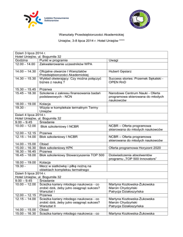 Warsztaty Przedsiębiorczości Akademickiej Uniejów, 3-8 lipca 2014 r. Hotel Uniejów **** Dzień 3 lipca 2014 r. Hotel Uniejów, ul. Bogumiła 32 Godzina Punkt w programie 12.00 - 14.00 Zakwaterowanie uczestników WPA 14.00 – 14.30 14.30 – 15.30 15.30 – 15.45 15.45 – 18.30 Oficjalne otwarcie I Warsztatów Przedsiębiorczości Akademickiej Wykład otwierający: Czy można połączyć biznes z nauką ? Przerwa Szkolenie z zakresu finansowania badań podstawowych - NCN Uwagi Hubert Gęsiarz Success stories: Przemek Sękalski OPEN RnD Narodowe Centrum Nauki - Oferta programowa skierowana do młodych naukowców 18.00 – 19.00 19.30 - Kolacja Wizyta w kompleksie termalnym Termy Uniejów Dzień 4 lipca 2014 r. Hotel Uniejów, ul. Bogumiła 32 9.00 – 9.45 Śniadanie 10.00 – 12.00 Blok szkoleniowy I NCBR 12.00 – 12.15 12.15 – 14.00 Przerwa Blok szkoleniowy I NCBR 14.00 – 15.00 15.00 – 16.30 16.30 – 16.45 16.45 – 18.00 Obiad Blok szkoleniowy KPK Przerwa Blok szkoleniowy Stowarzyszenia TOP 500 NCBR – Oferta programowa skierowana do młodych naukowców NCBR – Oferta programowa skierowana do młodych naukowców Oferta programowa Horyzont 2020 Doświadczenia absolwentów programu „TOP 500 Innovators” 18.00 – 19.00 19.30 - Kolacja Mecz w siatkówkę i piłkę nożną na obiektach kompleksu termalnego Dzień 5 lipca 2014 r. Hotel Uniejów, ul. Bogumiła 32 9.00 – 9.45 Śniadanie 10.00 – 12.00 Ścieżka kariery młodego naukowca - co zrobić dziś, żeby jutro osiągnąć sukces? Warsztat I 12.00 – 12.15 Przerwa 12.15 – 14.00 Ścieżka kariery młodego naukowca - co zrobić dziś, żeby jutro osiągnąć sukces? Warsztat II 14.00 – 15.00 Obiad 15.00 – 16.30 Ścieżka kariery młodego naukowca - co Martyna Kozłowska-Żukowska Marcin Chydzyński Patrycja Działoszyńska Martyna Kozłowska-Żukowska Marcin Chydzyński Patrycja Działoszyńska Martyna Kozłowska-Żukowska zrobić dziś, żeby jutro osiągnąć sukces? Warsztat III 16.30 – 16.45 Przerwa 16.45 – 18.00 Ścieżka kariery młodego naukowca - co zrobić dziś, żeby jutro osiągnąć sukces? Warsztat IV 18.00 – 19.00 Kolacja 19.30 Ognisko nad Wartą Dzień 6 lipca 2014 r. Hotel Uniejów, ul. Bogumiła 32 9.00 – 9.45 Śniadanie 10.00 – 12.00 Najlepsze wyniki badań to te, o których umiem opowiedzieć – sekrety prezentacji naukowych. Warsztat I 12.00 – 12.15 Przerwa 12.15 – 14.00 Najlepsze wyniki badań to te, o których umiem opowiedzieć – sekrety prezentacji naukowych. Warsztat II 14.00 – 15.00 Obiad 15.00 – 16.30 Najlepsze wyniki badań to te, o których umiem opowiedzieć – sekrety prezentacji naukowych. Warsztat III 16.30 – 16.45 Przerwa 16.45 – 18.00 Najlepsze wyniki badań to te, o których umiem opowiedzieć – sekrety prezentacji naukowych. Warsztat IV 18.00 – 19.00 Kolacja 19.30 Nautilus Club Dzień 7 lipca 2014 r. Hotel Uniejów, ul. Bogumiła 32 9.00 – 9.45 Śniadanie 10.00 – 12.00 Dzień realizowany ze współpracy z Departamentem Przedsiębiorczości Urzędu Marszałkowskiego Województwa Łódzkiego Relacje biznes nauka na przykładzie branż kluczowych regionu łódzkiego zgodnie ze strategią LORIS 12.00 – 12.15 12.15 – 14.00 Przerwa Biznes – nauka – ograniczenia i bariery. 14.00 – 15.00 Obiad Marcin Chydzyński Patrycja Działoszyńska Martyna Kozłowska-Żukowska Marcin Chydzyński Patrycja Działoszyńska Martyna Kozłowska-Żukowska Marcin Chydzyński Patrycja Działoszyńska Martyna Kozłowska-Żukowska Marcin Chydzyński Patrycja Działoszyńska Martyna Kozłowska-Żukowska Marcin Chydzyński Patrycja Działoszyńska Martyna Kozłowska-Żukowska Marcin Chydzyński Patrycja Działoszyńska Martyna Kozłowska-Żukowska Marcin Chydzyński Patrycja Działoszyńska Poza grupą WPA udział bierze ok. 10 przedsiębiorców z obszarów: medycyna, farmacja, kosmetologia. (Odwołanie do dziedzin strategii LORIS) . Martyna Kozłowska-Żukowska Marcin Chydzyński Patrycja Działoszyńska 15.00 – 16.30 16.30 – 16.45 16.45 – 18.00 Biznes – nauka – sposoby wykształcenia mechanizmów współpracy Przerwa Komercjalizacja wyników badań oraz zlecanie badań na uczelniach – prezentacja wyników prac oraz dyskusja. 18.00 – 19.00 Kolacja 19.30 Wizyta w kompleksie termalnym Termy Uniejów Dzień 8 lipca 2014 r. Hotel Uniejów, ul. Bogumiła 32 9.00 – 9.45 Śniadanie 10.00 – 14.00 Spływ kajakowy – zawody sportowe 14.00 – 15.00 Uroczysty obiad, zakończenie Warsztatów Przedsiębiorczości Akademickiej i rozdanie certyfikatów ukończenia kursu 15.00 – Wykwaterowanie Martyna Kozłowska-Żukowska Marcin Chydzyński Patrycja Działoszyńska Martyna Kozłowska-Żukowska Marcin Chydzyński Patrycja Działoszyńska VATTENBALL Władze uczelni, zaproszeni goście