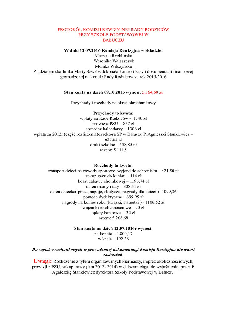 PROTOKÓŁ KOMISJI REWIZYJNEJ RADY RODZICÓW PRZY SZKOLE PODSTAWOWEJ W BAŁUCZU W dniu 12.07.2016 Komisja Rewizyjna w składzie: Marzena Rychlińska Weronika Walaszczyk Monika Wilczyńska Z udziałem skarbnika Marty Szwebs dokonała kontroli kasy i dokumentacji finansowej gromadzonej na koncie Rady Rodziców za rok 2015/2016 Stan konta na dzień 09.10.2015 wynosi: 5,164,60 zł Przychody i rozchody za okres obrachunkowy Przychody to kwota: wpłaty na Rade Rodziców - 1740 zł prowizja PZU - 867 zł sprzedaż kalendarzy – 1308 zł wpłata za 2012r (część rozliczenia)dyrektora SP w Bałuczu P. Agnieszki Stankiewicz – 637,65 zł druki szkolne – 558,85 zł razem: 5.111,5 Rozchody to kwota: transport dzieci na zawody sportowe, wyjazd do schroniska – 421,50 zł zakup gazu do kuchni – 114 zł koszt zabawy choinkowej – 1196,74 zł dzień mamy i taty – 308,51 zł dzień dziecka( pizza, napoje, słodycze, nagrody dla dzieci )- 1099,36 pomoce dydaktyczne – 899,95 zł nagrody na koniec roku (książki, statuetki ) - 1106,62 zł wiązanki okolicznościowe – 90 zł opłaty bankowe – 32 zł razem: 5.268,68 Stan konta na dzień 12.07.2016r wynosi: na koncie – 4.809,17 w kasie – 192,38 Do zapisów rachunkowych w prowadzonej dokumentacji Komisja Rewizyjna nie wnosi zastrzeżeń. Uwagi: Rozliczenie z tytułu organizowanych kiermaszy, imprez okolicznościowych, prowizji z PZU, zakup trawy (lata 2012- 2014) w dalszym ciągu do wyjaśnienia, przez P. Agnieszkę Stankiewicz dyrektora Szkoły Podstawowej w Bałuczu.