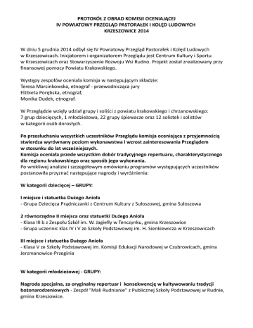 PROTOKÓŁ Z OBRAD KOMISJI OCENIAJĄCEJ IV POWIATOWY PRZEGLĄD PASTORAŁEK I KOLĘD LUDOWYCH KRZESZOWICE 2014 W dniu 5 grudnia 2014 odbył się IV Powiatowy Przegląd Pastorałek i Kolęd Ludowych w Krzeszowicach. Inicjatorem i organizatorem Przeglądu jest Centrum Kultury i Sportu w Krzeszowicach oraz Stowarzyszenie Rozwoju Wsi Rudno. Projekt został zrealizowany przy finansowej pomocy Powiatu Krakowskiego. Występy zespołów oceniała komisja w następującym składzie: Teresa Marcinkowska, etnograf - przewodnicząca jury Elżbieta Porębska, etnograf, Monika Dudek, etnograf. W Przeglądzie wzięły udział grupy i soliści z powiatu krakowskiego i chrzanowskiego: 7 grup dziecięcych, 1 młodzieżowa, 22 grupy śpiewacze oraz 12 solistek i solistów w kategorii osób dorosłych. Po przesłuchaniu wszystkich uczestników Przeglądu komisja oceniająca z przyjemnością stwierdza wyrównany poziom wykonawstwa i wzrost zainteresowania Przeglądem w stosunku do lat wcześniejszych. Komisja oceniała przede wszystkim dobór tradycyjnego repertuaru, charakterystycznego dla regionu krakowskiego oraz sposób jego wykonania. Po wnikliwej analizie i szczegółowym omówieniu programów występujących uczestników postanowiła przyznać następujące nagrody i wyróżnienia: W kategorii dziecięcej – GRUPY: I miejsce i statuetka Dużego Anioła - Grupa Dziecięca Prądniczanki z Centrum Kultury z Sułoszowej, gmina Sułoszowa 2 równorzędne II miejsca oraz statuetki Dużego Anioła - Klasa III b z Zespołu Szkół im. W. Jagiełły w Tenczynku, gmina Krzeszowice - Grupa uczennic klas IV i V ze Szkoły Podstawowej im. H. Sienkiewicza w Krzeszowicach III miejsce i statuetka Dużego Anioła - Klasa V ze Szkoły Podstawowej im. Komisji Edukacji Narodowej w Czubrowicach, gmina Jerzmanowice-Przeginia W kategorii młodzieżowej - GRUPY: Nagroda specjalna, za oryginalny repertuar i konsekwencję w kultywowaniu tradycji bożonarodzeniowych - Zespół "Mali Rudnianie" z Publicznej Szkoły Podstawowej w Rudnie, gmina Krzeszowice. W kategorii dorośli – GRUPY: Komisja oceniająca po raz pierwszy przyznała nagrodę główną dla najlepszej grupy śpiewaczej Przeglądu. Nagroda główna, statuetka Dużego Anioła oraz nagroda finansowa w kwocie 300 zł - Zespół Bolęcanie, grupa męska, gmina Chrzanów 4 równorzędne I miejsca, nagrody finansowe w kwocie po 250 zł i statuetki Dużego Anioła: - Zespół Bolęcanki z Bolęcina, gmina Chrzanów - Koło Gospodyń Wiejskich z Czubrowic, gmina Jerzmanowice-Przeginia - Koło Gospodyń Wiejskich z Ostrężnicy i Łanów "Ostrężłanki", gmina Krzeszowice - Zespół Alebabki z Igołomii, gmina Igołomia-Wawrzeńczyce II miejsce, nagroda finansowa w kwocie 200 zł oraz statuetka Dużego Anioła: - Zespół Czernianie z Czernej, gmina Krzeszowice 2 równorzędne III miejsca, nagrody finansowe w kwocie po 150 zł i statuetki Dużego Anioła - Zespół "Serenada" z Kocmyrzowa-Luborzycy, gmina Kocmyrzów-Luborzyca - Zespół Karniowianie, gmina Trzebinia 3 równorzędne wyróżnienia oraz statuetki Małego Anioła - Zespół Kozierowianie, gmina Michałowice - Zespół Paczółtowice, gmina Krzeszowice - Zespół Modlniczanki, gmina Wielka Wieś W kategorii dorośli – SOLIŚCI: 2 równorzędne I miejsca, nagrody finansowe w kwocie po 200 zł i statuetki Dużego Anioła Marta Komasara z Celin, gmina Iwanowice Józef Kaczmarczyk z Baranówki, gmina Kocmyrzów-Luborzyca 2 równorzędne II miejsce, nagrody finansowe po 150 zł i statuetka Dużego Anioła Celina Rzepka z Paczółtowic, gmina Krzeszowice Halina Pająk, Karniowice, gmina Trzebinia 2 równorzędne wyróżnienia i statuetka Małego Anioła Barbara Kosobucka z Zalasu, gmina Krzeszowice Paulina Tomczyk z Łuczyc, gmina Kocmyrzów-Luborzyca W obecnej sytuacji zanikającej tradycji śpiewania kolęd i pastorałek, komisja pragnie podkreślić konieczność organizowania tego typu Przeglądu, który ma na celu przywrócenie pamięci i zachowanie ginących kolęd i pastorałek okresu bożonarodzeniowego. Wyrażamy nadzieję, że będzie on kontynuowany corocznie i cieszymy się z tak dużej liczby uczestników w tym roku. Gratulujemy cennej inicjatywy oraz podjęcia trudu organizacyjnego Przeglądu Stowarzyszeniu Rozwoju Wsi Rudno oraz Centrum Kultury i Sportu w Krzeszowicach. Na tym protokół zakończono. Krzeszowice, 5 grudnia 2014 Teresa Marcinkowska Elżbieta Porębska Monika Dudek