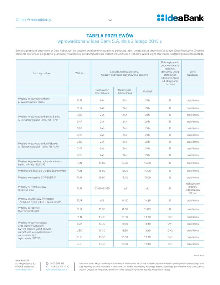 Tabela Przelewów wprowadzona w Idea Bank S.A. dnia 2 lutego