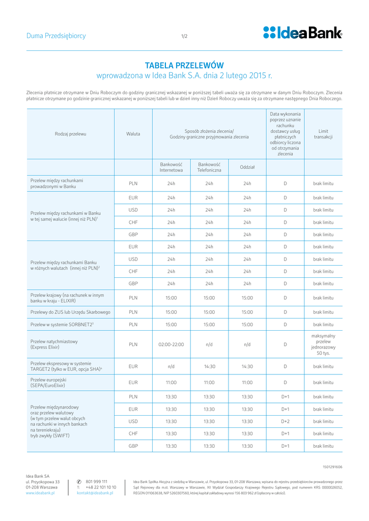 Duma Przedsiębiorcy 1/2 Tabela Przelewów wprowadzona w Idea Bank S.A. dnia 2 lutego 2015 r. Zlecenia płatnicze otrzymane w Dniu Roboczym do godziny granicznej wskazanej w poniższej tabeli uważa się za otrzymane w danym Dniu Roboczym. Zlecenia płatnicze otrzymane po godzinie granicznej wskazanej w poniższej tabeli lub w dzień inny niż Dzień Roboczy uważa się za otrzymane następnego Dnia Roboczego. Rodzaj przelewu Waluta Sposób złożenia zlecenia/ Godziny graniczne przyjmowania zlecenia Data wykonania poprzez uznanie rachunku dostawcy usług płatniczych odbiorcy liczona od otrzymania zlecenia Limit transakcji Bankowość Internetowa Bankowość Telefoniczna Oddział PLN 24h 24h 24h D brak limitu EUR 24h 24h 24h D brak limitu USD 24h 24h 24h D brak limitu CHF 24h 24h 24h D brak limitu GBP 24h 24h 24h D brak limitu EUR 24h 24h 24h D brak limitu USD 24h 24h 24h D brak limitu CHF 24h 24h 24h D brak limitu GBP 24h 24h 24h D brak limitu Przelew krajowy (na rachunek w innym banku w kraju - ELIXIR) PLN 15:00 15:00 15:00 D brak limitu Przelewy do ZUS lub Urzędu Skarbowego PLN 15:00 15:00 15:00 D brak limitu Przelew w systemie SORBNET23 PLN 15:00 15:00 15:00 D brak limitu Przelew natychmiastowy (Express Elixir) PLN 02:00-22:00 n/d n/d D maksymalny przelew jednorazowy 50 tys. Przelew ekspresowy w systemie TARGET2 (tylko w EUR, opcja SHA)4 EUR n/d 14:30 14:30 D brak limitu Przelew europejski (SEPA/EuroElixir) EUR 11:00 11:00 11:00 D brak limitu PLN 13:30 13:30 13:30 D+1 brak limitu EUR 13:30 13:30 13:30 D+1 brak limitu USD 13:30 13:30 13:30 D+2 brak limitu CHF 13:30 13:30 13:30 D+1 brak limitu GBP 13:30 13:30 13:30 D+1 brak limitu Przelew między rachunkami prowadzonymi w Banku Przelew między rachunkami w Banku w tej samej walucie (innej niż PLN)1 Przelew między rachunkami Banku w różnych walutach (innej niż PLN)2 Przelew międzynarodowy oraz przelew walutowy (w tym przelew walut obcych na rachunki w innych bankach na tereniekraju) tryb zwykły (SWIFT) 1501291606 Idea Bank SA ul. Przyokopowa 33 01-208 Warszawa www.ideabank.pl 801 999 111 +48 22 101 10 10 [email protected] T: Idea Bank Spółka Akcyjna z siedzibą w Warszawie, ul. Przyokopowa 33, 01-208 Warszawa, wpisana do rejestru przedsiębiorców prowadzonego przez Sąd Rejonowy dla m.st. Warszawy w Warszawie, XII Wydział Gospodarczy Krajowego Rejestru Sądowego, pod numerem KRS 0000026052, REGON 011063638, NIP 5260307560, której kapitał zakładowy wynosi 156 803 962 zł (opłacony w całości). Duma Przedsiębiorcy Przelew międzynarodowy oraz przelew walutowy (w tym przelew walut obcych na rachunki w innych bankach na terenie kraju) tryb przyśpieszony (SWIFT) Przelew międzynarodowy oraz przelew walutowy (w tym przelew walut obcych na rachunki w innych bankach na terenie kraju) tryb ekspresowy (SWIFT) 2/2 PLN n/d n/d n/d n/d n/d EUR n/d n/d n/d n/d n/d USD n/d 13:00 13:00 D+1 brak limitu CHF n/d n/d n/d n/d n/d GBP n/d n/d n/d n/d n/d PLN n/d 13:00 13:00 D brak limitu EUR n/d 13:00 13:00 D brak limitu USD n/d 13:00 13:00 D brak limitu CHF n/d n/d n/d n/d n/d GBP n/d n/d n/d n/d n/d Oznacza przelew między rachunkami w Idea Bank S.A. w którym waluta transakcji jest taka sama jak waluta rachunku obciążanego i uznawanego kwotą transakcji. Oznacza przelew między rachunkami w Idea Banku S.A. w którym waluta transakcji jest inna niż waluta rachunku obciążanego i/lub uznawanego kwotą transakcji. 3 System SORBNET2 – system obsługi rachunków bankowych prowadzonych w centrali Narodowego Banku Polskiego, w którym dokonywane są rozrachunki międzybankowe w złotych, umożliwiający dokonywanie przelewów w czasie rzeczywistym. 4 Polecenie przelewu TARGET2 to przelew realizowany z datą waluty „dziś” (D) w walucie EUR i przekazywany na rachunek odbiorcy prowadzony w banku na terytorium Unii Europejskiej (w tym do innego banku krajowego), który jest uczestnikiem systemu TARGET2. Idea Bank S.A. realizuje przelew TARGET2 do banków będących uczestnikami systemu rozliczeniowego TARGET2, pod warunkiem spełnienia następujących kryteriów: - walutą zlecenia jest EUR, - przelew zawiera poprawny kod BIC banku odbiorcy, - rachunek odbiorcy jest w formacie IBAN, - banki odbiorcy jest uczestnikiem systemu TARGET2, - przelew jest w opcji SHA. Lista uczestników systemu TARGET2 znajduje się pod adresem www.ideabank.pl. Przelewy w systemie TARGET2 są wykonywane wyłącznie za pośrednictwem za pośrednictwem Oddziału lub poprzez Bankowość Telefoniczną. 5 Do krajów Europejskiego Obszaru Gospodarczego (EOG) i w walucie EOG w tym przelewów zlecanych na rachunki innych banków krajowych możliwa jest tylko opcja SHA oraz OUR. 1 2 1501291606 Idea Bank SA ul. Przyokopowa 33 01-208 Warszawa www.ideabank.pl 801 999 111 +48 22 101 10 10 [email protected] T: Idea Bank Spółka Akcyjna z siedzibą w Warszawie, ul. Przyokopowa 33, 01-208 Warszawa, wpisana do rejestru przedsiębiorców prowadzonego przez Sąd Rejonowy dla m.st. Warszawy w Warszawie, XII Wydział Gospodarczy Krajowego Rejestru Sądowego, pod numerem KRS 0000026052, REGON 011063638, NIP 5260307560, której kapitał zakładowy wynosi 156 803 962 zł (opłacony w całości).