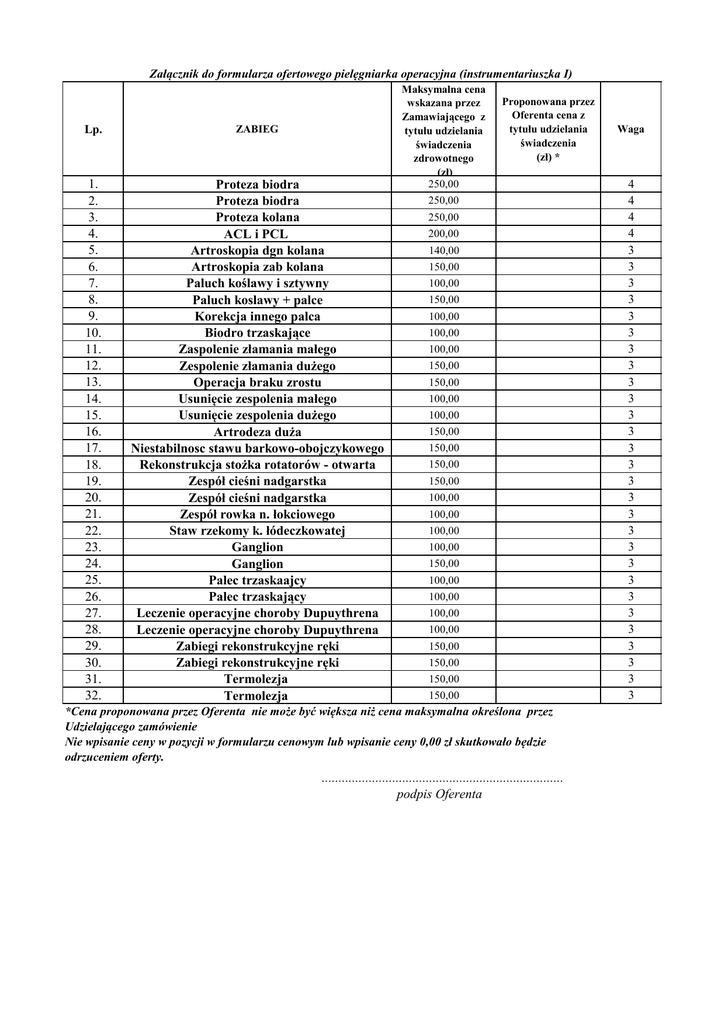 Załącznik do formularza ofertowego pielęgniarka operacyjna (instrumentariuszka I) Lp. ZABIEG 1. 2. 3. 4. 5. 6. 7. 8. 9. 10. 11. 12. 13. 14. 15. 16. 17. 18. 19. 20. 21. 22. 23. 24. 25. 26. 27. 28. 29. 30. 31. 32. Proteza biodra Proteza biodra Proteza kolana ACL i PCL Artroskopia dgn kolana Artroskopia zab kolana Paluch koślawy i sztywny Paluch koslawy + palce Korekcja innego palca Biodro trzaskające Zaspolenie złamania małego Zespolenie złamania dużego Operacja braku zrostu Usunięcie zespolenia małego Usunięcie zespolenia dużego Artrodeza duża Niestabilnosc stawu barkowo-obojczykowego Rekonstrukcja stożka rotatorów - otwarta Zespół cieśni nadgarstka Zespół cieśni nadgarstka Zespół rowka n. łokciowego Staw rzekomy k. łódeczkowatej Ganglion Ganglion Palec trzaskaajcy Palec trzaskający Leczenie operacyjne choroby Dupuythrena Leczenie operacyjne choroby Dupuythrena Zabiegi rekonstrukcyjne ręki Zabiegi rekonstrukcyjne ręki Termolezja Termolezja Maksymalna cena wskazana przez Zamawiającego z tytułu udzielania świadczenia zdrowotnego (zł) 250,00 Proponowana przez Oferenta cena z tytułu udzielania świadczenia (zł) * 250,00 250,00 200,00 140,00 150,00 100,00 150,00 100,00 100,00 100,00 150,00 150,00 100,00 100,00 150,00 150,00 150,00 150,00 100,00 100,00 100,00 100,00 150,00 100,00 100,00 100,00 100,00 150,00 150,00 150,00 150,00 *Cena proponowana przez Oferenta nie może być większa niż cena maksymalna określona przez Udzielającego zamówienie Nie wpisanie ceny w pozycji w formularzu cenowym lub wpisanie ceny 0,00 zł skutkowało będzie odrzuceniem oferty. ........................................................................ podpis Oferenta Waga 4 4 4 4 3 3 3 3 3 3 3 3 3 3 3 3 3 3 3 3 3 3 3 3 3 3 3 3 3 3 3 3