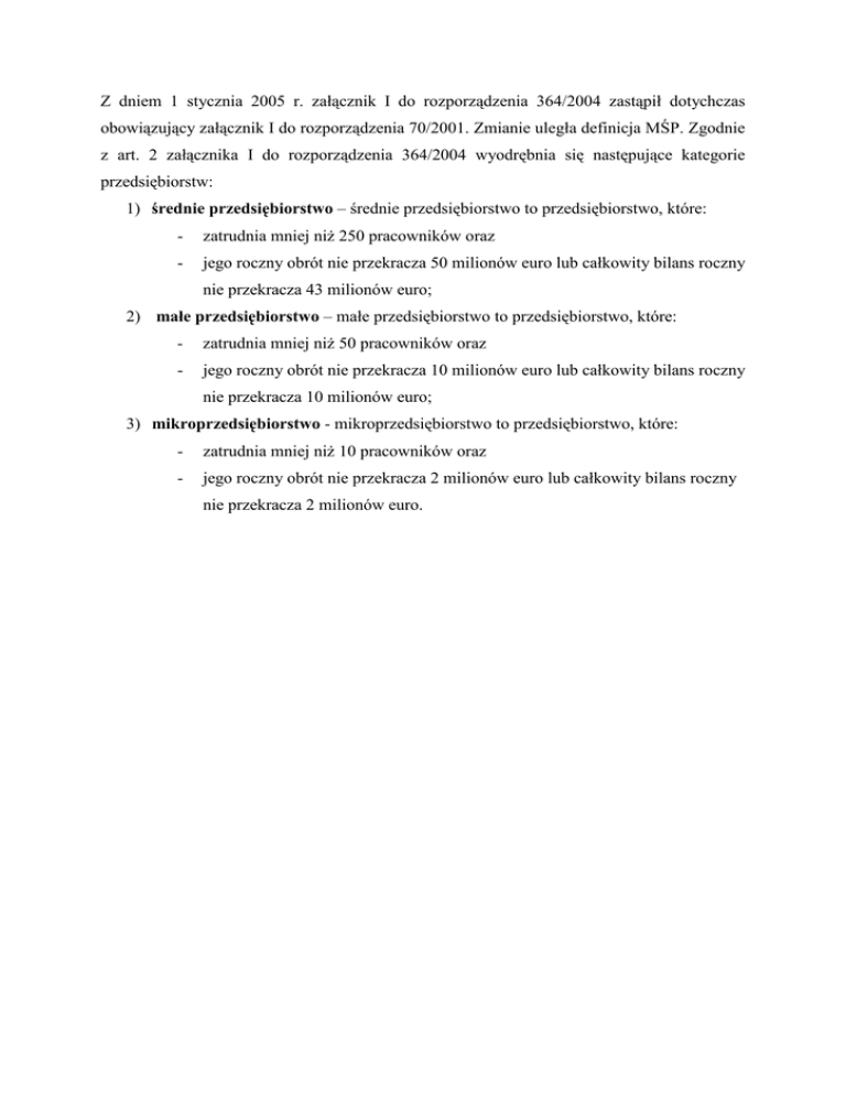 Z dniem 1 stycznia 2005 r. załącznik I do rozporządzenia 364/2004 zastąpił dotychczas obowiązujący załącznik I do rozporządzenia 70/2001. Zmianie uległa definicja MŚP. Zgodnie z art. 2 załącznika I do rozporządzenia 364/2004 wyodrębnia się następujące kategorie przedsiębiorstw: 1) średnie przedsiębiorstwo – średnie przedsiębiorstwo to przedsiębiorstwo, które: - zatrudnia mniej niŜ 250 pracowników oraz - jego roczny obrót nie przekracza 50 milionów euro lub całkowity bilans roczny nie przekracza 43 milionów euro; 2) małe przedsiębiorstwo – małe przedsiębiorstwo to przedsiębiorstwo, które: - zatrudnia mniej niŜ 50 pracowników oraz - jego roczny obrót nie przekracza 10 milionów euro lub całkowity bilans roczny nie przekracza 10 milionów euro; 3) mikroprzedsiębiorstwo - mikroprzedsiębiorstwo to przedsiębiorstwo, które: - zatrudnia mniej niŜ 10 pracowników oraz - jego roczny obrót nie przekracza 2 milionów euro lub całkowity bilans roczny nie przekracza 2 milionów euro.