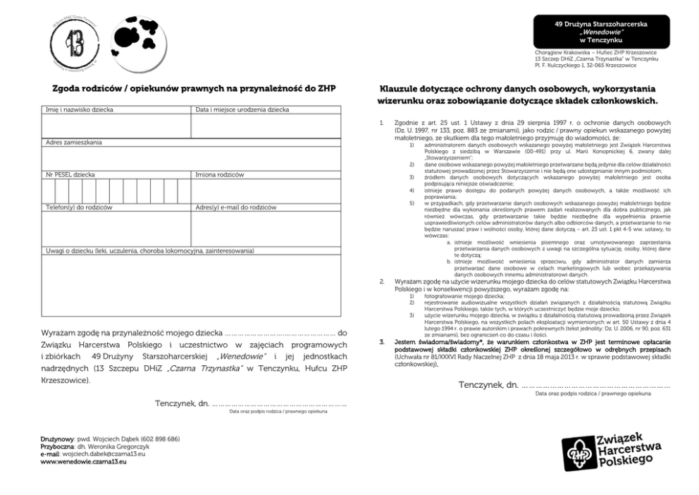 49 Drużyna Starszoharcerska „Wenedowie” w Tenczynku Chorągiew Krakowska – Hufiec ZHP Krzeszowice 13 Szczep DHiZ „Czarna Trzynastka” w Tenczynku Pl. F. Kulczyckiego 1, 32-065 Krzeszowice Zgoda rodziców / opiekunów prawnych na przynależność do ZHP Imię i nazwisko dziecka Klauzule dotyczące ochrony danych osobowych, wykorzystania wizerunku oraz zobowiązanie dotyczące składek członkowskich. Data i miejsce urodzenia dziecka 1. Adres zamieszkania Zgodnie z art. 25 ust. 1 Ustawy z dnia 29 sierpnia 1997 r. o ochronie danych osobowych (Dz. U. 1997, nr 133, poz. 883 ze zmianami), jako rodzic / prawny opiekun wskazanego powyżej małoletniego, ze skutkiem dla tego małoletniego przyjmuję do wiadomości, że: 1) 2) Nr PESEL dziecka Imiona rodziców 3) 4) Telefon(y) do rodziców 5) Adres(y) e-mail do rodziców Uwagi o dziecku (leki, uczulenia, choroba lokomocyjna, zainteresowania) 2. Wyrażam zgodę na użycie wizerunku mojego dziecka do celów statutowych Związku Harcerstwa Polskiego i w konsekwencji powyższego, wyrażam zgodę na: 1) 2) 3) Wyrażam zgodę na przynależność mojego dziecka ……………………….…………………… do Związku Harcerstwa Polskiego i uczestnictwo w zajęciach programowych i zbiórkach 49 Drużyny Starszoharcerskiej „Wenedowie” i jej jednostkach nadrzędnych (13 Szczepu DHiZ „Czarna Trzynastka” w Tenczynku, Hufcu ZHP Krzeszowice). 3. administratorem danych osobowych wskazanego powyżej małoletniego jest Związek Harcerstwa Polskiego z siedzibą w Warszawie (00-491) przy ul. Marii Konopnickiej 6, zwany dalej „Stowarzyszeniem”; dane osobowe wskazanego powyżej małoletniego przetwarzane będą jedynie dla celów działalności statutowej prowadzonej przez Stowarzyszenie i nie będą one udostępnianie innym podmiotom; źródłem danych osobowych dotyczących wskazanego powyżej małoletniego jest osoba podpisująca niniejsze oświadczenie; istnieje prawo dostępu do podanych powyżej danych osobowych, a także możliwość ich poprawiania; w przypadkach, gdy przetwarzanie danych osobowych wskazanego powyżej małoletniego będzie niezbędne dla wykonania określonych prawem zadań realizowanych dla dobra publicznego, jak również wówczas, gdy przetwarzanie takie będzie niezbędne dla wypełnienia prawnie usprawiedliwionych celów administratorów danych albo odbiorców danych, a przetwarzanie to nie będzie naruszać praw i wolności osoby, której dane dotyczą – art. 23 ust. 1 pkt 4-5 ww. ustawy, to wówczas: a. istnieje możliwość wniesienia pisemnego oraz umotywowanego zaprzestania przetwarzania danych osobowych z uwagi na szczególna sytuację, osoby, której dane te dotyczą; b. istnieje możliwość wniesienia sprzeciwu, gdy administrator danych zamierza przetwarzać dane osobowe w celach marketingowych lub wobec przekazywania danych osobowych innemu administratorowi danych. fotografowanie mojego dziecka; rejestrowanie audiowizualne wszystkich działań związanych z działalnością statutową Związku Harcerstwa Polskiego, także tych, w których uczestniczyć będzie moje dziecko; użycie wizerunku mojego dziecka, w związku z działalnością statutową prowadzoną przez Związek Harcerstwa Polskiego, na wszystkich polach eksploatacji wymienionych w art. 50 Ustawy z dnia 4 lutego 1994 r. o prawie autorskim i prawach pokrewnych (tekst jednolity: Dz. U. 2006, nr 90, poz. 631 ze zmianami), bez ograniczeń co do czasu i ilości. Jestem świadoma/świadomy*, że warunkiem członkostwa w ZHP jest terminowe opłacanie podstawowej składki członkowskiej ZHP określonej szczegółowo w odrębnych przepisach (Uchwała nr 81/XXXVI Rady Naczelnej ZHP z dnia 18 maja 2013 r. w sprawie podstawowej składki członkowskiej). Tenczynek, dn. ……………………………………………………… Data oraz podpis rodzica / prawnego opiekuna Tenczynek, dn. ……………………………………………………… Data oraz podpis rodzica / prawnego opiekuna Drużynowy: pwd. Wojciech Dąbek (602 898 686) Przyboczna: dh. Weronika Gregorczyk e-mail: [email protected] www.wenedowie.czarna13.eu