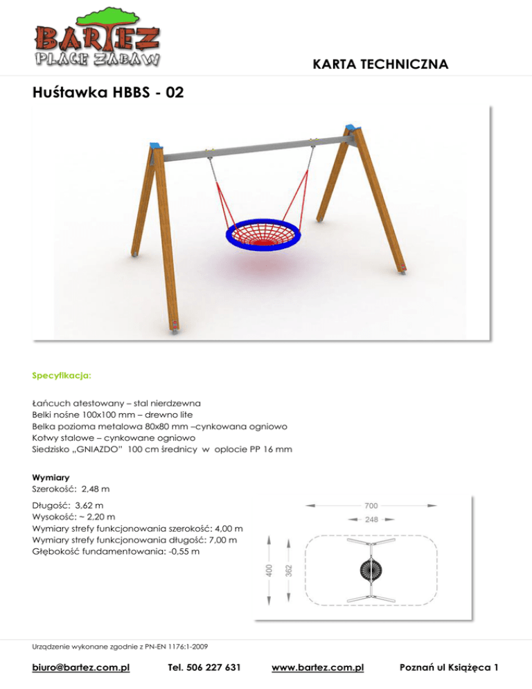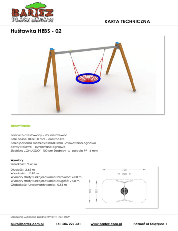 KARTA TECHNICZNA Huśtawka HBBS - 02 Specyfikacja: Łańcuch atestowany – stal nierdzewna Belki nośne 100x100 mm – drewno lite Belka pozioma metalowa 80x80 mm –cynkowana ogniowo Kotwy stalowe – cynkowane ogniowo Siedzisko „GNIAZDO” 100 cm średnicy w oplocie PP 16 mm Wymiary Szerokość: 2,48 m Długość: 3,62 m Wysokość: ~ 2,20 m Wymiary strefy funkcjonowania szerokość: 4,00 m Wymiary strefy funkcjonowania długość: 7,00 m Głębokość fundamentowania: -0,55 m Urządzenie wykonane zgodnie z PN-EN 1176:1-2009 [email protected] Tel. 506 227 631 www.bartez.com.pl Poznań ul Książęca 1