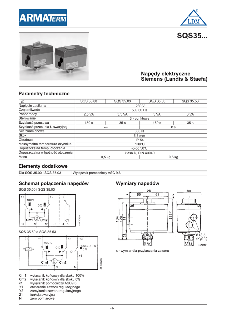 ® SQS35... Napędy elektryczne Siemens (Landis & Staefa) Parametry techniczne Typ Napięcie zasilania Częstotliwość Pobór mocy Sterowanie Szybkość przesuwu Szybkość przes. dla f. awaryjnej Siła znamionowa Skok Obudowa Maksymalna temperatura czynnika Dopuszczalna temp. otoczenia Dopuszczalna wilgotność otoczenia Masa SQS 35.00 SQS 35.03 SQS 35.50 SQS 35.53 5 VA 6 VA 230 V 50 / 60 Hz 2,5 VA 3,5 VA 3 - punktowe 150 s 35 s 150 s 35 s 8s --300 N 5,5 mm IP 54 130o C -5 do 50oC klasa D, DIN 40040 0,5 kg 0,6 kg Elementy dodatkowe Dla SQS 35.00 i SQS 35.03 Wyłącznik pomocniczy ASC 9.6 Schemat połączenia napędów Wymiary napędów SQS 35.00 i SQS 35.03 SQS 35.50 a SQS 35.53 x - wymiar dla przyłączenia zaworu Cm1 Cm2 c1 Y1 Y2 21 N wyłącznik końcowy dla skoku 100% wyłącznik końcowy dla skoku 0% wyłącznik pomocniczy ASC9.6 otwieranie zaworu regulacyjnego zamykanie zaworu regulacyjnego funkcja awaryjna zero pomiarowe -1- ® AUTORYZOWANY PARTNER LDM w Polsce siedziba firmy w Poznaniu aktualny adres na www.armaterm.pl tel. (+48 61) 848 84 31 tel. kom. 0506 110 005 fax (+48 61) 848 84 31 e-mail: [email protected] www.armaterm.pl UWAGI: LDM, spol. s r.o. zastrzega sobie prawo do wprowadzania zmian w swoich produktach i specifikacjach bez uprzedniego ostrzeżenia. -2-
