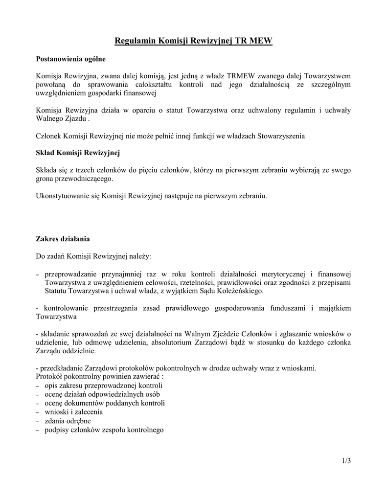 Regulamin Komisji Rewizyjnej TR MEW Postanowienia ogólne Komisja Rewizyjna, zwana dalej komisją, jest jedną z władz TRMEW zwanego dalej Towarzystwem powołaną do sprawowania całokształtu kontroli nad jego działalnością ze szczególnym uwzględnieniem gospodarki finansowej Komisja Rewizyjna działa w oparciu o statut Towarzystwa oraz uchwalony regulamin i uchwały Walnego Zjazdu . Członek Komisji Rewizyjnej nie może pełnić innej funkcji we władzach Stowarzyszenia Skład Komisji Rewizyjnej Składa się z trzech członków do pięciu członków, którzy na pierwszym zebraniu wybierają ze swego grona przewodniczącego. Ukonstytuowanie się Komisji Rewizyjnej następuje na pierwszym zebraniu. Zakres działania Do zadań Komisji Rewizyjnej należy: – przeprowadzanie przynajmniej raz w roku kontroli działalności merytorycznej i finansowej Towarzystwa z uwzględnieniem celowości, rzetelności, prawidłowości oraz zgodności z przepisami Statutu Towarzystwa i uchwał władz, z wyjątkiem Sądu Koleżeńskiego. - kontrolowanie przestrzegania zasad prawidłowego gospodarowania funduszami i majątkiem Towarzystwa - składanie sprawozdań ze swej działalności na Walnym Zjeździe Członków i zgłaszanie wniosków o udzielenie, lub odmowę udzielenia, absolutorium Zarządowi bądź w stosunku do każdego członka Zarządu oddzielnie. - przedkładanie Zarządowi protokołów pokontrolnych w drodze uchwały wraz z wnioskami. Protokół pokontrolny powinien zawierać : – opis zakresu przeprowadzonej kontroli – ocenę działań odpowiedzialnych osób – ocenę dokumentów poddanych kontroli – wnioski i zalecenia – zdania odrębne – podpisy członków zespołu kontrolnego 1/3 Komisja rewizyjna ma prawo zwołania Nadzwyczajnego Walnego Zebrania Członków, a także prawo żądania zwołania zebrania Zarządu. Tryb działania Zebrania odbywają się w miarę potrzeby jednakże nie rzadziej niż raz w roku. Zebrania Komisji zwołuje przewodniczący. Jest on zobowiązany do wyznaczenia terminu, miejsca oraz porządku obrad i następnie przekazania tych informacji do Biura Zarządu w terminie umożliwiającym dostarczenie zaproszeń – za zwrotnym potwierdzeniem odbioru wszystkim członkom Komisji w terminie nie krótszym niż na czternaści dni przed planowanym Zebraniem Komisji. W przypadku konieczności podjęcia pilnych decyzji dopuszcza się inne skuteczne formy powiadomienia. Dopuszcza się odstąpienie od konieczności powiadomienia członków Komisji na czternaście dni przed planowanym zebraniem o ile wszyscy członkowie Komisji wyrażą zgodę. Dopuszcza się odbywanie zebrań na odległość, bez konieczności fizycznej obecności w jednym miejscu, członków Komisji Rewizyjnej. W zebraniach mogą brać udział osoby zaproszone przez przewodniczącego lub Członków Komisji Rewizyjnej. Osobom tym przysługuje głos doradczy. Komisja Rewizyjna ma prawo żądania od członków, władz Towarzystwa oraz pracowników Biura pisemnych lub ustnych wyjaśnień dotyczących kontrolowanych spraw. Komisja Rewizyjna swoje decyzje podejmuje w drodze uchwały Uchwały Komisji Rewizyjnej zapadają zwykłą większością głosów członków uczestniczących uczestnictwie głosowaniu. Głosowanie nad uchwałami może odbyć się na odległość w drodze ustalenia telefonicznego korespondencyjnego lub z wykorzystaniem technicznych środków łączności. Komisja Rewizyjna przy wykonywaniu swoich kontrolnych funkcji, jeżeli uzna za stosowne, może skorzystać z usług specjalisty z danej dziedziny wiedzy, również spoza Stowarzyszenia. Komisja wnioskuje wówczas do Zarządu o wyznaczenie biegłego, który jest powoływany na najbliższym posiedzeniu Zarządu stosowaną uchwałą i zapewnienie na ten cel niezbędnych środków finansowych. Uchwały Komisji Rewizyjnej przekazywane są do realizacji zarządowi Towarzystwa za pośrednictwem Biura Zarządu Z każdego posiedzenia Komisji sporządza się protokół a Uchwały podjęte przez Komisję Rewizyjną przesyła się Prezesowi TRMEW z ewentualnymi zaleceniami do wykonania, jeżeli zachodzi taka potrzeba. Dyskutanci mają prawo wnosić o załączenie swego wystąpienia do protokołu 2/3 Przyjęty przez Komisję protokół podpisują wszyscy uczestnicy i protokolant Protokoły wraz z załącznikami są przechowywane w aktach w biurze Zarządu Postanowienia końcowe Ze swej działalności w Komisji członkowie Komisji Rewizyjnej zdają sprawozdania na Walnym Zjeździe. Praca członków Komisji Rewizyjnej ma charakter społeczny i nie przysługuje za nią wynagrodzenie Członkom Komisji przysługuje zwrot kosztów przejazdu, a także wydatków poniesionych w związku z realizacją wyznaczonych zadań. Działalność statutową i regulaminową Komisji Rewizyjnej pod względem administracyjnym i technicznym zabezpiecza Biuro Zarządu Działalność Komisji Rewizyjnej kończy się z chwilą wyboru nowej Komisji Rewizyjnej przez Walne Zgromadzenie. Regulamin Komisji Rewizyjnej wchodzi w życie z chwilą jego uchwalenia przez Walny Zjazd Członków 3/3