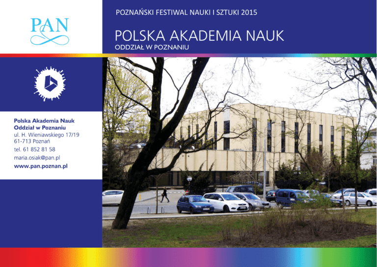 POZNA SKI FESTIWAL NAUKI I SZTUKI 2015 ODDZIA W POZNANIU Polska Akademia Nauk Oddzia w Poznaniu POLSKA AKADEMIA NAUK ODDZIA W POZNANIU Nazwa Opis Inauguracja Wyk ad i wyk ad inauguracyjny wst pne – prof. Roman S owi ski, Prezes "JPowitanie kaj ce isis owo geny i piewaj ce genomy" 14 KWIETNIA 2015 *R – Rezerwacja miejsc Miejsce Sala Godzina Limit Wiek R* O rodek Nauki PAN, Aula 10.00 250 osób 14+ TAK O rodek Nauki PAN, ul. H. Wieniawskiego 17/19 w Poznaniu Aula 11.30 250 osób 14+ 12+ TAK O rodek Nauki PAN, ul. H. Wieniawskiego 17/19 w Poznaniu Aula 12.10 250 osób 12+ TAK O rodek Nauki PAN, ul. H. Wieniawskiego 17/19 w Poznaniu Aula 13.50 250 osób 12+ TAK Oddzia u PAN w Poznaniu ul. H. Wieniawskiego 17/19 Uroczyste otwarcie XVIII PFN i Szosiak, – prof.czBronis prof. dr hab. W odzimierz Krzy onekaw Marciniak, w Poznaniu Przewodnicz cyPAN, Kolegium Rektorów Poznania PAN. korespondent Instytut ChemiiMiasta Bioorganicznej “Jakajace sie geny i spiewajace genomy” prof. dr hab. W odzimierz Krzy¿osiak, cz onek korespondent PAN, Instytut Chemii Bioorganicznej PAN. Wyk ad "Antykoncepcja dla obu p ci" - ka dy wiek ma swoje prawa. prof. dr hab. Maciej Kurpisz, Instytut Genetyki Cz owieka PAN, dr Krzysztof Katulski, Katedra i Klinika Endokrynologii Ginekologicznej UM w Poznaniu Wyk ad "Zachodnia Syberia - Tomsk – Przyroda - Kultura - Ludzie". prof. dr hab. Lech Wojciech Szajdak, Instytyt rodowiska Rolniczego i Le nego PAN. Wyk ad zaprezentuje miasto Tomsk na zachodniej Syberii, jako znacz cy o rodek akademicki oraz wk ad Polaków w jego histori . Autor przedstawi fotografie z ekspedycji w tajg w tym na najwi ksze torfowiska wiata the great Vasyugan Mire o powierzchni ok. 60.000 km² (Polska ma 312.000 km²). Wyk ad "Nieznany epizod z pocz tków pa stwa polskiego. Kim byli wojownicy z Bodzi?" dr hab. Micha Kara, prof. nadzw. PAN, dr Iwona Sobkowiak-Tabaka Prezentacja wyników interdyscyplinarnych bada elitarnego cmentarzyska w Bodzi ko o W oc awka, z okresu formowania si monarchii pierwszych Piastów. Czas ok. 45 min, prezentacja mulitmedialna, wyk ad b dzie dostosowany do szerokiego grona odbiorców. Nazwa Opis Warsztaty O rodek Nauki PAN, ul. H. Wieniawskiego 17/19 w Poznaniu Karolina Nowak, Agnieszka Kiliszek, Wojciech Rypniewski, Joanna liwiak i Stanis aw Wosicki - Instytut Chemii Bioorganicznej PAN. "Zosta Miejsce owc kryszta ów oraz t czy". Sala Godzina Limit Wiek R* hol 10.00-14.30 5 osób co 30 min. zaczynaj c od 10.00 12+ NIE hol 10.00-14.30 b.o. b.o. NIE sala 311 i 312 09.00-15.00 rezerwacja dla grup (maksymalnie ok. 30 osób) co 1 godz. w godz. 9:00 – 15:00, osoby indywidualne mog do czy do grup bez wcze niejszej rezerwacji b.o. TAK dla grup Tu b dziecie mogli w asnor cznie owi kryszta y bia kowe lub obserwowa jak radz sobie z tym twoi koledzy i kole anki. Poka emy te wam niezwyk e w a ciwo ci wiat a i wyt umaczymy wam jak dzi ki temu poznajemy struktur 3D cz steczek takich jak bia ka, kwasy nukleinowe czy zwi zki organiczne. Warszataty O rodek Nauki PAN, ul. H. Wieniawskiego 17/19 w Poznaniu Prof. dr hab Zbigniew Trybu a, Instytut Fizyki Molekularnej PAN w Poznaniu Zak ad Fizyki Niskich Temperatur w Odolanowie. Instytut Fizyki Molekularnej PAN. "Fascynuj cy wiat fizyki niskich temperatur". Prezentacja w a ciwo ci cieczy kriogenicznych i ciekawych zachowa materia ów w niskich temperaturach. Wspó udzia uczestników w tworzeniu eksperymentów. Warsztaty, gry i zabawy "Modelarnia DNA" Osoba odpowiedzialna: mgr Magdalena Zieli ska. Pomocnicy: mgr Alina Kasperska, Konstancja Handschuh, Iga Koz owska, Instytut Chemii Bioorganicznej PAN. Jak wygl da DNA? Czy przypomina kr cone schody, a je li tak, to czy wa ne, w któr stron si skr ca? Odpowiedzi na te i inne pytania znajdziesz buduj c razem z nami modele DNA – z plastiku i metalu, z klocków LEGO i rurek PCV. Drewniany poci g pomo e Ci zrozumie budow nici DNA, a magnetyczne puzzle pozwol przej skomplikowan drog od DNA do bia ka. O rodek Nauki PAN, ul. H. Wieniawskiego 17/19 w Poznaniu Nazwa Opis Warsztaty, gry i zabawy "Na placu gry" Osoba odpowiedzialna: mgr Katarzyna Klonowska, Instytut Chemii Bioorganicznej PAN. Pomocnicy: mgr Anna Samelak-Czajka, mgr Marek Milewski, Jurand Handschuh, Marzena Wojciechowska. Miejsce Sala Godzina Limit Wiek R* O rodek Nauki PAN, ul. H. Wieniawskiego 17/19 w Poznaniu sala 311 i 312 09.00-15.00 rezerwacja dla grup (maksymalnie ok. 30 osób) co 1 godz. w godz. 9:00 – 15:00, osoby indywidualne mog do czy do grup bez wcze niejszej rezerwacji b.o. TAK dla grup O rodek Nauki PAN, ul. H. Wieniawskiego 17/19 w Poznaniu sala 311 i 312 09.00-15.00 rezerwacja dla grup (maksymalnie ok. 30 osób) co 1 godz. w godz. 9:00 – 15:00, osoby indywidualne mog do czy do grup bez wcze niejszej rezerwacji b.o. TAK dla grup O rodek Nauki PAN, ul. H. Wieniawskiego 17/19 w Poznaniu hol Pokazy dla grup o pe nych godzinach b.o. b.o. grupy TAK Nauka poprzez zabaw ? U nas to dzia a! Dla mi o ników planszówek i amig ówek mamy prawdziwy kiermasz gier ko o fortuny, ruletk , bingo, monopol i dobble. Wszystkie kr c si wokó genetyki i laboratorium. Dla fanów komputerów wybrali my najbardziej biologiczne gry w sieci. Z nami na pewno nie b dziesz si nudzi ! Warsztaty, gry i zabawy "Nobliwa gromadka" Osoba odpowiedzialna: dr Luiza Handschuh, Instytut Chemii Bioorganicznej PAN. Pomocnicy: mgr Karol Czubak. dnym wiedzy i sukcesu przedstawimy sylwetki gwiazd nauki. Dowiesz si , kim s lub byli ci, którzy si gn li po najwy sze trofeum - Nagrod Nobla. Czego dokonali? Czy byli geniuszami czy zwyk ymi lud mi? Sk d pochodzili? Ile w ród nich by o kobiet? Nasz „nobliw ” gromadk poznasz dzi ki magnetycznym puzzlom, „Piotrusiowi” i „Zgadnij kto to?”. Wystawa Wystawa pt. "W wiecie dendrologa". Opowiemy, czym zajmuje si dendrolog, jakie przeprowadza badania i do wiadczenia. Przyjrzymy si z bliska ró nym cz ciom drzew, opowiemy o ich funkcji i budowie. S owem – dendrologia w pigu ce. Pracownicy Instytutu Dendrologii P