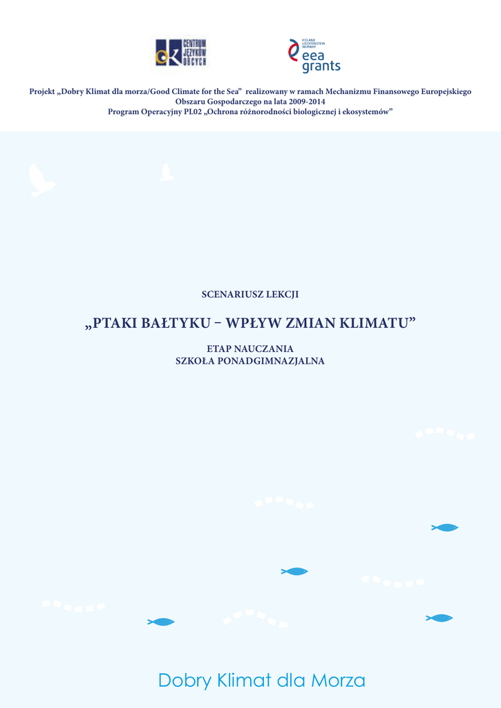 Projekt „Dobry Klimat dla morza/Good Climate for the Sea” realizowany w ramach Mechanizmu Finansowego Europejskiego Obszaru Gospodarczego na lata 2009-2014 Program Operacyjny PL02 „Ochrona różnorodności biologicznej i ekosystemów” SCENARIUSZ LEKCJI „PTAKI BAŁTYKU – WPŁYW ZMIAN KLIMATU” ETAP NAUCZANIA SZKOŁA PONADGIMNAZJALNA Dobry Klimat dla Morza Scenariusz do filmu „Ptaki Bałtyku – wpływ zmian klimatu” Temat: Ptaki występujące w okolicy Morza Bałtyckiego Cel ogólny: Poszukiwanie, wykorzystanie i tworzenie informacji. Uczeń odbiera, analizuje i ocenia informacje pochodzące z różnych źródeł, ze szczególnym uwzględnieniem prasy, mediów i Internetu. Cele szczegółowe: • opisanie różnorodności biologicznej na poziomie gatunkowym i ekosystemowym • poznanie cech charakterystycznych ptaków w powiązaniu ze środowiskiem i trybem życia • opisanie przebiegu czynności życiowych, w tym rozmnażania się ptaków • wskazanie przyczyn spadku różnorodności genetycznej, wymierania gatunków, zanikania siedlisk i ekosystemów Metody pracy: praca z filmem, burza mózgów Formy pracy: grupowa i indywidualna Środki dydaktyczne: film dokumentalny (całość lub fragmenty – odcinek „Ptaki Bałtyku – wpływ zmian klimatu”), karta pracy (zał.1), komputer z dostępem do internetu. Czas lekcji: 1 godzina lekcyjna Przebieg lekcji: Faza wprowadzająca Nauczyciel ogląda z uczniami film (lub fragmenty) pt.: „Ptaki Bałtyku – wpływ zmian klimatu”. Faza realizacyjna 1. Nauczyciel rozdaje uczniom kartę pracy (zał.1). Uczniowie rozwiązują zadanie 1 z karty pracy. 2. Nauczyciel przeprowadza burzę mózgów na temat przystosowań ptaków nadmorskich do warunków środowiska przyrodniczego. Uczniowie wykonują zadanie 2 z karty pracy. 3. Uczniowie dobierają się w pary i wspólnie ustalają na jakie zagrożenia narażone są ptaki żyjące na plażach. Wykonują zadanie 3 z karty pracy. 4. Uczniowie w grupach projektują infografikę dotycząca bezpiecznego dla ptaków zachowania ludzi na plażach (zadanie 4 z karty pracy). Infografika może być wykonana w tradycyjny sposób lub z wykorzystaniem technologii informacyjnej np. w programie Piktochart. Faza podsumowująca 1. Każda grupa prezentuje swoją infografikę. Jeśli w pracowni nie ma sprzętu komputerowego uczniowie przedstawiają swoje plakaty i omawiają je w sposób tradycyjny. Dobry Klimat dla Morza