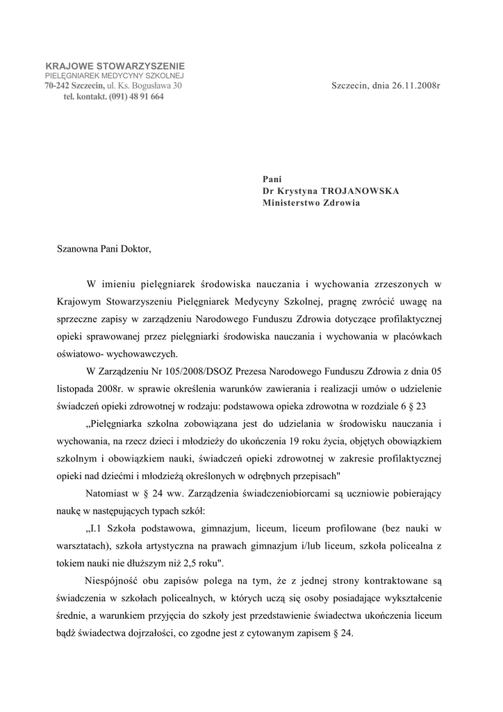 KRAJOWE STOWARZYSZENIE PIEL GNIAREK MEDYCYNY SZKOLNEJ 70-242 Szczecin, ul. Ks. Bogusława 30 tel. kontakt. (091) 48 91 664 Szczecin, dnia 26.11.2008r Pani Dr Krystyna TROJANOWSKA Ministerstwo Zdrowia Szanowna Pani Doktor, W imieniu piel gniarek rodowiska nauczania i wychowania zrzeszonych w Krajowym Stowarzyszeniu Piel gniarek Medycyny Szkolnej, pragn zwróci uwag na sprzeczne zapisy w zarz dzeniu Narodowego Funduszu Zdrowia dotycz ce profilaktycznej opieki sprawowanej przez piel gniarki rodowiska nauczania i wychowania w placówkach o wiatowo- wychowawczych. W Zarz dzeniu Nr 105/2008/DSOZ Prezesa Narodowego Funduszu Zdrowia z dnia 05 listopada 2008r. w sprawie okre lenia warunków zawierania i realizacji umów o udzielenie wiadcze opieki zdrowotnej w rodzaju: podstawowa opieka zdrowotna w rozdziale 6 § 23 „Piel gniarka szkolna zobowi zana jest do udzielania w rodowisku nauczania i wychowania, na rzecz dzieci i młodzie y do uko czenia 19 roku ycia, obj tych obowi zkiem szkolnym i obowi zkiem nauki, wiadcze opieki zdrowotnej w zakresie profilaktycznej opieki nad dzie mi i młodzie okre lonych w odr bnych przepisach" Natomiast w § 24 ww. Zarz dzenia wiadczeniobiorcami s uczniowie pobieraj cy nauk w nast puj cych typach szkół: „I.1 Szkoła podstawowa, gimnazjum, liceum, liceum profilowane (bez nauki w warsztatach), szkoła artystyczna na prawach gimnazjum i/lub liceum, szkoła policealna z tokiem nauki nie dłu szym ni 2,5 roku". Niespójno obu zapisów polega na tym, e z jednej strony kontraktowane s wiadczenia w szkołach policealnych, w których ucz si osoby posiadaj ce wykształcenie rednie, a warunkiem przyj cia do szkoły jest przedstawienie wiadectwa uko czenia liceum b d wiadectwa dojrzało ci, co zgodne jest z cytowanym zapisem § 24. Z drugiej za strony zgodnie z zarz dzeniem piel gniarka szkolna zobowi zana jest do udzielania wiadcze opieki zdrowotnej na rzecz dzieci i młodzie y obj tymi obowi zkiem nauki, do uko czenia 19 roku ycia. Zapis ten oznacza, e w ostatnich klasach szkół ponadgimnazajalnych tj: zasadniczych szkołach zawodowych o okresie nauczania nie krótszym ni dwa lata i nie dłu szym ni trzy lata, trzyletnich liceach ogólnokształc cych, trzyletnich liceach profilowanych i czteroletnich technikach uczniom, którzy w trakcie trwania roku szkolnego uko czyli 19 rok ycia nie mo e by sprawowana profilaktyczna opieka zdrowotna przez piel gniark szkoln . Zgodnie z obowi zuj cym Rozporz dzeniem Ministra Zdrowia w sprawie zakresu i organizacji profilaktycznej opieki zdrowotnej nad dzie mi i młodzie z dnia 22 grudnia 2004 r. profilaktyczna opieka zdrowotna sprawowana przez piel gniark szkoln obejmuje w szczególno ci m.in. wykonywanie i interpretowanie testów przesiewowych, kierowanie post powaniem poprzesiewowym oraz sprawowanie opieki piel gniarskiej nad uczniami obj tymi tym post powaniem, czynne poradnictwo w zakresie opieki piel gniarskiej, udzielanie pomocy przedlekarskiej w przypadku nagłych zachorowa , urazów i zatru . Zgodnie z ww. rozporz dzeniem oraz standardami i metodyk pracy piel gniarki szkolnej uczniowie ostatniej klasy szkoły ponadgimnazjalnej podlegaj testom przesiewowym , które wykonywane s w miesi cach stycze - marzec, kiedy ju cz uczniów uko czyła 19 lat. Ponadto uczniowie ci systematycznie ucz szczaj c do szkół s w dalszym ci gu obj ci profilaktyczn opiek . Szanowna Pani Doktor, zapisy w Zarz dzeniu 105/2008/DSOZ spowoduj wykre lenie z listy aktywnej piel gniarki równie uczniów niepełnosprawnych, którzy uko czyli 19 rok ycia w czasie trwania roku szkolnego, o których mówi Rozporz dzenie Ministra Edukacji Narodowej i Sportu z dnia 18 stycznia 2005 roku w sprawie warunków organizowania kształcenia, wychowania i opieki dla dzieci i młodzie y niepełnosprawnych oraz niedostosowanych społecznie w specjalnych przedszkolach, szkołach i oddziałach oraz w o rodkach, a w szczególno ci § 3.1, który brzmi: „Kształcenie dzieci i młodzie y niepełnosprawnych oraz niedostosowanych społecznie w szkołach specjalnych, oddziałach specjalnych w szkołach ogólnodost pnych jest prowadzone nie dłu ej ni do uko czenia przez ucznia: 1) 18 roku ycia - w przypadku szkoły podstawowej; 2) 21 roku ycia - w przypadku gimnazjum; 3) 24 roku ycia - w przypadku szkoły ponadgimnazjalnej lub dotychczasowej szkoły ponadpodstawowej". Ponadto przy tak skonstruowanych zapisach zarz dzenia Narodowego Funduszu Zdrowia dochodzi do dyskryminacji w skiej grupy uczniów (powtarzaj cych klas , po długotrwałej absencji w szkole zwi zanej z leczeniem itp.) polegaj cej na pozbawieniu ich profilaktycznej opieki zdrowotnej sprawowanej przez piel gniark szkoln . Z powa aniem