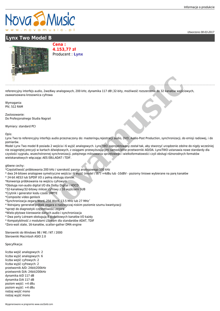 Informacje o produkcie Utworzono 08-03-2017 Lynx Two Model B Cena : 4.153,77 zł ic Producent : Lynx referencyjny interfejs audio, 2we/6wy analogowych, 200 kHz, dynamika 117 dB!,32-bity, możliwość rozszerzenia do 32 kanałów wejściowych, zaawansowana krosownica cyfrowa us Wymagania: PIV, 512 RAM Zastosowanie: Do Profesjonalnego Studia Nagrań Wymiary: standard PCI am Opis: Lynx Two to referencyjny interfejs audio przeznaczony do: masteringu,rejestracji audio, DVD, Audio-Post Production, synchronizacji, do emisji radiowej, i do pomiarów. Model Lynx Two model B posiada 2 wejścia i 6 wyjść analogowych. LynxTWO zaprojektowany został tak, aby stworzyć urządzenie zdolne do nigdy wcześniej nie osiągniętej precyzji w kartach dźwiękowych, z osiągami przewyższającymi samodzielne przetworniki AD/DA. LynxTWO ustanawia nowe standardy dla czystości sygnału, wszechstronnej synchronizacji, potężnego miksowania sprzętowego i wielkoformatowości czyli obsługi różnorodnych formatów wielokanałowych włączając AES EBU,ADAT i TDIF. N ov główne cechy: *Częstotliwość próbkowania 200 kHz / szerokość pasma analogowego 100 kHz * dwa 24-bitowe analogowe symetryczne wejścia i 6 wyjść (model \"B\") +4dBu lub -10dBV - poziomy liniowe wybierane na parę kanałów * 24-bit AES3 lub S/PDIF I/O z pełną obsługą stanów. *Konwersja próbkowania na wejściu cyfrowym *Obsługa non-audio digital I/O dla Dolby Digital i HDCD *32-kanałowy/32-bitowy mikser cyfrowy z 16 wyjściami SUB *Czytnik i generator kodu czasu SMPTE *Composite video genlock *Synchronizacja zegara Word, 256 Word, 13.5 MHz lub 27 MHzˇ * Nstrajany generator próbek zegara o nadzwyczaj niskim poziomie szumu kwantyzacji *sprzęt do diagnostyki częstotliwości zegara *Wielo-płytowe kierowanie danych audio i synchronizacja * Dwa porty Lstream obsługują 8 dodatkowych kanałów I/O każdy * Kompatybilność z modułami LStream dla standardów ADAT, TDIF *Zero-wait state, 16-kanałów, scatter-gather DMA engine Sterowniki do Windows 98 / ME / NT / 2000 Sterowniki Macintosh ASIO 2.0 Specyfikacja: liczba wejść analogowych: 2 liczba wyjść analogowych: 6 liczba wejść cyfrowych: 2 liczba wyjść cyfrowych: 2 przetwornik A/D: 24bit/200kHz przetwornik D/A: 24bit/200kHz dynamika A/D 117 dB dynamika D/A 117 dB poziom wejść: +4 dBu poziom wyjść: +4 dBu rodzaj wejść mono rodzaj wyjść mono Wygenerowano w programie www.oscGold.com gniazda wejściowe: XLR gniazda wyjściowe: XLR Dodatkowe opcje: obsługa ADAT, TDIF, AES EBU Łączna liczba wejść: 16 Łączna liczba wyjść: 16 Minimalna latencja 0 ms wejsćie SPDIF wyjśćie SPFID funkcja Ful Duplex: TAK Inne: opcjonalnie 16 kanał. ADAT lub 8 AES EBU Przesłuch międzykanałowy: - 120 dB Czestotliwości próbkowania: 192 / 96 / 48 / 44,1 / 32 / 22 / 16 kHz Word Clock SMPTE Magistrale: PCI ic Właściwości: Karta do zainstalowania wewnątrz komputera Do ściągnięcia Drivery: us Windows: lynx.zip N ov am referencyjna karta dźwiękowa nierzadko stosowana do pomiaru innych kart dźwiękowych w tym również kart RME, E-MU , ESI