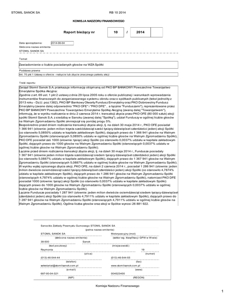 STOMIL SANOK SA RB 10 2014 KOMISJA NADZORU FINANSOWEGO Raport bieżący nr 10 / 2014 2014-06-04 Data sporządzenia: Skróc ona nazwa emitenta STOMIL SANOK SA Temat Zawiadomienie o liczbie posiadanych głosów na WZA Spółki Podstawa prawna Art. 70 pkt 1 Ustawy o oferc ie - nabyc ie lub zbyc ie znac znego pakietu akc ji Treść raportu: Zarząd Stomil Sanok S.A. przekazuje informację otrzymaną od PKO BP BANKOWY Powszechne Towarzystwo Emerytalne Spółka Akcyjna: Zgodnie z art. 69 ust. 1 pkt 2 ustawy z dnia 29 lipca 2005 roku o ofercie publicznej i warunkach wprowadzania instrumentów finansowych do zorganizowanego systemu obrotu oraz o spółkach publicznych (tekst jednolity z 2013 roku - Dz.U. poz.1382), PKO BP Bankowy Otwarty Fundusz Emerytalny oraz PKO Dobrowolny Fundusz Emerytalny (zwane dalej odpowiednio "PKO OFE" i "PKO DFE" , a łącznie "Funduszami"), reprezentowane przez PKO BP BANKOWY Powszechne Towarzystwo Emerytalne Spółkę Akcyjną (zwaną dalej "Towarzystwem"), informują, że w wyniku rozliczenia w dniu 2 czerwca 2014 r. transakcji zbycia przez PKO OFE (80 000 sztuk) akcji spółki Stomil Sanok S.A. z siedzibą w Sanoku (zwanej dalej "Spółką"), udział Funduszy w ogólnej liczbie głosów na Walnym Zgromadzeniu Spółki zmniejszył się poniżej progu 5%. Bezpośrednio przed dniem rozliczenia transakcji zbycia akcji, tj. na dzień 30 maja 2014 r., PKO OFE posiadał 1 366 941 (słownie: jeden milion trzysta sześćdziesiąt sześć tysięcy dziewięćset czterdzieści jeden) akcji Spółki (co stanowiło 5,0850% udziału w kapitale zakładowym Spółki), dających prawo do 1 366 941 głosów na Walnym Zgromadzeniu Spółki (stanowiących 5,0850% udziału w ogólnej liczbie głosów na Walnym Zgromadzeniu Spółki), PKO DFE posiadał zaś 1000 (słownie: tysiąc) akcji Spółki (co stanowiło 0,0037% udziału w kapitale zakładowym Spółki, dających prawo do 1000 głosów na Walnym Zgromadzeniu Spółki (stanowiących 0,0037% udziału w ogólnej liczbie głosów na Walnym Zgromadzeniu Spółki). Łącznie przed dniem rozliczenia transakcji zbycia akcji, tj. na dzień 30 maja 2014 r., Fundusze posiadały 1 367 941 (słownie jeden milion trzysta sześćdziesiąt siedem tysięcy dziewięćset czterdzieści jeden) akcji Spółki (co stanowiło 5,0887% udziału w kapitale zakładowym Spółki), dających prawo do 1 367 941 głosów na Walnym Zgromadzeniu Spółki (stanowiących 5,0887% udziału w ogólnej liczbie głosów na Walnym Zgromadzeniu Spółki). W wyniku wyżej opisanego zbycia akcji, PKO OFE, na dzień 2 czerwca 2014 r., posiadał 1 286 941 (słownie: jeden milion dwieście osiemdziesiąt sześć tysięcy dziewięćset czterdzieści jeden) akcji Spółki (co stanowiło 4,7874% udziału w kapitale zakładowym Spółki), dających prawo do 1 286 941 głosów na Walnym Zgromadzeniu Spółki (stanowiących 4,7874% udziału w ogólnej liczbie głosów na Walnym Zgromadzeniu Spółki), natomiast PKO DFE posiadał 1000 (słownie: tysiąc) akcji Spółki (co stanowiło 0,0037% udziału w kapitale zakładowym Spółki) dających prawo do 1000 głosów na Walnym Zgromadzeniu Spółki (stanowiących 0,0037% udziału w ogólnej liczbie głosów na Walnym Zgromadzeniu Spółki). Łącznie Fundusze posiadały 1 287 941 (słownie: jeden milion dwieście osiemdziesiąt siedem tysięcy dziewięćset czterdzieści jeden) akcji Spółki (co stanowiło 4,7911% udziału w kapitale zakładowym Spółki), dających prawo do 1 287 941 głosów na Walnym Zgromadzeniu Spółki (stanowiących 4,7911% udziału w ogólnej liczbie głosów na Walnym Zgromadzeniu Spółki). Ogólna liczba głosów oraz akcji w Spółce wynosi 26 881 922. Sanoc kie Zakłady Przemysłu Gumowego STOMIL SANOK SA (pełna nazwa emitenta) STOMIL SANOK SA Motoryzac yjny (mot) (skróc ona nazwa emitenta) 38-500 (sektor wg. klasyfikac ji GPW w W-wie) Sanok (kod poc ztowy) (miejsc owość ) Reymonta 19 (ulic a) (013) 46-544-44 (numer) (013) 46-544-55 (telefon) [email protected] om.pl (fax) www.stomilsanok.c om.pl (e-mail) 687-00-04-321 (www) 004023400 (NIP) (REGON) Komisja Nadzoru Finansowego 1 STOMIL SANOK SA RB 10 2014 PODPISY OSÓB REPREZENTUJĄCYCH SPÓŁKĘ Data Imię i Nazwisko Stanowisko/Funkc ja 2014-06-04 Marta Rudnic ka Członek Zarządu 2014-06-04 Mariusz Młodec ki Członek Zarządu Podpis Komisja Nadzoru Finansowego 2