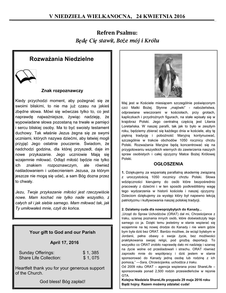 V NIEDZIELA WIELKANOCNA, 24 KWIETNIA 2016 Refren Psalmu: Będę Cię sławił, Boże mój i Królu Rozważania Niedzielne Znak rozpoznawczy Kiedy przychodzi moment, aby pożegnać się ze swoimi bliskimi, to nie ma już czasu na jakieś zbędne słowa. Mówi się wówczas tylko to, co jest naprawdę najważniejsze, żywiąc nadzieję, że wypowiadane słowa pozostaną na trwałe w pamięci i sercu bliskiej osoby. Ma to być swoisty testament duchowy. Tak właśnie Jezus żegna się ze swymi uczniami, których nazywa dziećmi, aby łatwiej mogli przyjąć Jego ostatnie pouczenie. Świadom, że nadchodzi godzina, dla której przyszedł, daje im nowe przykazanie. Jego uczniowie Mają się wzajemnie miłować. Odtąd miłość będzie nie tylko ich znakiem rozpoznawczym, ale również naśladowaniem i uobecnieniem Jezusa, za którym jeszcze nie mogą się udać, a sam Bóg dozna przez to chwały. Jezu, Twoje przykazanie miłości jest rzeczywiście nowe. Mam kochać nie tylko nade wszystko, z całych sił i jak siebie samego. Mam miłować tak, jak Ty umiłowałeś mnie, czyli do końca. Your gift to God and our Parish April 17, 2016 Sunday Offerings: Share Life Collection: $ 1, 385 $ 1, 075 Heartfelt thank you for your generous support of the Church. God bless! Bóg zapłać! Maj jest w Kościele miesiącem szczególnie poświęconym czci Matki Bożej. Słynne „majówki” - nabożeństwa, odprawiane wieczorami w kościołach, przy grotach, kapliczkach i przydrożnych figurach, na stałe wpisały się w krajobraz Polski. Jego centralną częścią jest Litania Loretańska. W naszej parafii, tak jak to było w zeszłym roku, będziemy zbierać się każdego dnia w kościele, aby tę piękną tradycję i pobożność Maryjną kontynuować, szczególnie w trakcie obchodów 1050 rocznicy chrztu Polski. Rozważania Maryjne będą koncentrować się na przygotowaniu wszystkich wiernych do zawierzenia naszych spraw osobistych i całej ojczyzny Matce Bożej Królowej Polski. OGŁOSZENIA 1. Dziękujemy za wspaniałą parafialną akademię związaną z uroczystością 1050 rocznicy chrztu Polski. Słowa wdzięczności kierujemy do osób które bezpośrednio pracowały z dziećmi i w ten sposób podkreśliliśmy wagę tego wydzarzenia w historii kościoła i naszej ojczyzny. Dzieciom dziękujemy za występ który był napewno lekcją patriotyzmu i kultywowania naszej polskiej tradycji. 2. Działamy cuda dla nowoprzybyłych do Kanady... „Urząd do Spraw Uchodźców (ORAT) dał mi, Chrześcijance z Iraku, szansę poznania innych osób, które doświadczyły tego samego co ja. Dzięki temu jesteśmy w stanie wspierać się wzajemnie na tej nowej drodze do Kanady i nie wiem gdzie bym była dziś bez ORAT. Bardzo możliwe, że wciąż byłabym w Jordanii, pełna obawy o swoje życie, bez możliwości praktykowania swojej religii, pod groźbą deportacji. To wszystko co ORAT zrobiło naprawdę dało mi nadzieję i szansę na życie wolne od prześladowań i strachu. ORAT również zaprosiło mnie do współpracy i dziś jestem w stanie sponsorować do Kanady jedną osobę lub rodzinę z ich pomocą.” —Sara, Chrześcijanka, uchodźca z Iraku. Od 2009 roku ORAT – agencja wspierana przez ShareLife – sponsorowała ponad 2,500 rodzin przesiedleńców w rejonie GTA. Kolejna Niedziela ShareLife przypada 29 maja 2016 roku Bądź hojny. Razem możemy zdziałać cuda! 5th SUNDAY OF EASTER, APRIL 24, 2016 Psalm Refrain: I will bless your name forever, my king and my God Reflection ..... Today's Gospel again comes from the Gospel of John. Like last week, today we hear words spoken by Jesus before his death and Resurrection. Jesus is teaching at the Last Supper. John's Gospel does not include an institution of the Eucharist narrative; instead, Jesus washes his disciples' feet. Immediately after, Jesus predicts his betrayal by Judas. Today's Gospel follows that prediction. It can be read as a continuing explanation of Jesus' act of washing his disciples' feet. It begins with the announcement that this is the moment when the Son of Man will be glorified. This theme continues throughout John's Passion. Jesus will be glorified in his death on the cross and in his Resurrection, and the disciples will glorify Jesus in the love they show. John's Gospel does not present a sentimental view of love. This is a type of love that is shown in service and sacrifice. It is difficult to choose to love when faced with hatred and anger. Jesus tells the disciples that all will know that they are his disciples because of the love they show for one another. This description of the early Christian community will be repeated in the Acts of the Apostles: “See how they love one another.” Christian love is the hallmark of Christianity. We see it lived in the witness of the martyrs. We see it in the example of the lives of the saints. We see it in the holy women and men who live and love daily, making small and large sacrifices for others. On Thursday May 5, 2016, on the Solemnity of the Ascension of the Lord, we will be celebrating Tridentine Mass (in Latin) at 7:00 pm. The Mass is referred to as Solemn High Mass or simply High Mass, and is celebrated by a priest with a deacon and a subdeacon, requiring most of the parts of the Mass to be sung. Our Parish Gregorian choir is going to sing all parts of this Mass. All are welcome to attend. Office of Vocations is hosting ORDINATION PRAYER VIGIL. Let’s pray together for an increase in vocations especially to priesthood, consecrated life and healthy marriages. Event will be held at St. Michael’s Cathedral, 65 Bond St. Toronto on Friday, April 29 from 6pm until midnight. INTENCJE MSZALNE / MASS INTENTIONS Intencja Rodziny Żywego Różańca na miesiąc kwiecień: „O Boże błogosławieństwo, zdrowie, Dary Ducha Świętego dla Ojca Św. Franciszka” Sunday, April 24, 2016 9:00 am For parishioners 11:00 am Za † Emila Rainer w 20 rocznicę śmierci – Od syna z rodziną Za † S