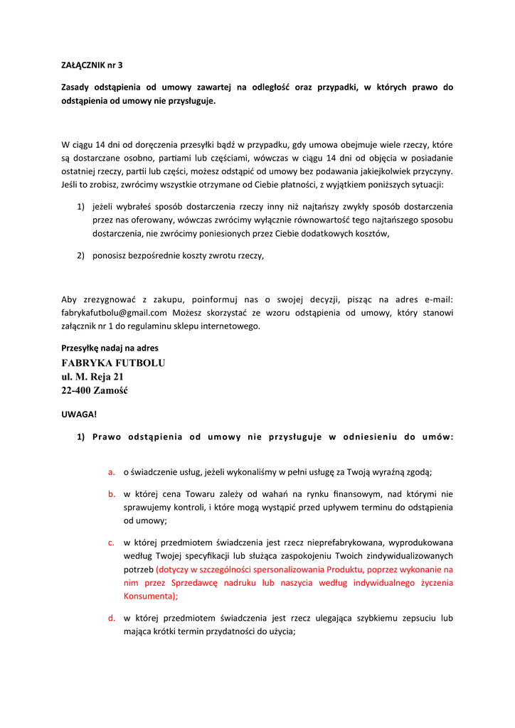 ZAŁĄCZNIK nr 3 Zasady odstąpienia od umowy zawartej na odległość oraz przypadki, w których prawo do odstąpienia od umowy nie przysługuje. W ciągu 14 dni od doręczenia przesyłki bądź w przypadku, gdy umowa obejmuje wiele rzeczy, które są dostarczane osobno, partami lub częściami, wówczas w ciągu 14 dni od objęcia w posiadanie ostatniej rzeczy, parti lub części, możesz odstąpić od umowy bez podawania jakiejkolwiek przyczyny. Jeśli to zrobisz, zwrócimy wszystkie otrzymane od Ciebie płatności, z wyjątkiem poniższych sytuacji: 1) jeżeli wybrałeś sposób dostarczenia rzeczy inny niż najtańszy zwykły sposób dostarczenia przez nas oferowany, wówczas zwrócimy wyłącznie równowartość tego najtańszego sposobu dostarczenia, nie zwrócimy poniesionych przez Ciebie dodatkowych kosztów, 2) ponosisz bezpośrednie koszty zwrotu rzeczy, Aby zrezygnować z zakupu, poinformuj nas o swojej decyzji, pisząc na adres e-mail: [email protected] Możesz skorzystać ze wzoru odstąpienia od umowy, który stanowi załącznik nr 1 do regulaminu sklepu internetowego. Przesyłkę nadaj na adres FABRYKA FUTBOLU ul. M. Reja 21 22-400 Zamość UWAGA! 1) Prawo odstąpienia od umowy nie przysługuje w odniesieniu do umów: a. o świadczenie usług, jeżeli wykonaliśmy w pełni usługę za Twoją wyraźną zgodą; b. w której cena Towaru zależy od wahań na rynku fnansowym, nad którymi nie sprawujemy kontroli, i które mogą wystąpić przed upływem terminu do odstąpienia od umowy; c. w której przedmiotem świadczenia jest rzecz nieprefabrykowana, wyprodukowana według Twojej specyfkacji lub służąca zaspokojeniu Twoich zindywidualizowanych potrzeb (dotyczy w szczególności spersonalizowania Produktu, poprzez wykonanie na nim przez Sprzedawcę nadruku lub naszycia według indywidualnego życzenia Konsumenta); d. w której przedmiotem świadczenia jest rzecz ulegająca szybkiemu zepsuciu lub mająca krótki termin przydatności do użycia; e. w której przedmiotem świadczenia jest rzecz dostarczana w zapieczętowanym opakowaniu, której po otwarciu opakowania nie można zwrócić ze względu na ochronę zdrowia lub ze względów higienicznych, jeżeli opakowanie zostało otwarte po dostarczeniu; f. w której przedmiotem świadczenia są rzeczy, które po dostarczeniu, ze względu na swój charakter, zostają nierozłącznie połączone z innymi rzeczami; g. w której przedmiotem świadczenia są napoje alkoholowe, których cena została uzgodniona przy zawarciu umowy sprzedaży, a których dostarczenie może nastąpić dopiero po upływie 30 dni i których wartość zależy od wahań na rynku, nad którymi nie mamy kontroli; h. w której wyraźnie zażądałeś, abyśmy do Ciebie przyjechali w celu dokonania pilnej naprawy lub konserwacji; w przypadku, gdy świadczymy dodatkowo inne usługi niż te, których wykonania zażądałeś, lub dostarczenia rzeczy innych niż części zamienne niezbędne do wykonania naprawy lub konserwacji, prawo odstąpienia od umowy przysługuje Tobie w odniesieniu do dodatkowych usług lub rzeczy; i. w której przedmiotem świadczenia są nagrania dźwiękowe lub wizualne albo programy komputerowe dostarczane w zapieczętowanym opakowaniu, jeżeli opakowanie zostało otwarte po dostarczeniu; j. dostarczania dzienników, periodyków lub czasopism, z wyjątkiem umowy o prenumeratę, k. zawartych w drodze aukcji publicznej, l. o świadczenie usług w zakresie zakwaterowania, innych niż do celów mieszkaniowych, przewozu rzeczy, najmu samochodów, gastronomii, usług związanych z wypoczynkiem, wydarzeniami rozrywkowymi, sportowymi lub kulturalnymi, jeżeli w umowie oznaczono dzień lub okres świadczenia usługi; m. dostarczanie treści cyfrowych, które nie są zapisane na nośniku materialnym, jeżeli spełnianie świadczenia rozpoczęło się za wyraźną Twoją zgodą, przed upływem terminu do odstąpienia od umowy.