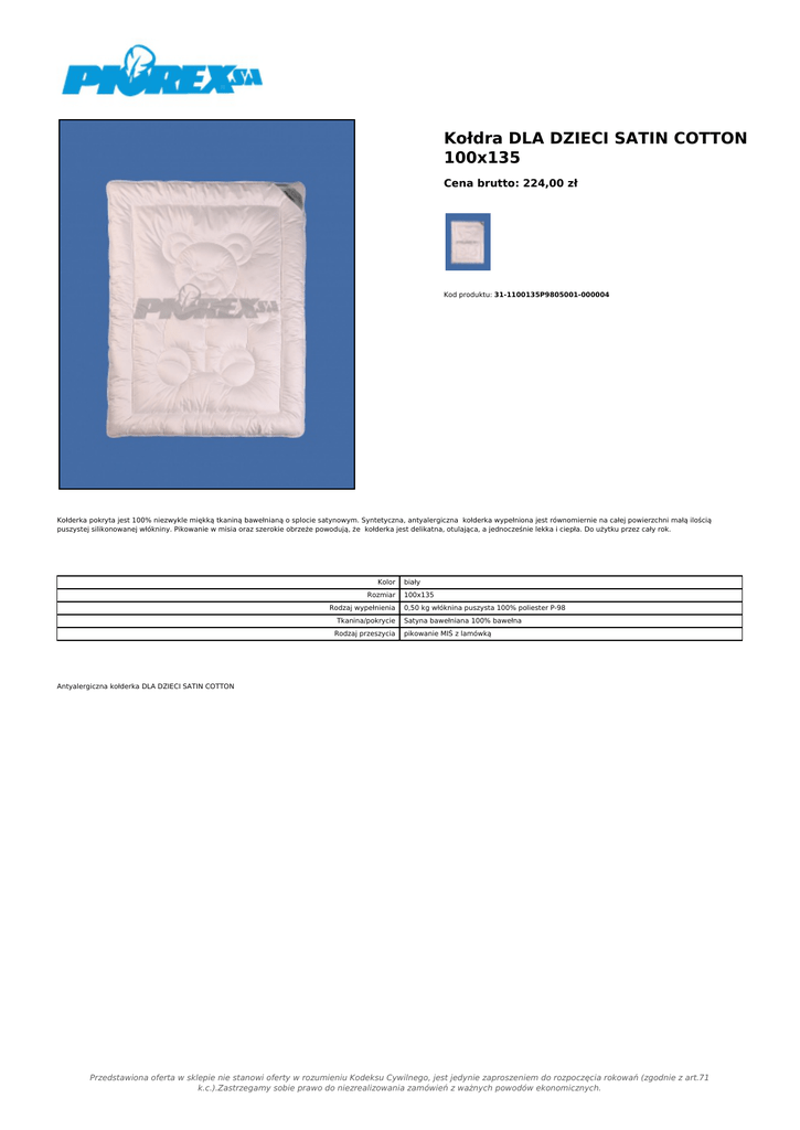 Kołdra DLA DZIECI SATIN COTTON 100x135 Cena brutto: 224,00 zł Kod produktu: 31-1100135P9805001-000004 Kołderka pokryta jest 100% niezwykle miękką tkaniną bawełnianą o splocie satynowym. Syntetyczna, antyalergiczna kołderka wypełniona jest równomiernie na całej powierzchni małą ilością puszystej silikonowanej włókniny. Pikowanie w misia oraz szerokie obrzeże powodują, że kołderka jest delikatna, otulająca, a jednocześnie lekka i ciepła. Do użytku przez cały rok. Kolor Rozmiar Rodzaj wypełnienia Tkanina/pokrycie Rodzaj przeszycia biały 100x135 0,50 kg włóknina puszysta 100% poliester P-98 Satyna bawełniana 100% bawełna pikowanie MIŚ z lamówką Antyalergiczna kołderka DLA DZIECI SATIN COTTON Przedstawiona oferta w sklepie nie stanowi oferty w rozumieniu Kodeksu Cywilnego, jest jedynie zaproszeniem do rozpoczęcia rokowań (zgodnie z art.71 k.c.).Zastrzegamy sobie prawo do niezrealizowania zamówień z ważnych powodów ekonomicznych. Powered by TCPDF (www.tcpdf.org)