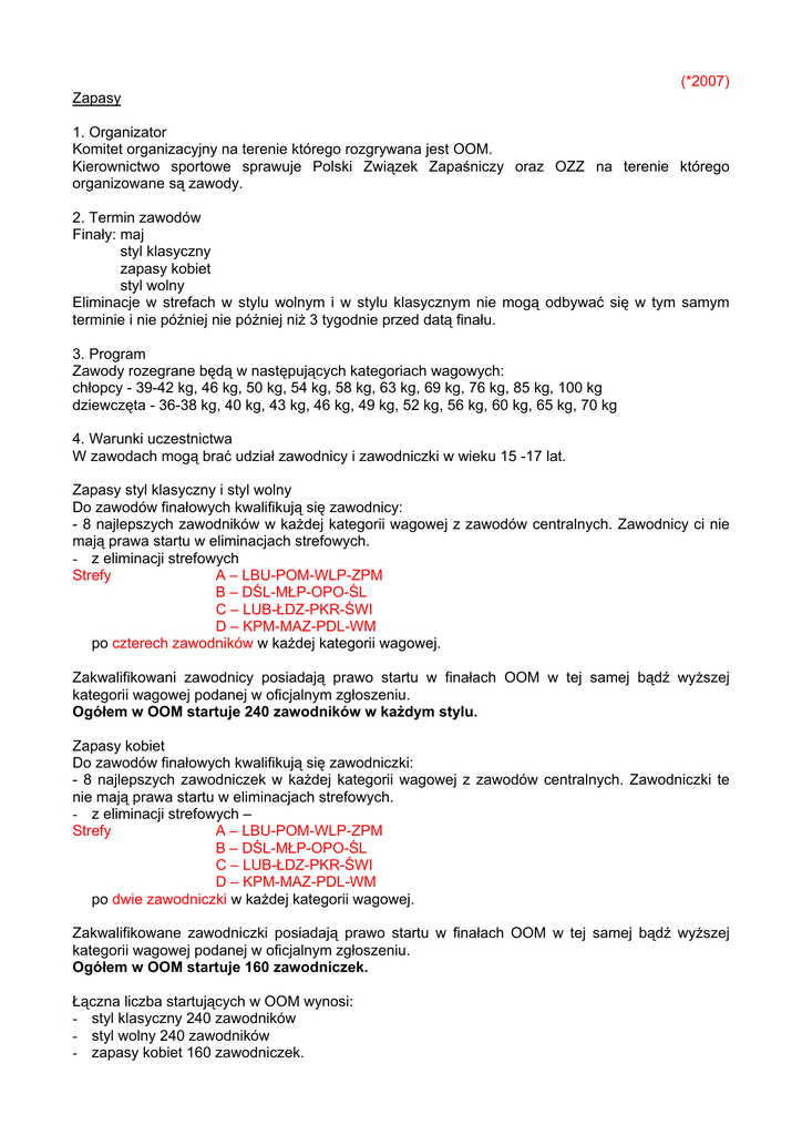 (*2007) Zapasy 1. Organizator Komitet organizacyjny na terenie którego rozgrywana jest OOM. Kierownictwo sportowe sprawuje Polski Związek Zapaśniczy oraz OZZ na terenie którego organizowane są zawody. 2. Termin zawodów Finały: maj styl klasyczny zapasy kobiet styl wolny Eliminacje w strefach w stylu wolnym i w stylu klasycznym nie mogą odbywać się w tym samym terminie i nie później nie później niż 3 tygodnie przed datą finału. 3. Program Zawody rozegrane będą w następujących kategoriach wagowych: chłopcy - 39-42 kg, 46 kg, 50 kg, 54 kg, 58 kg, 63 kg, 69 kg, 76 kg, 85 kg, 100 kg dziewczęta - 36-38 kg, 40 kg, 43 kg, 46 kg, 49 kg, 52 kg, 56 kg, 60 kg, 65 kg, 70 kg 4. Warunki uczestnictwa W zawodach mogą brać udział zawodnicy i zawodniczki w wieku 15 -17 lat. Zapasy styl klasyczny i styl wolny Do zawodów finałowych kwalifikują się zawodnicy: - 8 najlepszych zawodników w każdej kategorii wagowej z zawodów centralnych. Zawodnicy ci nie mają prawa startu w eliminacjach strefowych. - z eliminacji strefowych Strefy A – LBU-POM-WLP-ZPM B – DŚL-MŁP-OPO-ŚL C – LUB-ŁDZ-PKR-ŚWI D – KPM-MAZ-PDL-WM po czterech zawodników w każdej kategorii wagowej. Zakwalifikowani zawodnicy posiadają prawo startu w finałach OOM w tej samej bądź wyższej kategorii wagowej podanej w oficjalnym zgłoszeniu. Ogółem w OOM startuje 240 zawodników w każdym stylu. Zapasy kobiet Do zawodów finałowych kwalifikują się zawodniczki: - 8 najlepszych zawodniczek w każdej kategorii wagowej z zawodów centralnych. Zawodniczki te nie mają prawa startu w eliminacjach strefowych. - z eliminacji strefowych – Strefy A – LBU-POM-WLP-ZPM B – DŚL-MŁP-OPO-ŚL C – LUB-ŁDZ-PKR-ŚWI D – KPM-MAZ-PDL-WM po dwie zawodniczki w każdej kategorii wagowej. Zakwalifikowane zawodniczki posiadają prawo startu w finałach OOM w tej samej bądź wyższej kategorii wagowej podanej w oficjalnym zgłoszeniu. Ogółem w OOM startuje 160 zawodniczek. Łączna liczba startujących w OOM wynosi: - styl klasyczny 240 zawodników - styl wolny 240 zawodników - zapasy kobiet 160 zawodniczek. Uwaga!. W przypadku mniejszej ilości zawodników/zawodniczek Komisja Sportowa PZZ na wniosek Wydziału Wyszkolenia PZZ może uzupełnić listę startową o kolejnych zawodników/czki z listy rankingowej pod warunkiem udziału ich w eliminacjach centralnych bądź strefowych do OOM. Sędzia Główny i wyznaczony przedstawiciel Komisji Sportowej PZZ na zawodach OOM mogą dopuścić zawodnika/czkę rezerwowego, w przypadku kontuzji lub choroby zawodnika/czki zakwalifikowanego w ramach limitu miejsc danego województwa i pod warunkiem udziału zawodnika/czki rezerwowego w eliminacjach centralnych lub strefowych. 5. Sposób przeprowadzenia zawodów Zawody zostaną przeprowadzone na trzech matach wg przepisów FILA. Na każdą matę organizator jest zobowiązany przygotować zestaw video (kamera, monitor) do analizy oceny walki. Program (chłopcy) 3 maty przyjazd do kolacji, weryfikacja, konferencja techniczna, kontrola medyczna, waga, losowanie I dzień - walki eliminacyjne i finałowe w kategoriach wagowych: 39-42, 50, 58, 69, 85 kg II dzień - walki eliminacyjne i finałowe w kategoriach wagowych: 46, 54, 63, 76, 100 kg. III dzień - wyjazd po śniadaniu liczba uczestników: zawodników-240, trenerów-50, sędziów-26 (8 na matę+SG+z-ca SG), pzs-2 Program (dziewczęta) 2 maty przyjazd do kolacji, weryfikacja, konferencja techniczna, kontrola medyczna, waga, losowanie I dzień - walki eliminacyjne i finałowe w kategoriach wagowych: 36-38, 43, 49, 56, 65 kg II dzień - walki eliminacyjne i finałowe w kategoriach wagowych: 40, 46, 52, 60, 70 kg. III dzień - wyjazd po śniadaniu liczba uczestników: zawodniczek-160, trenerów-35, sędziów-18 (8 na matę+SG+z-ca SG), pzs-1 6. Zgłoszenia Zgłoszenie do zawodów należy nadsyłać w terminie określonym w komunikacie organizacyjnym Nr 1 dla danej imprezy. 7. Punktacja dziewczęta, chłopcy Lok. 1 2 3-4 5-6 7-8 9-10 11-12 13-16 PKT 9 7 6 5 4 3 2 1 60 D. System ocen Zapasy styl klasyczny I. Młodzieżowe Mistrzostwa Polski M-21-23 lata 1. Program 50-55 kg, 60 kg, 66 kg, 74 kg, 84 kg, 96 kg, 120 kg 2. Punktacja Lok. 1 2 3-4 5-6 7 8 PKT 25 21 17 13 10 8 124 II. Mistrzostwa Polski Juniorów M-18-20 lat 1. Program 46-50 kg, 55 kg, 60 kg, 66 kg, 74 kg, 84 kg, 96 kg, 120 kg 2. Punktacja Lok. 1 2 3-4 5-6 7 8 PKT 15 12 9 6 3 2 62 III. Olimpiada Młodzieży - Mistrzostwa Polski Juniorów młodszych (kadeci) M-15-17 lat 1. Program 39-42 kg, 46 kg, 50 kg, 54 kg, 58 kg, 63 kg, 69 kg, 76 kg, 85 kg, 100 kg 2. Punktacja Lok. 1 2 3-4 5-6 7-8 9-10 11-12 13-16 PKT 9 7 6 5 4 3 2 1 60 Eliminacje do OOM – strefy + zawody centralne Strefy A – LBU-POM-WLP-ZPM C – LUB-ŁDZ-PKR-ŚWI B – DŚL-MŁP-OPO-ŚL D – KPM-MAZ-PDL-WM IV. Międzywojewódzkie Mistrzostwa Młodzików M-13-14 lat 1. Program 29-32 kg, 35 kg, 38 kg, 42 kg, 47 kg, 53 kg, 59 kg, 66 kg, 73 kg, 85 kg 2. Punktacja Lok. 1 2-4 5-6 7 PKT 3 2 2 1 14 Strefy A – LBU-POM-WLP-ZPM C – LUB-ŁDZ-PKR-ŚWI B – DŚL-MŁP-OPO-ŚL D – KPM-MAZ-PDL-WM Koordynatorzy stref Strefa A LBU POM WLP ZPM Strefa C LUB ŁDZ PKR ŚWI w 2007 roku w 2008 roku w 2009 roku w 2010 roku w 2007 roku w 2008 roku w 2009 roku w 2010 roku E. Roczniki młodzieżowcy juniorzy juniorzy młodsi młodzicy 21-23 lata (w 2007 roku urodzeni 01.01.1984 – 31.12.1986) 18-20 lat (w 2007 roku urodzeni 01.01.1987 – 31.12.1989) 15-17 lat (w 2007 roku urodzeni 01.01.1990 – 31.12.1992) 13-14 lat (w 2007 roku urodzeni 01.01.1993 – 31.12.1994) Strefa B Strefa D DŚL MŁP OPO ŚL KPM MAZ PDL WM w 2007 roku w 2008 roku w 2009 roku w 2010 roku w 2007 roku w 2008 roku w 2009 roku w 2010 roku Zapasy kobiet I. Młodzieżowe Mistrzostwa Polski 1. Program 44-48 kg, 55 kg, 63 kg, 72 kg 2. Punktacja Lok. 1 2 3-4 5-6 7 8 PKT 25 21 17 13 10 8 124 M-21-23 lata II. Mistrzostwa Polski Juniorek K - 18-20 lat 1. Program 40-44 kg, 48 kg, 51 kg, 55 kg, 59 kg, 63 kg, 67 kg, 72 