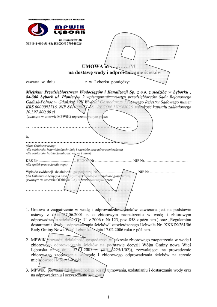 ul. Pionierów 2b NIP 841-000-51-88; REGON 770548026 UMOWA nr …./……/M na dostawę wody i odprowadzanie ścieków zawarta w dniu ………………. r. w Lęborku pomiędzy: Miejskim Przedsiębiorstwem Wodociągów i Kanalizacji Sp. z o.o. z siedzibą w Lęborku , 84-300 Lębork ul. Pionierów 2 wpisanym do rejestru przedsiębiorców Sądu Rejonowego Gadńsk-Północ w Gdańsku, VIII Wydział Gospodarczy Krajowego Rejestru Sądowego numer KRS 0000092716, NIP 841-000-51-88, REGON 770548026, wysokość kapitału zakładowego 20.397.800,00 zł (zwanym w umowie MPWiK) reprezentowanym przez: 1. ………………………………………………………….. a, …………………………………………………………….. (dane Odbiorcy usług: -dla odbiorców indywidualnych: imię i nazwisko oraz adres zamieszkania -dla odbiorców instytucjonalnych: nazwa i adres) KRS Nr ......................................... REGON Nr ………………….……… NIP Nr……………………………… (dla spółek prawa handlowego) Wpis do ewidencji działalności gospodarczej Nr............................................ NIP Nr ………………… (dla Odbiorców będących osoba fizyczną prowadząca działalność gospodarczą) (zwanym w umowie ODBIORCĄ) reprezentowanym przez: ……………………………………………………………….. §1 1. Umowa o zaopatrzenie w wodę i odprowadzanie ścieków zawierana jest na podstawie ustawy z dnia 07.06.2001 r. o zbiorowym zaopatrzeniu w wodę i zbiorowym odprowadzaniu ścieków (Dz. U. z 2006 r. Nr 123, poz. 858 z późn. zm.) oraz „Regulaminu dostarczania wody i odprowadzania ścieków” zatwierdzonego Uchwałą Nr XXXIX/261/06 Rady Gminy Nowa Wieś Lęborska z dnia 17.02.2006 roku z póź. zm. 2. MPWiK prowadzi działalność gospodarczą w zakresie zbiorowego zaopatrzenia w wodę i zbiorowego odprowadzania ścieków na podstawie decyzji Wójta Gminy nowa Wieś Lęborska nr z dnia 07.01.2003 r. (RR 6225/1/02)), zezwalającej na prowadzenie zbiorowego zaopatrzenia w wodę i zbiorowego odprowadzania ścieków na terenie miejscowości Mosty i Rybki. 3. MPWiK prowadzi działalność polegającą na ujmowaniu, uzdatnianiu i dostarczaniu wody oraz na odprowadzaniu i oczyszczaniu ścieków. 1 4. MPWiK świadczy usługi w miejscowości Mosty i Rybki, znajdujące się na terenie Gminy Nowa Wieś Lęborska. 5. MPWiK zobowiązane jest w szczególności do zapewnienia wysokiej jakości świadczonych usług, niezawodności zbiorowego zaopatrzenia w wodę i zbiorowego odprowadzania ścieków, przestrzegania wymagań ograniczania szkodliwego oddziaływania na środowisko i utrzymania możliwie niskich kosztów prowadzenia działalności objętej zezwoleniem. 6. MPWiK zobowiązane jest zapewnić zdolność posiadanych urządzeń do realizacji dostaw wody do odbiorców w wymaganych ilościach i pod odpowiednim ciśnieniem oraz dostawy wody i odprowadzania ścieków w sposób ciągły i niezawodny, a także zapewnić należytą jakość dostarczonej wody i odprowadzanych ścieków. 7. MPWiK zobowiązane jest do spełniania wymagań dotyczący jakości wody przeznaczonej do spożycia przez ludzi, w tym wymagań bakteriologicznych, fizykochemicznych i organoleptycznych określonych rozporządzeniem ministra właściwego do spraw zdrowia w porozumieniu z ministrem właściwym do spraw gospodarki wodnej. 9. MPWiK zobowiązane jest do prowadzenia systematycznej kontroli jakości dostarczanej wody. 10. MPWiK zobowiązane jest do prowadzenia dokumentacji jakości świadczonych usług. 11 Wójt Gminy Nowa Wieś Lęborska uprawniony jest do przeprowadzania kontroli działalności MPWiK zwłaszcza, gdy zostaną zgłoszone przez odbiorców usług istotne nieprawidłowości w jego działalności 12 MPWiK zobowiązane jest do zapewnienia zdolności posiadanych urządzeń wodociągowych do realizacji dostaw w wymaganych ilościach. 13. W przypadku niedoboru wody spowodowanego niedostateczną wydajnością ujęć lub ograniczoną przepustowością sieci wodociągowych, MPWiK zobowiązane jest do opracowania i wdrożenia programu dostaw wody w warunkach występowania jej niedoboru, uwzględniającego rotacyjne ograniczenia lub przerwy w dostawach wody dla poszczególnych rejonów gminy, jak również poprzez ograniczenie zużycia wody na inne cele, niż zaopatrzenie ludności. 14 MPWiK zobowiązane jest do prowadzenia działalności w zakresie zbiorowego zaopatrzenia w wodę i zbiorowego odprowadzania ścieków w sposób zapewniający optymalizację kosztów oraz opłat za świadczone usługi. 15. MPWiK zobowiązane jest do uwzględnienia przedsięwzięć racjonalizujących zużycie wody oraz odprowadzenie ścieków w wieloletnich planach rozwoju i modernizacji urządzeń wodociągowych i kanalizacyjnych. 16. Zezwolenie może być cofnięte MPWiK bez odszkodowania w następujących przypadkach: a) w związku z ewidentnym naruszeniem obowiązków wynikających z zezwolenia b) gdy przemawia za tym ważny interes państwa lub wynika to z realizacji przepisów o obronności i bezpieczeństwie państwa c) utraty przez MPWiK zdolności wykonywania zadań objętych zezwoleniem d) upadłości, bądź likwidacji przedsiębiorstwa e) gdy cofnięcie zezwolenia następuje na wniosek przedsiębiorstwa. §2 Umowa określa warunki dostawy wody z urządzeń zaopatrzenia w wodę oraz odprowadzania ścieków do urządzeń kanalizacyjnych eksploatowanych przez MPWiK i zasady rozliczania należności za świadczenia będące jej przedmiotem w odniesieniu do obiektów położonych w Mostach ul. …………………… §3 Do obowiązków MPWiK należy : 1. Dostarczanie w sposób ciągły wody do nieruchomości będącej w posiadaniu ODBIORCY zgodnie z warunkami technicznymi przyłączenia. 2 2. Dostarczanie wody odpowiadającej wymogom wynikającym z obowiązujących przepisów tj. Rozporządzeniem Ministra Zdrowia z dnia z dnia 29 marca 2007r. w sprawie jakości 