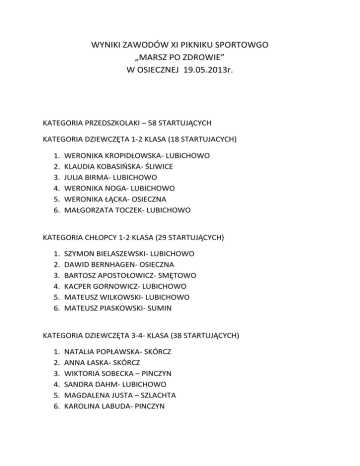 WYNIKI ZAWODÓW XI PIKNIKU SPORTOWGO „MARSZ PO ZDROWIE” W OSIECZNEJ 19.05.2013r. KATEGORIA PRZEDSZKOLAKI – 58 STARTUJĄCYCH KATEGORIA DZIEWCZĘTA 1-2 KLASA (18 STARTUJACYCH) 1. 2. 3. 4. 5. 6. WERONIKA KROPIDŁOWSKA- LUBICHOWO KLAUDIA KOBASIŃSKA- ŚLIWICE JULIA BIRMA- LUBICHOWO WERONIKA NOGA- LUBICHOWO WERONIKA ŁĄCKA- OSIECZNA MAŁGORZATA TOCZEK- LUBICHOWO KATEGORIA CHŁOPCY 1-2 KLASA (29 STARTUJĄCYCH) 1. 2. 3. 4. 5. 6. SZYMON BIELASZEWSKI- LUBICHOWO DAWID BERNHAGEN- OSIECZNA BARTOSZ APOSTOŁOWICZ- SMĘTOWO KACPER GORNOWICZ- LUBICHOWO MATEUSZ WILKOWSKI- LUBICHOWO MATEUSZ PIASKOWSKI- SUMIN KATEGORIA DZIEWCZĘTA 3-4- KLASA (38 STARTUJĄCYCH) 1. 2. 3. 4. 5. 6. NATALIA POPŁAWSKA- SKÓRCZ ANNA ŁASKA- SKÓRCZ WIKTORIA SOBECKA – PINCZYN SANDRA DAHM- LUBICHOWO MAGDALENA JUSTA – SZLACHTA KAROLINA LABUDA- PINCZYN KATEGORIA CHŁOPCY 3-4 KLASA (38 STARTUJĄCYCH) 1. 2. 3. 4. 5. 6. ŁUKASZ PIASKOWSKI – SUMIN MICHAŁ BŁAWAT- NOWA KARCZMA KRZYSZTOF WIERZBOWSKI- ŚLIWICE SEBASTIAN KOLASIŃSKI- ŚŁIWICE SZYMON CZAPIEWSKI- LUBICHOWO MATEUSZ SUCHOMSKI – OSIECZNA KATEGORIA DZIEWCZĘTA 5-6 KLASA (33 STARTUJĄCYCH) 1. 2. 3. 4. 5. 6. MONIKA DUBIELLA- LUBICHOWO AMELIA FIJAŁ LUBICHOWO PAULINA PREKOP- LUBICHOWO WERONIKA KOPRAWSKA- PINCZYN PATRYCJA GUZENDA- PINCZYN DOMINIKA MIERZEJEWSKA- ŚLIWICE KATEGORIA CHŁOPCY 5-6 KLASA (30 STARTUJĄCYCH) 1. 2. 3. 4. 5. 6. OSKAR KLEIN- DĄBRÓWKA SZYMON KOLASIŃSKI- OSIECZNA DOMINIK LEWANDOWSKI LUBICHOWO MIKOŁAJ DUBIELA – ŚLIWICE ARTUR SZWOCH- SZLACHTA BARTOSZ GLAZER- LUBICHOWO KATEGORIA DZIEWCZĘTA GIMNAZJUM (30 STARTUJĄCYCH) 1. JUSTYNA GUZIŃSKA- PINCZYN 2. ZUZANNA CZAJA – OSIECZNA 3. ANNA CZAPIEWSKA- LUBICHOWO 4. SANDRA KURSZEWSKA- PINCZYN 5. WIKTORIA JANKOWSKA- KALISKA 6. NATALIA RÓŻEWICZ- KALISKA KATEGORIA CHŁOPCY GIMNAZJUM (40 STARTUJĄCYCH) 1. MIKOŁAJ DZIENNIAK- LUBICHOWO 2. DAWID JEDWABNIK- SMĘTOWO 3. ARKADIUSZ RÓŻEK – KALISKA 4. JAKUB KOLASIŃSKI – OSIECZNA 5. ŁUKASZ KUTELA- KALISKA 6. JAKUB STOSIK – STAROGARD GD. KATEGORIA CHÓD DZIEWCZĘTA 3-4 KLASA ( 12 STARTUJĄCYCH) 1. MAŁGORZATA CZARNOWSKA- SZLACHTA 2. MAGDALENA JUSTA- SZLACHTA 3. AGATA BARTOS- LUBICHOWO 4. KAROLINA ANDREARCZYK- OSIECZNA 5. SANDRA DAHM- LUBICHOWO 6. NATALIA KŁOMSKA- ZELGOSZCZ KATEGORIA CHÓD CHŁOPCY 3-4 KLASA (10 STARTUJĄCYCH) 1. MARCIN STOSIK- OSIECZNA 2. SEBASTIAN KOLASIŃSKI- ŚŁIWICE 3. BŁAŻEJ SZYCA- LUBICHOWO 4. HUBERT KOSECKI- OSIECZNA 5. SEBASTIAN FABISZ- SZLACHTA 6. KRYSTIAN KOLASIŃSKI- SZLACHTA KATEGORIA CHÓD DZIEWCZĘTA 5-6 KLASA (16 STARTUJĄCYCH) 1. MONIKA DUBIELLA- LUBICHOWO 2. KAROLINA WŁOCH- OSIECZNA 3. KAROLINA KROPIDŁOWSKA- OSIECZNA 4. AMELIA FIJAŁ – LUBICHOWO 5. PAULINA ŚMIELEWSKA- ŚLIWICE 6. MARTA CZAJA – OSIECZNA KATEGORIA CHÓD CHŁOPCY 5-6 KLASA (13 STARTUJĄCYCH) 1. BARTOSZ GLAZA- LUBICHOWO 2. DAWID SUCHOMSKI- OSIECZNA 3. JAKUB DULLEK- OSIECZNA 4. ZBIGNIEW ZIEMAN- OSIECZNA 5. BARTOSZ JACHIMCZAK- ŚLIWICE 6. KACPER CHABOWSKI- LUBICHOWO KATEGORIA CHÓD DZIEWCZĘTA GIMNAZJUM ( 7 STARTUJĄCYCH ) 1. ZUZANNA CZAJA- OSIECZNA 2. KORNELIA ANDREARCZYK – OSIECZNA 3. DIANA WŁOCH- OSIECZNA 4. KLAUDIA MALINOWSKA- SZLACHTA 5. JOANNA RÓŻEK- KALISKA 6. NATALIA MOKWA- SZLACHTA KATEGORIA CHÓD CHŁOPCY GIMNAZJUM (18 STARTUJĄCYCH) 1. KACPER KOSECKI – OSIECZNA 2. MICHAŁ STOSIK- OSIECZNA 3. ARKADIUSZ RÓŻEK- KALISKA 4. SEWERYN TREPKOWSKI- OSIECZNA 5. KAROL SZRAMKA- OSIECZNA 6. MIKOŁAJ KOSECKI – OSIECZNA KATEGORIA CHÓD DZIWCZĘTA PONADGIMNAZJALNE (1 STARTUJĄCA) 1. ALEKSANDRA MOMOT- OSIECZNA KATEGORIA CHÓD CHŁOPCY PONADGIMNAZJAL. ( 2 STARTUJĄCYCH) 1. KRYSTIAN ANDREARCZYK – OSIECZNA 2. KRZYSZTOF GRZECA- OSIECZNA KATEGORIA NORDIC WALKING – 21 OSÓB KATEGORIA OPEN [M] (26 STARTUJĄCYCH) 1. DAWID KLEYBORD- SIEROSŁAW 2. TADEUSZ ZBLEWSKI- BYTÓW 3. ANDRZEJ ROGIEWICZ- SZTUM 4. PAWEŁ OCHAL- BDGOSZCZ 5. OSKAR PRZYSIĘŻNY- LĘBORK 6. DANIEL CHUCHAŁA- LĘBORK KATEGORIA OPEN M 40-50 (4 STARTUJĄCYCH) 1. LESZEK ZBLEWSKI- SKORZEWO 2. RADOSŁAW LITERSKI- CZERSK 3. WIESŁAW KIERZKOWSKI- ŚLIWICZKI KATEGORIA OPEN M 50+ (5 STARUJĄCYCH) 1. BOGDAN CEBULA- SZTUM 2. JÓZEF MATEJA- STAROGARD GD. 3. KAZIMIERZ MISZKE- CZERSK KATEGORIA OPEN [K] ( 9 STARTUJĄCYCH) 1. EWELINA PAPROCKA- OBLIWICE 2. WERONIKA WÓJCIK- STAROGARD GD. 3. MONIKA CZAPIEWSKA- KORZEWO KATEGORIA K 40+ (3 STARTUJĄCYCH) 1. CELINA LANDOWSKA- CZERSK 2. GRAŻYNA CZAPIEWSKA- LUBICHOWO 3. HELENA STOSIK – ŚLIWICE MARSZ PO ZDROWIE- 494 STARTUJĄCYCH RAZEM – 965 OSÓB