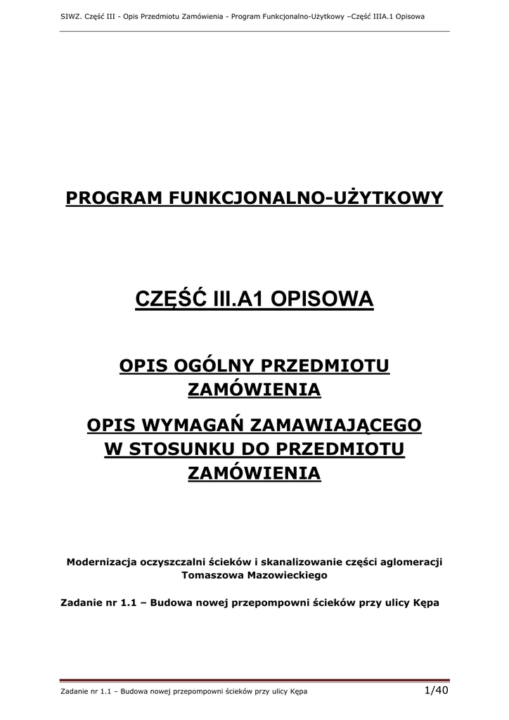 SIWZ. Część III - Opis Przedmiotu Zamówienia - Program Funkcjonalno-Użytkowy –Część IIIA.1 Opisowa PROGRAM FUNKCJONALNO-UŻYTKOWY CZĘŚĆ III.A1 OPISOWA OPIS OGÓLNY PRZEDMIOTU ZAMÓWIENIA OPIS WYMAGAŃ ZAMAWIAJĄCEGO W STOSUNKU DO PRZEDMIOTU ZAMÓWIENIA Modernizacja oczyszczalni ścieków i skanalizowanie części aglomeracji Tomaszowa Mazowieckiego Zadanie nr 1.1 – Budowa nowej przepompowni ścieków przy ulicy Kępa Zadanie nr 1.1 – Budowa nowej przepompowni ścieków przy ulicy Kępa 1/40 SIWZ. Część III - Opis Przedmiotu Zamówienia - Program Funkcjonalno-Użytkowy –Część IIIA.1 Opisowa SPIS TREŚCI CZĘŚĆ III.A.1_Zadanie 1.1 OPISOWA 1. Opis ogólny przedmiotu zamówienia ........................................................... 6 1.1. 1.2. 1.3. Wstęp ................................................................................................................. 6 Zakres i przedmiot zamówienia .............................................................................. 6 Charakterystyczne parametry określające zakres zmówienia ...................................... 6 1.3.1. 1.3.2. 1.3.3. 1.3.4. 1.3.5. 1.3.6. 1.3.7. 1.3.8. 1.3.9. 1.3.10. 1.4. Wstęp .................................................................................................................. 6 Zakres rzeczowy zadania ................................................................................... 7 Zieleń .................................................................................................................. 8 Badania i analizy uzupełniające ......................................................................... 8 Uzgodnienia i decyzje administracyjne.............................................................. 8 Mapy do celów projektowych ............................................................................ 8 Nadzory i uzgodnienia stron trzecich ................................................................. 8 Wizytacja Terenu Budowy ................................................................................. 8 Dostępność terenu budowy ................................................................................ 9 Inwentaryzacja stanu istniejącego. ..................................................................... 9 Aktualne uwarunkowania wykonania przedmiotu zamówienia ..................................... 9 1.4.1. Cel projektu, wykaz prawomocnych decyzji ..................................................... 9 Wykaz prawomocnych decyzji lokalizacyjnych: ............................................................... 9 1.4.2. Inne dokumenty .................................................................................................. 9 1.4.3. Własność ............................................................................................................ 9 1.4.4. Lokalizacja inwestycji ...................................................................................... 10 1.4.5. Opis stanu istniejącego obiektów ciągu technologicznego przepompowni ścieków Kępa ................................................................................................................... 10 1.4.6.1. Opis ogólny ........................................................................................................... 10 1.4.6.2. Komora zbiorcza ścieków OB.1 ................................................................................. 10 1.4.6.3. Komora krat OB.2 .................................................................................................. 10 1.4.6.4. Piaskownik OB.3 .................................................................................................... 10 1.4.6.5. Przepompownia I stopnia OB.4 ................................................................................ 11 1.4.6.6. Komora rozdzielcza OB.5 ......................................................................................... 11 1.4.6.7. Osadnik Dora – OB.6.1, OB.6.2 ................................................................................ 11 1.4.6.8. Przepompownia II stopnia OB.7 ............................................................................... 12 1.4.6.9. Poletka osadowe OB.8.1, OB.8.2 .............................................................................. 12 1.4.6.10. Otwarte baseny fermentacyjne OB.9.1, OB.9.2 ........................................................ 12 1.4.6.11. Przepompownia osadu OB.10 ................................................................................. 12 1.4.6.12. Kanał ścieków wraz z komorą przepędową OB.11 ..................................................... 13 1.4.6.13. Boksy na piasek i skratki OB.12.1, OB.12.2 ............................................................. 13 1.4.6.14. Budynek agregatorowi OB.13 ................................................................................. 13 1.4.6.15. Stacja transformatorowa OB.14 ............................................................................. 14 1.4.6.16. Zasilanie w media ................................................................................................. 14 1.4.6.17. Zagospodarowanie terenu ..................................................................................... 14 1.4.6. 1.4.7. Warunki gruntowo wodne ................................................................................ 15 Ochrona zabytków............................................................................................ 15 1.5. Ogólne właściwości funkcjonalno-użytkowe projektowanej przepompowni ....................... 15 1.5.1.Podstawowe założenia dla nowoprojektowanej przepompowni ścieków przy ul. Kępa OB.101 .................................................................................................................... 15 1.6 Szczegółowe właściwości funkcjonalno-użytkowe ..................................................... 16 1.6.1.Założenia technolog