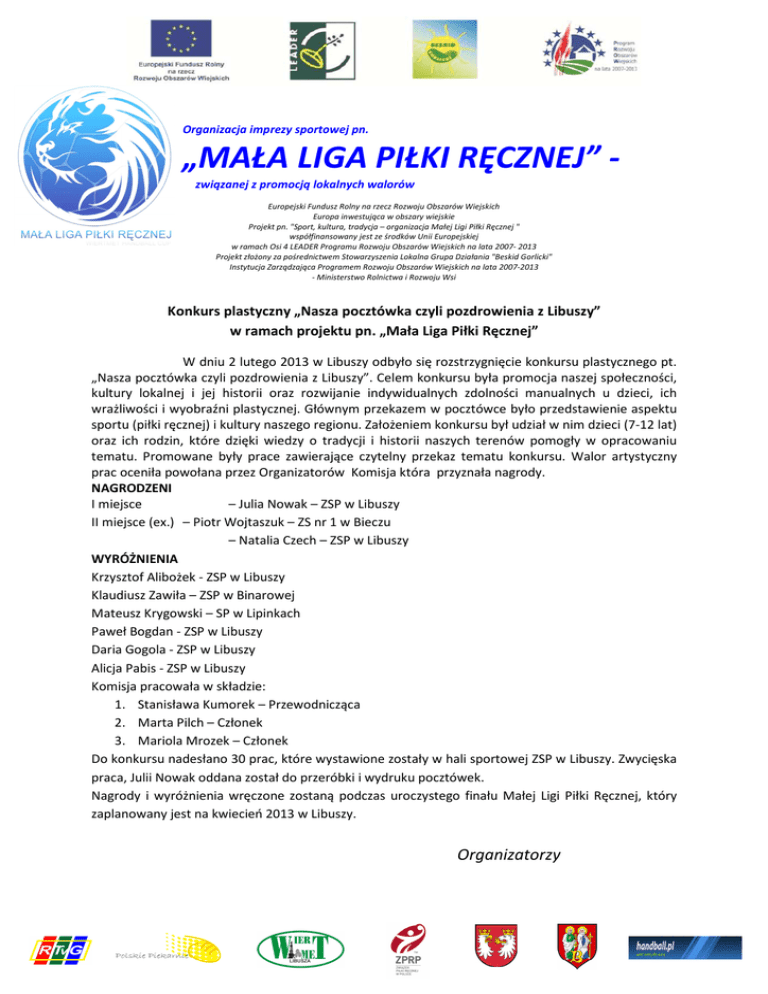 Organizacja imprezy sportowej pn. „MAŁA LIGA PIŁKI RĘCZNEJ” związanej z promocją lokalnych walorów Europejski Fundusz Rolny na rzecz Rozwoju Obszarów Wiejskich Europa inwestująca w obszary wiejskie Projekt pn. "Sport, kultura, tradycja – organizacja Małej Ligi Piłki Ręcznej " współfinansowany jest ze środków Unii Europejskiej w ramach Osi 4 LEADER Programu Rozwoju Obszarów Wiejskich na lata 2007- 2013 Projekt złożony za pośrednictwem Stowarzyszenia Lokalna Grupa Działania "Beskid Gorlicki" Instytucja Zarządzająca Programem Rozwoju Obszarów Wiejskich na lata 2007-2013 - Ministerstwo Rolnictwa i Rozwoju Wsi Konkurs plastyczny „Nasza pocztówka czyli pozdrowienia z Libuszy” w ramach projektu pn. „Mała Liga Piłki Ręcznej” W dniu 2 lutego 2013 w Libuszy odbyło się rozstrzygnięcie konkursu plastycznego pt. „Nasza pocztówka czyli pozdrowienia z Libuszy”. Celem konkursu była promocja naszej społeczności, kultury lokalnej i jej historii oraz rozwijanie indywidualnych zdolności manualnych u dzieci, ich wrażliwości i wyobraźni plastycznej. Głównym przekazem w pocztówce było przedstawienie aspektu sportu (piłki ręcznej) i kultury naszego regionu. Założeniem konkursu był udział w nim dzieci (7-12 lat) oraz ich rodzin, które dzięki wiedzy o tradycji i historii naszych terenów pomogły w opracowaniu tematu. Promowane były prace zawierające czytelny przekaz tematu konkursu. Walor artystyczny prac oceniła powołana przez Organizatorów Komisja która przyznała nagrody. NAGRODZENI I miejsce – Julia Nowak – ZSP w Libuszy II miejsce (ex.) – Piotr Wojtaszuk – ZS nr 1 w Bieczu – Natalia Czech – ZSP w Libuszy WYRÓŻNIENIA Krzysztof Alibożek - ZSP w Libuszy Klaudiusz Zawiła – ZSP w Binarowej Mateusz Krygowski – SP w Lipinkach Paweł Bogdan - ZSP w Libuszy Daria Gogola - ZSP w Libuszy Alicja Pabis - ZSP w Libuszy Komisja pracowała w składzie: 1. Stanisława Kumorek – Przewodnicząca 2. Marta Pilch – Członek 3. Mariola Mrozek – Członek Do konkursu nadesłano 30 prac, które wystawione zostały w hali sportowej ZSP w Libuszy. Zwycięska praca, Julii Nowak oddana został do przeróbki i wydruku pocztówek. Nagrody i wyróżnienia wręczone zostaną podczas uroczystego finału Małej Ligi Piłki Ręcznej, który zaplanowany jest na kwiecień 2013 w Libuszy. Organizatorzy Polskie Piekarnie