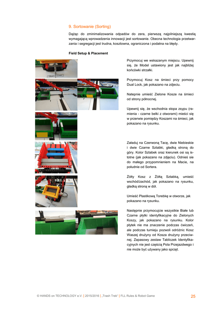 9. Sortowanie (Sorting) Dążąc do zminimalizowania odpadów do zera, pierwszą najpilniejszą kwestią wymagającą wprowadzenia innowacji jest sortowanie. Obecna technologia przetwarzania i segregacji jest trudna, kosztowna, ograniczona i podatna na błędy. Field Setup & Placement Przymocuj we wskazanym miejscu. Upewnij się, że Model ustawiony jest jak najbliżej końcówki strzałki. Przymocuj Kosz na śmieci przy pomocy Dual Lock, jak pokazano na zdjeciu. Natepnie umieść Zielone Kosze na śmieci od strony północnej. Upewnij się, że wschodnia stopa zsypu (ramienia - czarne belki z otworami) mieści się w przerwie pomiędzy Koszami na śmieci, jak pokazano na rysunku. Załaduj na Czerwoną Tacę, dwie Niebieskie i dwie Czarne Sztabki, gładką stroną do góry. Kolor Sztabek oraz kierunek osi są istotne (jak pokazano na zdjęciu). Odnieś sie do małego przypomnieniem na Macie, na południe od Sortera. Żółty Kosz z Żółtą Sztabką, umieść wschód/zachód, jak pokazano na rysunku, gładką stroną w dół. Umieść Plastikową Torebkę w otworze, jak pokazano na rysunku. Następnie przymocujcie wszystkie Białe lub Czarne płytki identyfikacyjne do Zielonych Koszy, jak pokazano na rysunku. Kolor płytek nie ma znaczenie podczas ćwiczeń, ale podczas turnieju pozwoli odróżnic Kosz Waszej drużyny od Kosza drużyny przeciwnej. Zapasowy zestaw Tabliczek Identyfikacyjnych nie jest częścią Pola Przejazdwego i nie może być używany jako sprzęt. © HANDS on TECHNOLOGY e.V. | 2015/2016 | „Trash Trek“ | FLL Rules & Robot Game 25 Misja Opis zadania: Żołte i Niebieskie Sztabki nadają się do recyklingu. Czarne Sztabki to zanieczyszczenia, na których jeszcze nie potrafimy ponownie wykorzytać. Start Koniec-Opcja1-Niebieski/Żółty ŻÓŁTE/NIEBIESKIE SZTABKI SĄ ODPOWIEDNIO W KOSZU NIEBIESKIM I ŻÓŁTYM, A KOSZ ... (sztabki punktowane niezależnie/oddzielnie) OPCJA 1 ...Jest całkowicie w Strefie Bezpieczeństwa drużyny przeciwnej poprzez Obszar Zachodniego Transferu. Punkacja za kosz: 60 OPCJA 2 ...jest całkowice w Obszarze Transferu Zachodniego i/lub całkowicie na Transferze. Koniec Opcja 2 - Niebieskie/Żółte (przykłady) Punktacja za sztabkę: 7 OPCJA 3 ...nigdy nie był cakowicie w Obszarze Transferu Zachodniego. Punktacja za sztabkę: 6 Koniec Opcja 1 - Czarny: Skrzynka na Kwiaty & CZARNE SZTABKI SĄ (sztabki punktowane niezależnie): Oryginalna Pozycja OPCJA 1 ...są częścią Skrzynki na Kwiatki albo pozostały w pierwotnej/ wyjściowej pozycji. Przykład Punktacja za sztabkę: 8 OPCJA 2 ...w odpowienim Zielonym Koszu albo w Kontenerze na Śmieci. Punktów za sztabkę: 3 OPCJA 2 Gdziekolwiek na Macie. Koniec Opcja 2 – czarne (przykład) Minus Points per bar: - 8 Ograniczenia & Ocena: • • Widoczna na koniec Meczu Wszystkie Sztabki muszą być wrzucone bezpośrednio do Zielonych Koszy od Wschodniej Strony Zsypy albo według zasady Przywilej Korzyści z Miisji “Kariera”. 11. Transport Odległość jaką muszą pokonywać wyrzucone materiały jest istotną częścią równania podczas podejmowania decyzji, co zrobić z danym materiałem. © HANDS on TECHNOLOGY e.V. | 2015/2016 | „Trash Trek“ | FLL Rules & Robot Game 26
