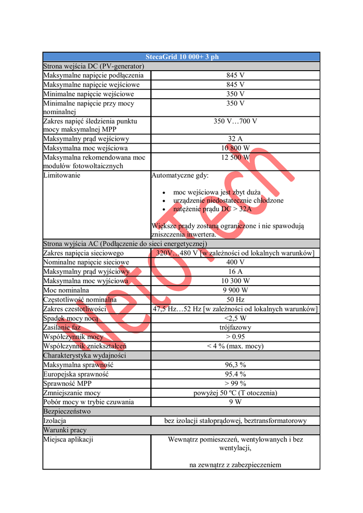 StecaGrid 10 000+ 3 ph Strona wejścia DC (PV-generator) Maksymalne napięcie podłączenia 845 V Maksymalne napięcie wejściowe 845 V Minimalne napięcie wejściowe 350 V Minimalne napięcie przy mocy 350 V nominalnej Zakres napięć śledzienia punktu 350 V…700 V mocy maksymalnej MPP Maksymalny prąd wejściowy 32 A Maksymalna moc wejściowa 10 800 W Maksymalna rekomendowana moc 12 500 W modułów fotowoltaicznych Limitowanie Automatyczne gdy: moc wejściowa jest zbyt duża urządzenie niedostatecznie chłodzone natężenie prądu DC > 32A Większe prądy zostaną ograniczone i nie spawodują zniszczenia inwertera. Strona wyjścia AC (Podłączenie do sieci energetycznej) Zakres napięcia sieciowego 320V…480 V [w zależności od lokalnych warunków] Nominalne napięcie sieciowe 400 V Maksymalny prąd wyjściowy 16 A Maksymalna moc wyjściowa 10 300 W Moc nominalna 9 900 W Częstotliwość nominalna 50 Hz Zakres czestotliwości 47,5 Hz…52 Hz [w zależności od lokalnych warunków] Spadek mocy nocą <2,5 W Zasilanie faz trójfazowy Współczynnik mocy > 0.95 Współczynnik zniekształceń < 4 % (max. mocy) Charakterystyka wydajności Maksymalna sprawność 96,3 % Europejska sprawność 95.4 % Sprawność MPP > 99 % Zmniejszanie mocy powyżej 50 ºC (T otoczenia) Pobór mocy w trybie czuwania 9W Bezpieczeństwo Izolacja bez izolacji stałoprądowej, beztransformatorowy Warunki pracy Miejsca aplikacji Wewnątrz pomieszczeń, wentylowanych i bez wentylacji, na zewnątrz z zabezpieczeniem Temperatura otoczenia Wilgotność otoczenia Emisja hałasu Podłączenie i budowa Stopień ochrony Konektory po stronie DC Konektory po stronie AC Wymiary (wys., szer., gł.) Masa Komunikacja Wyłącznik obwodu DC Chłodzenie Certyfikaty -20 º C…+60 º C 0 %... 95 % < 60 dBA IP 54 MC4 (4 pary) Wtyk Wieland RST25i5 400 x 847 x 225 mm 42 kg StecaGrid Vision interface tak Wentylator sterowany temperaturowo CE