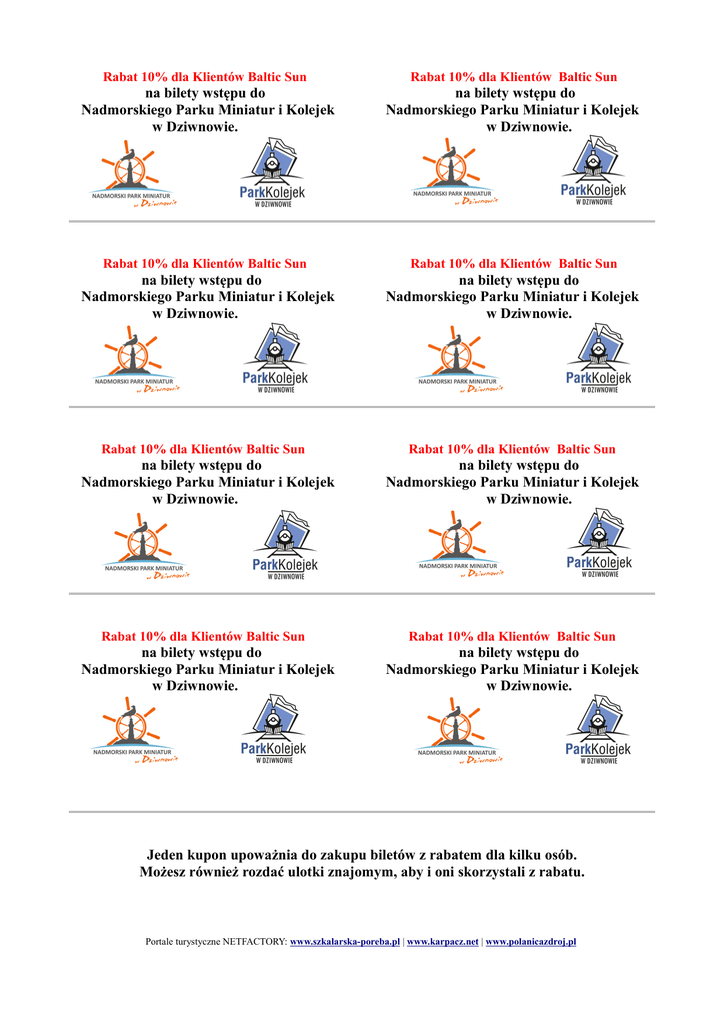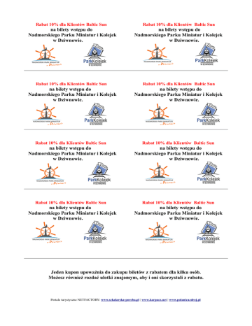 Rabat 10% dla Klientów Baltic Sun Rabat 10% dla Klientów Baltic Sun na bilety wstępu do Nadmorskiego Parku Miniatur i Kolejek w Dziwnowie. na bilety wstępu do Nadmorskiego Parku Miniatur i Kolejek w Dziwnowie. Rabat 10% dla Klientów Baltic Sun Rabat 10% dla Klientów Baltic Sun na bilety wstępu do Nadmorskiego Parku Miniatur i Kolejek w Dziwnowie. na bilety wstępu do Nadmorskiego Parku Miniatur i Kolejek w Dziwnowie. Rabat 10% dla Klientów Baltic Sun na bilety wstępu do Nadmorskiego Parku Miniatur i Kolejek w Dziwnowie. Rabat 10% dla Klientów Baltic Sun na bilety wstępu do Nadmorskiego Parku Miniatur i Kolejek w Dziwnowie. Rabat 10% dla Klientów Baltic Sun na bilety wstępu do Nadmorskiego Parku Miniatur i Kolejek w Dziwnowie. Rabat 10% dla Klientów Baltic Sun na bilety wstępu do Nadmorskiego Parku Miniatur i Kolejek w Dziwnowie. Jeden kupon upoważnia do zakupu biletów z rabatem dla kilku osób. Możesz również rozdać ulotki znajomym, aby i oni skorzystali z rabatu. Portale turystyczne NETFACTORY: www.szkalarska-poreba.pl | www.karpacz.net | www.polanicazdroj.pl