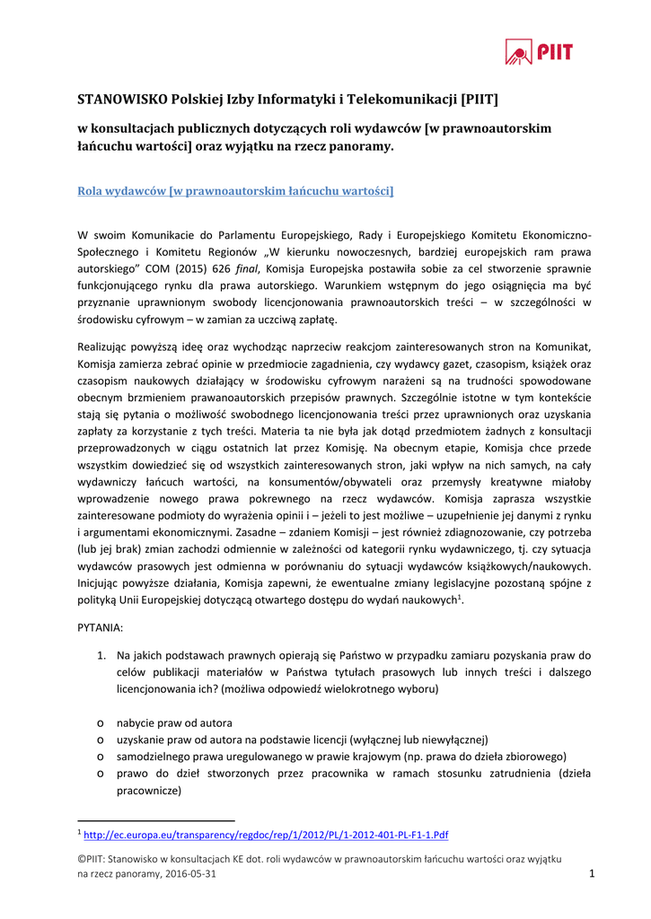 STANOWISKO Polskiej Izby Informatyki i Telekomunikacji [PIIT] w konsultacjach publicznych dotyczących roli wydawców [w prawnoautorskim łańcuchu wartości] oraz wyjątku na rzecz panoramy. Rola wydawców [w prawnoautorskim łańcuchu wartości] W swoim Komunikacie do Parlamentu Europejskiego, Rady i Europejskiego Komitetu EkonomicznoSpołecznego i Komitetu Regionów „W kierunku nowoczesnych, bardziej europejskich ram prawa autorskiego” COM (2015) 626 final, Komisja Europejska postawiła sobie za cel stworzenie sprawnie funkcjonującego rynku dla prawa autorskiego. Warunkiem wstępnym do jego osiągnięcia ma być przyznanie uprawnionym swobody licencjonowania prawnoautorskich treści – w szczególności w środowisku cyfrowym – w zamian za uczciwą zapłatę. Realizując powyższą ideę oraz wychodząc naprzeciw reakcjom zainteresowanych stron na Komunikat, Komisja zamierza zebrać opinie w przedmiocie zagadnienia, czy wydawcy gazet, czasopism, książek oraz czasopism naukowych działający w środowisku cyfrowym narażeni są na trudności spowodowane obecnym brzmieniem prawanoautorskich przepisów prawnych. Szczególnie istotne w tym kontekście stają się pytania o możliwość swobodnego licencjonowania treści przez uprawnionych oraz uzyskania zapłaty za korzystanie z tych treści. Materia ta nie była jak dotąd przedmiotem żadnych z konsultacji przeprowadzonych w ciągu ostatnich lat przez Komisję. Na obecnym etapie, Komisja chce przede wszystkim dowiedzieć się od wszystkich zainteresowanych stron, jaki wpływ na nich samych, na cały wydawniczy łańcuch wartości, na konsumentów/obywateli oraz przemysły kreatywne miałoby wprowadzenie nowego prawa pokrewnego na rzecz wydawców. Komisja zaprasza wszystkie zainteresowane podmioty do wyrażenia opinii i – jeżeli to jest możliwe – uzupełnienie jej danymi z rynku i argumentami ekonomicznymi. Zasadne – zdaniem Komisji – jest również zdiagnozowanie, czy potrzeba (lub jej brak) zmian zachodzi odmiennie w zależności od kategorii rynku wydawniczego, tj. czy sytuacja wydawców prasowych jest odmienna w porównaniu do sytuacji wydawców książkowych/naukowych. Inicjując powyższe działania, Komisja zapewni, że ewentualne zmiany legislacyjne pozostaną spójne z polityką Unii Europejskiej dotyczącą otwartego dostępu do wydań naukowych1. PYTANIA: 1. Na jakich podstawach prawnych opierają się Państwo w przypadku zamiaru pozyskania praw do celów publikacji materiałów w Państwa tytułach prasowych lub innych treści i dalszego licencjonowania ich? (możliwa odpowiedź wielokrotnego wyboru) o o o o 1 nabycie praw od autora uzyskanie praw od autora na podstawie licencji (wyłącznej lub niewyłącznej) samodzielnego prawa uregulowanego w prawie krajowym (np. prawa do dzieła zbiorowego) prawo do dzieł stworzonych przez pracownika w ramach stosunku zatrudnienia (dzieła pracownicze) http://ec.europa.eu/transparency/regdoc/rep/1/2012/PL/1-2012-401-PL-F1-1.Pdf ©PIIT: Stanowisko w konsultacjach KE dot. roli wydawców w prawnoautorskim łańcuchu wartości oraz wyjątku na rzecz panoramy, 2016-05-31 1 o nie ma związku o inne Jeżeli inne, proszę sprecyzować odpowiedź: Proszę wyjaśnić: 2. Czy spotkali się Państwo z problemami dotyczącymi udzielania licencji na korzystanie z materiałów publikowanych w Państwa tytułach prasowych lub innych treści rozpowszechnianych w internecie spowodowanymi faktem, że licencjonowali Państwo albo mieli zamiar licencjonować prawa wcześniej przeniesione na Państwa przez autora (lub uzyskane od autora na podstawie licencji)? o o o o o o tak, często tak, czasami prawie nigdy nigdy nie mam zdania nie ma związku Jeżeli tak, proszę wyjaśnić, jakie to były problemy i przytoczyć przykłady ze wskazaniem na poszczególne państwo członkowskie oraz wskazać rodzaj licencjonowanych treści i licencjobiorcę: 3. Czy spotykali się Państwo z problemami z egzekwowaniem praw związanych z materiałami publikowanymi w Państwa tytułach prasowych albo innych treści rozpowszechnianych w internecie spowodowanymi faktem, że działali Państwo albo mieli zamiar działać w odniesieniu do praw wcześniej przeniesionych na Państwa przez autora (lub uzyskanych od autora na podstawie licencji)? o o o o o o tak, często tak, czasami prawie nigdy nigdy nie mam zdania nie ma związku Jeżeli tak, proszę wyjaśnić jakie to były problemy i przytoczyć przykłady ze wskazaniem na poszczególne państwo członkowskie oraz wskazać rodzaj korzystania i domniemanego naruszenia: 4. Jaki wpływ na wydawców miałoby utworzenie nowego prawa pokrewnego w prawie Unii Europejskiej (w szczególności na możliwość udzielania przez nich licencji i ochronę treści przed naruszeniami, jak również na otrzymanie rekompensaty za korzystanie z utworu na podstawie wyjątku)? ©PIIT: Stanowisko w konsultacjach KE dot. roli wydawców w prawnoautorskim łańcuchu wartości oraz wyjątku na rzecz panoramy, 2016-05-31 2 o o o o o o silny pozytywny wpływ niewielki pozytywny wpływ brak wpływu niewielki negatywny wpływ silny negatywny wpływ nie mam zdania Proszę wyjaśnić: W pierwszej kolejności należy wskazać, iż przejście do modeli biznesowych opartych o nowe technologie, jakkolwiek może wiązać się z pewnymi niedogodnościami dla niedostosowanych uczestników, to jednak stanowi przede wszystkim olbrzymią szansę dla całego sektora kreatywnego. Zgodnie z raportem PwC „The digital future of creative Europe: The impact of digitization and the Internet on the creative industries in Europe”(str. 16)2 niemal całość wzrostu sektora kreatywnego w latach 2003 do 2013 związana jest z produktami i usługami w postaci cyfrowej. Co więcej, przychód sektora wynikających z produktów i usług cyfrowych wzrósł w tym okresie o 36 mld €, gdy spadek przychodu z produktów i usług niecyfrowych wyniósł w tym samym okresie 14 mld €. Powyższe wyraźnie pokazuje, iż 