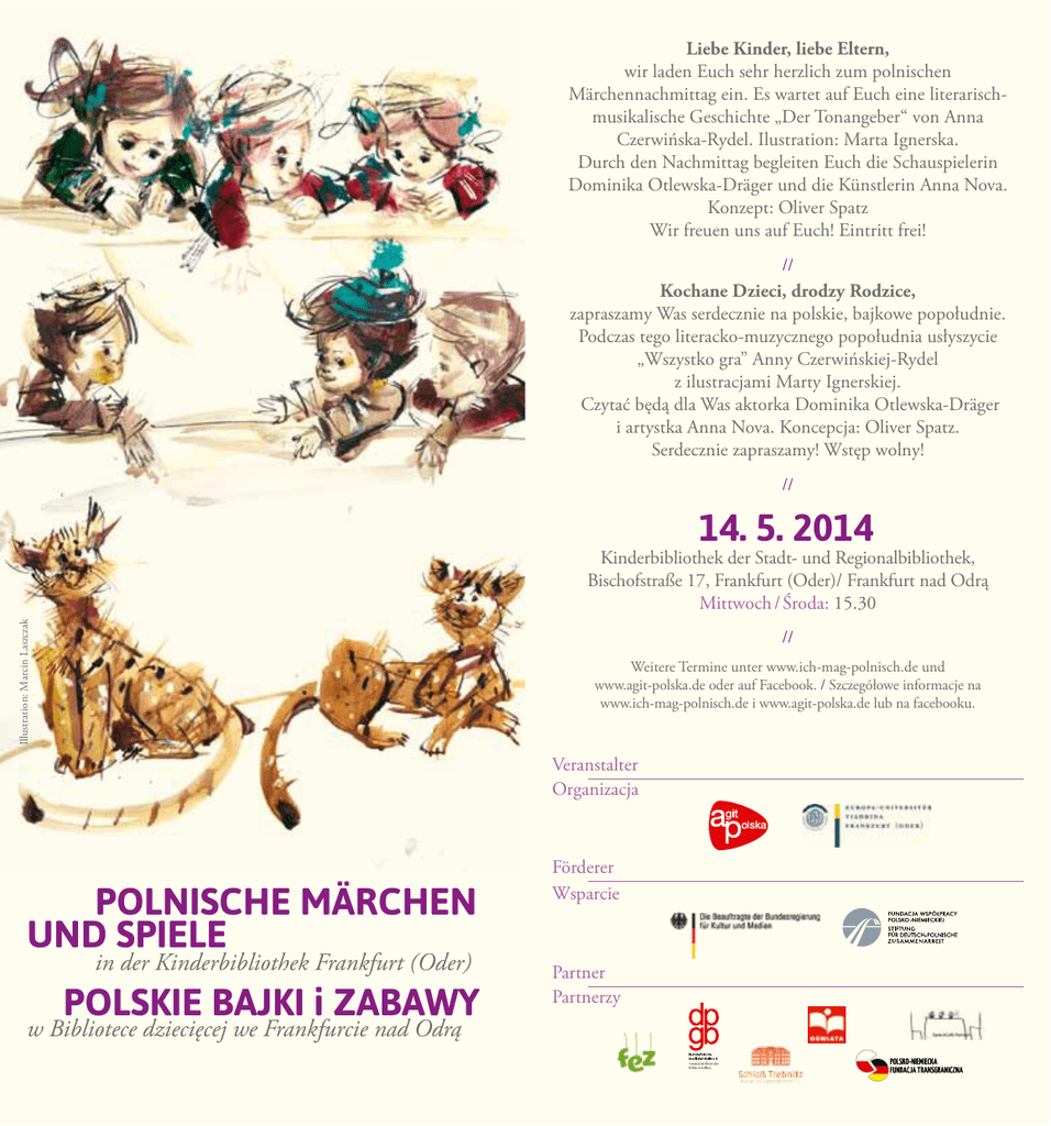Liebe Kinder, liebe Eltern, wir laden Euch sehr herzlich zum polnischen Märchennachmittag ein. Es wartet auf Euch eine literarischmusikalische Geschichte „Der Tonangeber“ von Anna Czerwińska-Rydel. Ilustration: Marta Ignerska. Durch den Nachmittag begleiten Euch die Schauspielerin Dominika Otlewska-Dräger und die Künstlerin Anna Nova. Konzept: Oliver Spatz Wir freuen uns auf Euch! Eintritt frei! // Kochane Dzieci, drodzy Rodzice, zapraszamy Was serdecznie na polskie, bajkowe popołudnie. Podczas tego literacko-muzycznego popołudnia usłyszycie „Wszystko gra” Anny Czerwińskiej-Rydel z ilustracjami Marty Ignerskiej. Czytać będą dla Was aktorka Dominika Otlewska-Dräger i artystka Anna Nova. Koncepcja: Oliver Spatz. Serdecznie zapraszamy! Wstęp wolny! // 14. 5. 2014 Illustration: Marcin Laszczak Kinderbibliothek der Stadt- und Regionalbibliothek, Bischofstraße 17, Frankfurt (Oder)/ Frankfurt nad Odrą Mittwoch / Środa: 15.30 // Weitere Termine unter www.ich-mag-polnisch.de und www.agit-polska.de oder auf Facebook. / Szczegółowe informacje na www.ich-mag-polnisch.de i www.agit-polska.de lub na facebooku. Veranstalter Organizacja POLNISCHE MÄRCHEN UND SPIELE in der Kinderbibliothek Frankfurt (Oder) POLSKIE BAJKI i ZABAWY w Bibliotece dziecięcej we Frankfurcie nad Odrą Förderer Wsparcie Partner Partnerzy