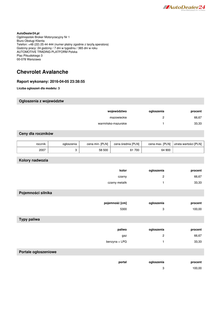 AutoDealer24.pl Ogólnopolski Broker Motoryzacyjny Nr 1 Biuro Obsługi Klienta Telefon: +48 (22) 25 44 444 (numer płatny zgodnie z taryfą operatora) Godziny pracy: 24 godziny / 7 dni w tygodniu / 365 dni w roku AUTOMOTIVE TRADING PLATFORM Polska Plac Piłsudskiego 3 00-078 Warszawa Chevrolet Avalanche Raport wykonany: 2016-04-05 23:38:55 Liczba ogłoszeń dla modelu: 3 Ogłoszenia z województw województwo ogłoszenia procent mazowieckie 2 66,67 warmińsko-mazurskie 1 33,33 Ceny dla roczników rocznik ogłoszenia cena min. [PLN] cena średnia [PLN] cena max. [PLN] 2007 3 58 500 61 700 64 900 utrata wartości [PLN] Kolory nadwozia kolor ogłoszenia procent czarny 2 66,67 czarny metalik 1 33,33 pojemność [cm] ogłoszenia procent 5300 3 100,00 paliwo ogłoszenia procent gaz 2 66,67 benzyna + LPG 1 33,33 portal ogłoszenia procent 3 100,00 Pojemności silnika Typy paliwa Portale ogłoszeniowe Powered by TCPDF (www.tcpdf.org)