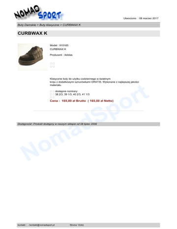Utworzono : 08 marzec 2017 Buty Damskie > Buty klasyczne > CURBWAX K CURBWAX K Model : 915165 CURBWAX K Producent : Adidas Klasyczne buty do użytku codziennego w świetnym kroju z dodatkowymi sznurówkami GRATIS. Wykonane z najlepszej jakości materiału. dostępne rozmiary: 38 2/3, 39 1/3, 40 2/3, 41 1/3 d a m o Dostępność: Produkt dostępny w naszym sklepie od 08 lipiec 2009 N kontakt : - [email protected] Strona 1/{nb} t r o p S Cena : 165,00 zł Brutto ( 165,00 zł Netto)