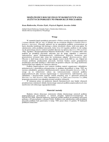 ZESZYTY PROBLEMOWE POSTĘPÓW NAUK ROLNICZYCH 2009 z. 535: 349-356 MOśLIWOŚCI ROLNICZEGO WYKORZYSTYWANIA ZUśYTYCH PODŁOśY PO PRODUKCJI PIECZAREK Beata Rutkowska, Wiesław Szulc, Wojciech Stępień, Jarosław Jobda Zakład Chemii Rolniczej, Katedra Nauk o Środowisku Glebowym, Szkoła Główna Gospodarstwa Wiejskiego Wstęp W ostatnich latach produkcja pieczarek w Polsce rozwija się bardzo dynamicznie i wynosi obecnie 180 tys. ton, co plasuje nas na czwartym miejscu w świecie [PORTAL HODOWCY GRZYBÓW]. Pieczarki uprawia się na specjalnym podłoŜu wytwarzanym na bazie obornika końskiego lub kurzego o duŜej zawartości słomy, torfu oraz gipsu. Po zakończeniu cyklu produkcji pieczarek, który trwa 6-8 tygodni, podłoŜe to nie nadaje się do ponownego uŜycia i stanowi produkt uboczny tej uprawy [SZUDYGA 1987; GAPIŃSKI 1996]. Zgodnie z Rozporządzeniem Ministra Środowiska z dnia 27 września 2001 roku podłoŜe po produkcji pieczarek zaliczane jest do grupy odpadów z rolnictwa, sadownictwa, upraw hydroponicznych, rybołówstwa, leśnictwa, łowiectwa oraz przetwórstwa Ŝywności jako „Inne nie wymienione odpady” [ROZPORZĄDZENIE 2001]. Obecnie w skali kraju roczna ilość tego odpadu wynosi około 900 tys. ton. Odpad ten stwarza problemy producentom pieczarek, bowiem bardzo często gospodarstwa produkujące pieczarki działają w oderwaniu od gruntów rolnych i nie mają moŜliwości utylizowania tego odpadu we własnym zakresie. PodłoŜe popieczarkowe jest cennym źródłem materii organicznej i składników pokarmowych, a prawidłowo przygotowane, tj. poddane dezynfekcji w temp. 70°C nie zawiera szkodników, grzybów chorobotwórczych i nasion chwastów [SZUDYGA 1998]. Z uwagi na te właściwości zaleca się wykorzystywanie zuŜytych podłoŜy popieczarkowych jako nawozu organicznego w warzywnictwie, sadownictwie, przy zakładaniu i utrzymywaniu terenów zieleni miejskiej oraz w uprawach polowych [KRYŃSKA i in. 1983; SZUDYGA 1998]. Natomiast RAK i in. [2001] oraz JANKOWSKI i in. [2004] proponują nawoŜenie tym odpadem równieŜ uŜytków zielonych. W niniejszej pracy na podstawie danych literaturowych oraz badań własnych przedstawiono zmienność składu chemicznego zuŜytych podłoŜy popieczarkowych oraz moŜliwości ich rolniczego zagospodarowania. Materiał i metody Badania własne dotyczące zmienności składu chemicznego zuŜytych podłoŜy popieczarkowych prowadzono w ramach projektu badawczo-rozwojowego Nr 0426/R/T02/2008. Materiał badawczy stanowiły próbki podłoŜy po produkcji pieczarek pobrane z 60 pieczarkarni z obszaru Polski. PodłoŜa te po zakończeniu cyklu produkcji pieczarki poddane były parowaniu w temp. 70°C przez okres 12 godzin. W badanych próbkach oznaczono: 350 - B. Rutkowska i inni zawartość suchej masy – metodą suszarkowo-wagową, całkowitą zawartość azotu – metodą Kjeldahla na aparacie VAPODEST 30 firmy Gerhardt, całkowitą zawartość węgla – metodą suchej destylacji na aparacie firmy ThermoElementar, całkowitą zawartość makroskładników (P, K, Ca, Mg, Na) i mikroskładników (Fe, Mn, Pb, Cd, Zn, Ni) po uprzedniej mineralizacji próbek w mieszaninie kwasów HNO3 i HClO4 (zmieszanych w stosunku 4:1), metodą ICP na aparacie firmy ThermoElementar. W pracy przedstawiono wartości średnie dla wszystkich badanych próbek. Niewielka zmienność składu chemicznego badanych podłoŜy wynika z faktu, Ŝe producenci pieczarek zaopatrują się w podłoŜa do produkcji pieczarek u dwóch głównych producentów. Ponadto hodowcy stosują taką sama technologię produkcji pieczarek. Wyniki i dyskusja Skład chemiczny podłoŜy popieczarkowych ZuŜyte podłoŜe popieczarkowe jest materiałem bogatym w materię organiczną oraz łatwo dostępne dla roślin składniki pokarmowe, a zwłaszcza w azot. Jeden metr sześcienny zuŜytego podłoŜa popieczarkowego zawiera taką ilość składników pokarmowych, jaka znajduje się w 2-3 m3 świeŜego obornika [SZUDYGA 1987; GAPIŃSKI 1996]. Jak wynika z tabeli 1, zuŜyte podłoŜa popieczarkowe charakteryzują się bardzo duŜym zróŜnicowaniem pod względem zawartości suchej masy, odczynu oraz zawartości węgla organicznego i składników pokarmowych. Tak duŜe zróŜnicowanie składu chemicznego zuŜytych podłoŜy popieczarkowych związane jest z technologią ich produkcji oraz z wielkością uzyskiwanych plonów pieczarki. JORDAN i in. [2008] badając zmienność składu chemicznego 63 próbek zuŜytych podłoŜy popieczarkowych wykazali, Ŝe spośród składników pokarmowych największej zmienności podlega zawartość fosforu przyswajalnego i wapnia (wartość współczynnika zmienności wynosiła odpowiednio 95,0% dla P i 83,3% dla Ca). Natomiast najmniejszemu zróŜnicowaniu podlegała zawartość materii organicznej i odczynu (wartość współczynników zmienności wynosiła odpowiednio 9,2% dla materii organicznej oraz 7,1% dla pH). Autorzy sugerują, iŜ w podłoŜach, w których do produkcji wykorzystuje się znaczne ilości obornika kurzego, mogą występować specyficzne enzymy (dodawane do paszy), które sprzyjają uwalnianiu większych ilości łatwo dostępnego dla uprawianych grzybów fosforu, co moŜe być przyczyną mniejszej zawartości tego składnika w zuŜytych podłoŜach w stosunku do podłoŜy produkowanych głównie na bazie obornika końskiego [JORDAN i in. 2008]. KALEMBASA i MAJCHROWSKA-SAFARYAN [2006] wykazały, Ŝe zawartość wapnia w zuŜytym podłoŜu popieczarkowym uzaleŜniona jest od ilości tego pierwiastka, jaka znajduje się w okrywie „kostki” podłoŜa przeznaczonego do uprawy pieczarek. Jak wykazali JORDAN i in. [2008], stosunek C:N w analizowanych przez autorów podłoŜach popieczarkowych podlega niewielkiemu zróŜnicowaniu (współczynnik zmienności 11,1%) i jest węŜszy od 25:1, co wskazuje na korzystne właściwości tego odpadu. Przy wąskim stosunku C:N w glebie przewaŜają procesy mineralizacji związków azotu na