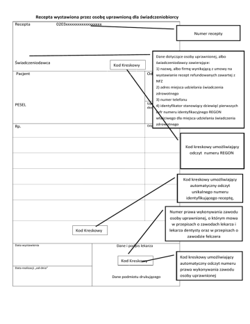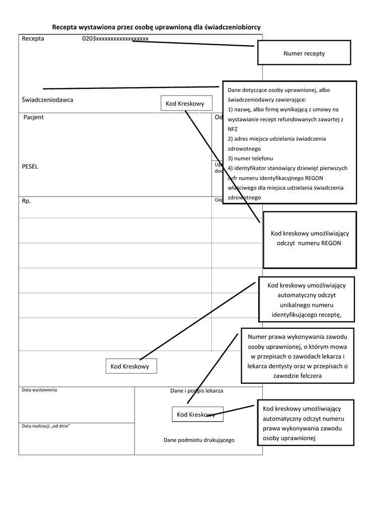 Recepta wystawiona przez osobę uprawnioną dla świadczeniobiorcy Recepta 0203xxxxxxxxxxxxxxxxxx Numer recepty Dane dotyczące osoby uprawnionej, albo Świadczeniodawca świadczeniodawcy zawierające: Kod Kreskowy Pacjent 1) nazwę, albo firmę wynikającą z umowy na Oddział NFZ wystawianie recept refundowanych zawartej z NFZ 2) adres miejsca udzielania świadczenia zdrowotnego 3) numer telefonu Uprawnienia 4) identyfikator stanowiący dziewięć pierwszych dodatkowe PESEL cyfr numeru identyfikacyjnego REGON właściwego dla miejsca udzielania świadczenia zdrowotnego Odpłatność Rp. Kod kreskowy umożliwiający odczyt numeru REGON Kod kreskowy umożliwiający automatyczny odczyt unikalnego numeru identyfikującego receptę, Numer prawa wykonywania zawodu osoby uprawnionej, o którym mowa w przepisach o zawodach lekarza i lekarza dentysty oraz w przepisach o zawodzie felczera Kod Kreskowy Data wystawienia Dane i podpis lekarza Kod Kreskowy Data realizacji „od dnia” Dane podmiotu drukującego Kod kreskowy umożliwiający automatyczny odczyt numeru prawa wykonywania zawodu osoby uprawnionej