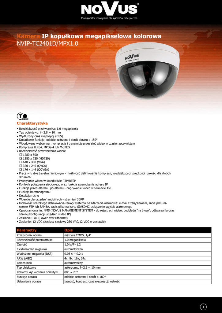 Profesjonalne rozwiązanie dla systemów zabezpieczeń Kamera IP kopułkowa megapikselowa kolorowa NVIP-TC2401D/MPX1.0 Charakterystyka • • • • • • • • • • • • • • • • • • Rozdzielczość przetwornika: 1.0 megapiksela Typ obiektywu: f=2.8 ~ 10 mm Wydłużony czas ekspozycji (DSS) Dodatkowe funkcje: odbicie lustrzane i obrót obrazu o 180° Wbudowany webserwer: kompresja i transmisja przez sieć wideo w czasie rzeczywistym Kompresja H.264, MPEG-4 lub M-JPEG Rozdzielczość przetwarzania wideo: - 1280 x 800 - 1280 x 720 (HD720) - 640 x 480 (VGA) - 320 x 240 (QVGA) - 176 x 144 (QQVGA) Praca w trybie trzystrumieniowym - możliwość definiowania kompresji, rozdzielczości, prędkości i jakości dla dwóch strumieni Przesyłanie wideo w standardzie RTP/RTSP Kontrola połączenia sieciowego oraz funkcja sprawdzania adresu IP Funkcje przed-alarmu i po-alarmu - nagrywanie wideo w formacie AVI Funkcja harmonogramu Detekcja ruchu Wparcie dla urządzeń mobilnych - strumień 3GPP Możliwość szerokiego definiowania reakcji systemu na zdarzenia alarmowe: e-mail z załącznikiem, zapis pliku na serwer FTP lub SAMBA, zapis pliku na kartę SD/SDHC, załączenie wyjścia alarmowego Oprogramowanie: NMS (NOVUS MANAGEMENT SYSTEM - do rejestracji wideo, podglądu “na żywo”, odtwarzania oraz zdalnej konfiguracji urządzeń wideo IP) Zasilanie: PoE (Power over Ethernet) Zasilanie: 12 VDC (zasilacz sieciowy 230 VAC/12 VDC w zestawie) Parametry Opis Przetwornik obrazu matryca CMOS, 1/4” Rozdzielczość przetwornika 1.0 megapiksela Czułość 1.0 lx/F=1.2 Elektroniczna migawka automatyczna Wydłużona migawka (DSS) 0.03 s ~ 0.2 s ARW (AGC) 4x, 8x, 16x, 24x Balans bieli automatyczny Typ obiektywu asferyczny, f=2.8 ~ 10 mm Poziomy kąt widzenia obiektywu 80° ~ 23° Funkcje obrazu odbicie lustrzane i obrót o 180° Ustawienia obrazu jasność, kontrast, czas ekspozycji, ostrość 1 Profesjonalne rozwiązanie dla systemów zabezpieczeń Parametry Opis Kompresja wideo H.264/MPEG-4/M-JPEG Rozdzielczość 1280 x 800, 1280 x 720 (HD720), 640 x 480 (VGA), 320 x 240 (QVGA), 176 x 144 (QQVGA) Reakcja systemu na zdarzenia alarmowe e-mail z załącznikiem, zapis na FTP, zapis na karcie SD, zapis na serwerze Samba, aktywacja wyjścia Funkcje przed-alarmu i po-alarmu nagrywanie przed -alarmowe maks. 5 s i po-alarmowe maks. 5 s, z możliwością regulacji Prędkość przetwarzania do 30 obr/s dla wszystkich rozdzielczości Podgląd pełnoekranowy tak Format zapisywanego obrazu AVI, sekwencja JPEG, JPEG Rejestr zdarzeń do 250 zdarzeń na grupę (detekcja ruchu, zdarzenia systemowe) Liczba jednoczesnych połączeń sieciowych maks. 10 Porty zewnętrzne 1 x Ethernet - złącze RJ-45, 10/100 Mbit/s, 1 x SD/SDHC Detekcja ruchu sprzętowa Synchronizacja czasu automatyczna synchronizacja zegara systemowego z serwerami NTP Wspierane protokoły sieciowe HTTP, HTTPS, FTP, NTP, DDNS, DHCP, UDP, TCP/IP, RTP, RTSP, 3GPP, UPnP, QoS Oprogramowanie NMS Autoryzacja hasłem hasło dostępu do kamery i jej konfiguracji Zasilanie PoE tak Zasilanie 12 VDC (zasilacz sieciowy 230 VAC/12 VDC w komplecie) Pobór mocy 2,88 W Temperatura pracy -10°C ~ 45°C Wymiary (mm) 131,2 (Ø) x 94,3 (wys) Masa 340 g 2