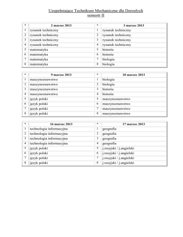 Uzupełniające Technikum Mechaniczne dla Dorosłych semestr II * 1 2 3 4 5 6 7 8 * 1 2 3 4 5 6 7 8 * 1 2 3 4 5 6 7 8 2 marzec 2013 rysunek techniczny rysunek techniczny rysunek techniczny rysunek techniczny matematyka matematyka matematyka matematyka 9 marzec 2013 maszynoznawstwo maszynoznawstwo maszynoznawstwo maszynoznawstwo język polski język polski język polski język polski 16 marzec 2013 technologia informacyjna technologia informacyjna technologia informacyjna technologia informacyjna język polski język polski język polski język polski * 1 2 3 4 5 6 7 8 * 1 2 3 4 5 6 7 8 * 1 2 3 4 5 6 7 8 3 marzec 2013 rysunek techniczny rysunek techniczny rysunek techniczny rysunek techniczny historia historia biologia biologia 10 marzec 2013 biologia biologia historia historia maszynoznawstwo maszynoznawstwo maszynoznawstwo maszynoznawstwo 17 marzec 2013 geografia geografia geografia geografia j.rosyjski / j.angielski j.rosyjski / j.angielski j.rosyjski / j.angielski j.rosyjski / j.angielski Uzupełniające Technikum Technologii Drewna dla Dorosłych semestr II * 1 2 3 4 5 6 7 8 * 1 2 3 4 5 6 7 8 * 1 2 3 4 5 6 7 8 2 marzec 2013 technologia technologia technologia technologia matematyka matematyka matematyka matematyka * 1 2 3 4 5 6 7 8 9 marzec 2013 rysunek techniczny rysunek techniczny rysunek techniczny rysunek techniczny język polski język polski język polski język polski 16 marzec 2013 technologia informacyjna technologia informacyjna technologia informacyjna technologia informacyjna język polski język polski język polski język polski * 1 2 3 4 5 6 7 8 * 1 2 3 4 5 6 7 8 3 marzec 2013 technologia technologia technologia technologia historia historia biologia biologia 10 marzec 2013 biologia biologia historia historia rysunek techniczny rysunek techniczny rysunek techniczny rysunek techniczny 17 marzec 2013 geografia geografia geografia geografia j.rosyjski / j.angielski j.rosyjski / j.angielski j.rosyjski / j.angielski j.rosyjski / j.angielski Uzupełniające Technikum Handlowe dla Dorosłych semestr II * 1 2 3 4 5 6 7 8 * 1 2 3 4 5 6 7 8 * 1 2 3 4 5 6 7 8 2 marzec 2013 marketing marketing marketing marketing matematyka matematyka matematyka matematyka * 1 2 3 4 5 6 7 8 9 marzec 2013 rachunkowość handlowa rachunkowość handlowa rachunkowość handlowa rachunkowość handlowa język polski język polski język polski język polski 16 marzec 2013 technologia informacyjna technologia informacyjna technologia informacyjna technologia informacyjna język polski język polski język polski język polski * 1 2 3 4 5 6 7 8 * 1 2 3 4 5 6 7 8 3 marzec 2013 towaroznawstwo towaroznawstwo towaroznawstwo towaroznawstwo historia historia biologia biologia 10 marzec 2013 biologia biologia historia historia rachunkowość handlowa rachunkowość handlowa rachunkowość handlowa rachunkowość handlowa 17 marzec 2013 geografia geografia geografia geografia j.rosyjski / j.angielski j.rosyjski / j.angielski j.rosyjski / j.angielski j.rosyjski / j.angielski Uzupełniające Technikum Mechaniczne dla Dorosłych semestr IV * 1 2 3 4 5 6 7 8 * 1 2 3 4 5 6 7 8 * 1 2 3 4 5 6 7 8 2 marzec 2013 matematyka matematyka matematyka matematyka podstawy konstrukcji maszyn podstawy konstrukcji maszyn podstawy konstrukcji maszyn podstawy konstrukcji maszyn 9 marzec 2013 technologia mechaniczna technologia mechaniczna technologia mechaniczna technologia mechaniczna wyposażenie elektr. pojazdów samochod. wyposażenie elektr. pojazdów samochod. eksploatacja maszyn i urządzeń eksploatacja maszyn i urządzeń 16 marzec 2013 język polski język polski język polski język polski układy sterowania i regulacji układy sterowania i regulacji układy sterowania i regulacji układy sterowania i regulacji * 1 2 3 4 5 6 7 8 3 marzec 2013 historia historia historia historia j.rosyjski / j.angielski j.rosyjski / j.angielski j.rosyjski / j.angielski j.rosyjski / j.angielski * 1 10 marzec 2013 2 3 4 5 6 7 8 * 1 2 3 4 5 6 7 8 historia historia historia historia 17 marzec 2013 język polski język polski język polski język polski podstawy konstrukcji maszyn podstawy konstrukcji maszyn podst. konstrukcji masz. – egz. pisemny podst. konstrukcji masz. – egz. pisemny Uzupełniające Technikum Technologii Drewna dla Dorosłych semestr IV * 1 2 3 4 2 marzec 2013 matematyka matematyka matematyka matematyka * 1 2 3 4 5 5 6 6 7 7 8 8 * 1 9 marzec 2013 * 1 2 2 3 3 4 4 5 5 6 6 7 7 8 8 * 1 2 3 4 5 6 7 8 16 marzec 2013 język polski język polski język polski język polski technologia technologia maszyny i urządzenia maszyny i urządzenia * 1 2 3 4 5 6 7 8 3 marzec 2013 historia historia historia historia j.rosyjski / j.angielski j.rosyjski / j.angielski j.rosyjski / j.angielski j.rosyjski / j.angielski 10 marzec 2013 technologia technologia maszyny i urządzenia maszyny i urządzenia historia historia historia historia 17 marzec 2013 język polski język polski język polski język polski konstrukcje konstrukcje elektrotechnika i automatyka elektrotechnika i automatyka Uzupełniające Technikum Handlowe dla Dorosłych semestr IV * 1 2 3 4 5 6 7 8 * 1 2 3 4 5 6 7 8 * 1 2 3 4 5 6 7 8 2 marzec 2013 matematyka matematyka matematyka matematyka elementy prawa elementy prawa elementy prawa elementy prawa 9 marzec 2013 ekonomika handlu ekonomika handlu ekonomika handlu ekonomika handlu rachunkowość handlowa rachunkowość handlowa rachunkowość handlowa rachunkowość handlowa 16 marzec 2013 język polski język polski język polski język polski elementy prawa elementy prawa elementy prawa elementy prawa * 1 2 3 4 5 6 7 8 * 1 2 3 4 5 6 7 8 * 1 2 3 4 5 6 7 8 3 marzec 2013 historia historia historia historia j.rosyjski / j.angielski j.rosyjski / j.angielski j.rosyjski / j.angielski j.rosyjski / j.angielski 10 marzec 2013 elementy prawa elementy prawa elementy prawa elementy prawa historia historia historia historia 17 marzec 2013 język polski język polski język polski język polski elementy prawa elementy prawa elementy prawa –