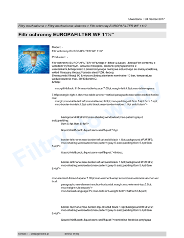 Utworzono : 08 marzec 2017 Filtry mechaniczne > Filtry mechaniczne siatkowe > Filtr ochronny EUROPAFILTER WF 11½" Filtr ochronny EUROPAFILTER WF 11½" Model : Filtr ochronny EUROPAFILTER WF 11½" Producent : Filtr ochronny EUROPAFILTER WF 11½" . Filtr ochronny z wkładem wymiennym. Głowica mosiężna, śrubunki przyłączeniowe z uszczelkami, klosz z przezroczystego tworzywa sztucznego ze śrubą spustową, wkład filtracyjny. Posiada atest PZH. Skuteczność filtracji 90 µm, ciśnienie nominalne 10 bar, temperatura wody/otoczenia max. 30/40ºC. y d mso-yfti-tbllook:1184;mso-table-lspace:7.05pt;margin-left:4.8pt;mso-table-rspace: o w 7.05pt;margin-right:4.8pt;mso-table-anchor-vertical:paragraph;mso-table-anchor-horizo ntal: margin;mso-table-left:left;mso-table-top:6.5pt;mso-padding-alt:0cm 5.4pt 0cm 5.4pt; mso-border-insideh:1.5pt solid black;mso-border-insidev:1.5pt solid black"> o d background:#F2F2F2;mso-shading:windowtext;mso-pattern:gray-5 auto;padding: 0cm 5.4pt 0cm 5.4pt"> y r lt "Arial","sans-serif"">typ i F border-left:none;mso-border-left-alt:solid black 1.5pt;background:#F2F2F2; mso-shading:windowtext;mso-pattern:gray-5 auto;padding:0cm 5.4pt 0cm 5.4pt"> "Arial","sans-serif""> border-left:none;mso-border-left-alt:solid black 1.5pt;background:#F2F2F2; mso-shading:windowtext;mso-pattern:gray-5 auto;padding:0cm 5.4pt 0cm 5.4pt"> mso-element-frame-hspace:7.05pt;mso-element-wrap:around;mso-element-anchor-ver tical: paragraph;mso-element-anchor-horizontal:margin;mso-element-top:6.5pt; mso-height-rule:exactly"> mso-fareast-language:PL;mso-bidi-font-weight:bold">1½" border-top:none;mso-border-top-alt:solid black 1.5pt;background:#F2F2F2; mso-shading:windowtext;mso-pattern:gray-5 auto;padding:0cm 5.4pt 0cm 5.4pt"> "Arial","sans-serif"">nominalna średnica przyłącza kontakt : - [email protected] Strona 1/{nb} Utworzono : 08 marzec 2017 Filtry mechaniczne > Filtry mechaniczne siatkowe > Filtr ochronny EUROPAFILTER WF 11½" Filtr ochronny EUROPAFILTER WF 11½" none;border-bottom:solid black 1.5pt;border-right:solid black 1.5pt; mso-border-top-alt:solid black 1.5pt;mso-border-left-alt:solid black 1.5pt; padding:0cm 5.4pt 0cm 5.4pt"> "Arial","sans-serif"">DN none;border-bottom:solid black 1.5pt;border-right:solid black 1.5pt; mso-border-top-alt:solid black 1.5pt;mso-border-left-alt:solid black 1.5pt; padding:0cm 5.4pt 0cm 5.4pt"> y d mso-element-frame-hspace:7.05pt;mso-element-wrap:around;mso-element-anchor-ver tical: paragraph;mso-element-anchor-horizontal:margin;mso-element-top:6.5pt; mso-height-rule:exactly">40 o d o w border-top:none;mso-border-top-alt:solid black 1.5pt;background:#F2F2F2; mso-shading:windowtext;mso-pattern:gray-5 auto;padding:0cm 5.4pt 0cm 5.4pt; height:17.6pt"> y r lt "Arial","sans-serif"">wydajność przy Δp=0.2bar i F none;border-bottom:solid black 1.5pt;border-right:solid black 1.5pt; mso-border-top-alt:solid black 1.5pt;mso-border-left-alt:solid black 1.5pt; padding:0cm 5.4pt 0cm 5.4pt;height:17.6pt"> "Arial","sans-serif"">m³/h none;border-bottom:solid black 1.5pt;border-right:solid black 1.5pt; mso-border-top-alt:solid black 1.5pt;mso-border-left-alt:solid black 1.5pt; padding:0cm 5.4pt 0cm 5.4pt;height:17.6pt"> mso-element-frame-hspace:7.05pt;mso-element-wrap:around;mso-element-anchor-ver tical: paragraph;mso-element-anchor-horizontal:margin;mso-element-top:6.5pt; mso-height-rule:exactly">9.0 border-top:none;mso-border-top-alt:solid black 1.5pt;background:#F2F2F2; mso-shading:windowtext;mso-pattern:gray-5 auto;padding:0cm 5.4pt 0cm 5.4pt"> "Arial","sans-serif"">długość montażowa kontakt : - [email protected] Strona 2/{nb} Utworzono : 08 marzec 2017 Filtry mechaniczne > Filtry mechaniczne siatkowe > Filtr ochronny EUROPAFILTER WF 11½" Filtr ochronny EUROPAFILTER WF 11½" none;border-bottom:solid black 1.5pt;border-right:solid black 1.5pt; mso-border-top-alt:solid black 1.5pt;mso-border-left-alt:solid black 1.5pt; padding:0cm 5.4pt 0cm 5.4pt"> "Arial","sans-serif"">mm none;border-bottom:solid black 1.5pt;border-right:solid black 1.5pt; mso-border-top-alt:solid black 1.5pt;mso-border-left-alt:solid black 1.5pt; padding:0cm 5.4pt 0cm 5.4pt"> y d mso-element-frame-hspace:7.05pt;mso-element-wrap:around;mso-element-anchor-ver tical: paragraph;mso-element-anchor-horizontal:margin;mso-element-top:6.5pt; mso-height-rule:exactly">254 o d o w border-top:none;mso-border-top-alt:solid black 1.5pt;background:#F2F2F2; mso-shading:windowtext;mso-pattern:gray-5 auto;padding:0cm 5.4pt 0cm 5.4pt"> y r lt "Arial","sans-serif"">wysokość montażowa i F none;border-bottom:solid black 1.5pt;border-right:solid black 1.5pt; mso-border-top-alt:solid black 1.5pt;mso-border-left-alt:solid black 1.5pt; padding:0cm 5.4pt 0cm 5.4pt"> "Arial","sans-serif"">mm none;border-bottom:solid black 1.5pt;border-right:solid black 1.5pt; mso-border-top-alt:solid black 1.5pt;mso-border-left-alt:solid black 1.5pt; padding:0cm 5.4pt 0cm 5.4pt"> mso-element-frame-hspace:7.05pt;mso-element-wrap:around;mso-element-anchor-ver tical: paragraph;mso-element-anchor-horizontal:margin;mso-element-top:6.5pt; mso-height-rule:exactly">290 Cena : 784,74 zł Brutto ( 638,00 zł Netto) kontakt : - [email protected] Strona 3/{nb} Utworzono : 08 marzec 2017 Filtry mechaniczne > Filtry mechaniczne siatkowe > Filtr ochronny EUROPAFILTER WF 11½" Filtr ochronny EUROPAFILTER WF 11½" Dostępność: Produkt dostępny w naszym sklepie od 03 luty 2012 y d y r lt i F kontakt : - [email protected] o d Strona 4/{nb} o w