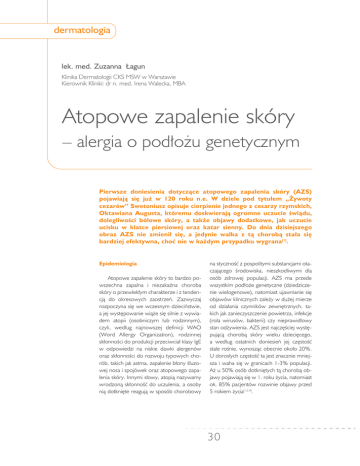 dermatologia lek. med. Zuzanna Łagun Klinika Dermatologii CKS MSW w Warszawie Kierownik Kliniki: dr n. med. Irena Walecka, MBA Atopowe zapalenie skóry – alergia o podłożu genetycznym Pierwsze doniesienia dotyczące atopowego zapalenia skóry (AZS) pojawiają się już w 120 roku n.e. W dziele pod tytułem „Żywoty cezarów” Swetoniusz opisuje cierpienie jednego z cesarzy rzymskich, Oktawiana Augusta, któremu doskwierają ogromne uczucie świądu, dolegliwości bólowe skóry, a także objawy dodatkowe, jak uczucie ucisku w klatce piersiowej oraz katar sienny. Do dnia dzisiejszego obraz AZS nie zmienił się, a jedynie walka z tą chorobą stała się bardziej efektywna, choć nie w każdym przypadku wygrana[1]. Epidemiologia Atopowe zapalenie skóry to bardzo powszechna zapalna i niezakaźna choroba skóry o przewlekłym charakterze i z tendencją do okresowych zaostrzeń. Zazwyczaj rozpoczyna się we wczesnym dzieciństwie, a jej występowanie wiąże się silnie z wywiadem atopii (osobniczym lub rodzinnym), czyli, według najnowszej definicji WAO (Word Allergy Organization), rodzinnej skłonności do produkcji przeciwciał klasy IgE w odpowiedzi na niskie dawki alergenów oraz skłonności do rozwoju typowych chorób, takich jak astma, zapalenie błony śluzowej nosa i spojówek oraz atopowego zapalenia skóry. Innymi słowy, atopią nazywamy wrodzoną skłonność do uczulenia, a osoby nią dotknięte reagują w sposób chorobowy na styczność z pospolitymi substancjami otaczającego środowiska, nieszkodliwymi dla osób zdrowej populacji. AZS ma przede wszystkim podłoże genetyczne (dziedziczenie wielogenowe), natomiast ujawnianie się objawów klinicznych zależy w dużej mierze od działania czynników zewnętrznych, takich jak zanieczyszczenie powietrza, infekcje (rola wirusów, bakterii) czy nieprawidłowy stan odżywienia. AZS jest najczęściej występującą chorobą skóry wieku dziecięcego, a według ostatnich doniesień jej częstość stale rośnie, wynosząc obecnie około 20%. U dorosłych częstość ta jest znacznie mniejsza i waha się w granicach 1-3% populacji. Aż u 50% osób dotkniętych tą chorobą objawy pojawiają się w 1. roku życia, natomiast ok. 85% pacjentów rozwinie objawy przed 5 rokiem życia[1,2,4]. 30 Podwyższony poziom immunoglobuliny E (tzw. atopina; przeciwciało) w atopowym zapaleniu skóry wskazuje na alergiczny element podłoża tej choroby i stanowi cenną wskazówkę w diagnostyce różnicowej. Przeciwciało to, zaangażowane w procesy alergiczne, skierowane jest przeciw występującym powszechnie alergenom, takim jak pokarmy (mleko, białko jaja kurzego) czy alergeny powietrznopochodne (np. pyłki traw, roztocza kurzu domowego), uwrażliwiając zarazem na nie skórę, czego efektem są typowe objawy kliniczne. Podkreśla się zatem rolę alergenów jako czynników prowokujących pojawianie się zmian skórnych. Kontakt z nimi skutkuje odpowiedzią ze strony komórek obronnych skóry (komórki Langerhansa), pobudzone zostają limfocyty T (komórki układu odpornościowego) i rozwija się uczulenie. Każdy następny kontakt z alergenami sprawczymi skutkuje zaostrzeniem się obrazu klinicznego. Udowodniono, że eliminacja alergenów pokarmowych skutkuje poprawą w zakresie zmian skórnych, natomiast im silniejsze uczulenie na aeroalergeny, tym cięższy obraz choroby[5,6]. Mechanizm rozwoju AZS nadal budzi wątpliwości, lecz istota problemu została dogłębnie przeanalizowana i poznana. Wiadomo, że błędy w budowie filagryny (mutacje w obrębie genu filagryny, białka występującego w rogowej warstwie naskórka), której funkcją jest spajanie włókien keratyny w procesie dojrzewania keratynocytów (komórek naskórka) skutkują utratą jej funkcji, a w efekcie nieprawidłową budową bariery skórno-naskórkowej. Zaburzona jest także równowaga pomiędzy poziomem enzymów proteolitycznych pochodzenia wewnętrznego a ich inhibitorami (które prawidłowo działając, nie dopuszczają do degradacji przez enzymy proteolityczne korneodesmosomów), jak również obserwuje się obniżony poziom ceramidów, czyli cennych lipidów warstwy rogowej naskórka będących nieprzepu- szczalną powłoką dla wody. Poprzez nieszczelne połączenia pomiędzy korneodesmosomami (miejsca połączenia, mocno kotwiczące filamenty pośrednie pomiędzy sąsiednimi komórkami w warstwie rogowej naskórka; struktury łączące komórki na zasadzie zatrzasków) następuje przeznaskórkowa ucieczka wody, wzmożona penetracja alergenów zewnątrzpochodnych do naskórka, jak również nasilona odpowiedź zapalna i immunologiczna. Suchość skóry, tak bardzo charakterystyczna dla AZS, jest właśnie efektem wyżej wymienionych mechanizmów[1,2]. Zmiany skórne W obrazie klinicznym dominują zmiany o charakterze rumieniowym z obecnością pęcherzyków, grudek, jak również nadżerek powstałych w wyniku mechanicznego drażnienia skóry spowodowanego nasilonym uczuciem świądu, który jest główną cechą tej choroby. Zmiany skórne mogą przybierać różną morfologię, głównie w zależności od wieku pacjenta, ale także od fazy choroby w danym momencie. U niemowląt pierwsze zmiany skórne pojawiają się zazwyczaj na bocznych powierzchniach policzków oraz na skórze owłosionej głowy. Są to zmiany rumieniowe, bardzo swędzące, które szybko ulegają ewolucji w zmiany pęcherzykowo-grudkowe. Przy nadkażeniu bakteryjnym skóra przybiera charakterystyczny obraz tzw. „przypalonego mleka”, a tę fazę choroby nazywamy wysiękową. Ponadto zajęta jest również okolica zgięciowa kończyn górnych i dolnych, najczęściej z wyłączeniem okolicy zakrytej przez pieluszkę. W okresie dzieciństwa dominuje duża suchość skóry, a zmiany skórne lokalizują się głównie w okolicach zgięciowych oraz na powierzchniach grzbietowych rąk i stóp. U osób dorosłych zajęte są powieki, skóra wokół ust, szyi, górnej części klatki pier