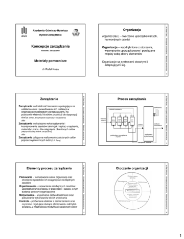 Wydział Zarządzania organizo (łac.) – tworzenie uporządkowanych, harmonijnych całości Koncepcje zarządzania Organizacja – wyodrębnione z otoczenia, wewnętrznie uporządkowane i powiązane między sobą zbiory elementów kierunek: Zarządzanie Materiały pomocnicze Organizacje są systemami otwartymi i adaptującymi się. dr Rafał Kusa dr Rafał Kusa, Koncepcje zarządzania, Materiały pomocnicze Organizacja Akademia Górniczo-Hutnicza 2 albo Zarządzanie to skuteczne wykorzystywanie i koordynowanie zasobów takich jak: kapitał, urządzenia, materiały i praca, dla osiągnięcia określonych celów [Międzynarodowy słownik zarządzania] albo Zarządzanie polega na realizowaniu założonych celów poprzez wysiłek innych ludzi [G.R. Terry] 3 5 zakłócenia wielkość pożądana wielkość zadana planowanie organizowanie motywowanie kontrola wielkość realizowana wielkość nastawiana podsystem zarządzania (regulator) podsystem wykonawczy sprzężenie zwrotne Otoczenie organizacji 4 dr Rafał Kusa, Koncepcje zarządzania, Materiały pomocnicze Planowanie – formułowanie celów organizacji oraz określenie sposobów ich osiągnięcia i niezbędnych zasobów Organizowanie – zapewnienie niezbędnych zasobów i uporządkowanie procesu w przestrzeni i czasie, w tym budowa struktury organizacyjnej Motywowanie – wyjaśnianie celów działalności oraz pobudzanie wykonawców do ich wykonania Kontrola – porównanie efektów z zamierzeniami oraz czynności regulujące służące eliminowaniu odchyleń od planu, z możliwością modyfikacji ustalonych celów dr Rafał Kusa, Koncepcje zarządzania, Materiały pomocnicze Elementy procesu zarządzania Proces zarządzania dr Rafał Kusa, Koncepcje zarządzania, Materiały pomocnicze Zarządzanie to działalność kierownicza polegająca na ustalaniu celów i powodowaniu ich realizacji w organizacjach podległych zarządzającemu na podstawie własności środków produkcji lub dyspozycji nimi [B. Gliński, Encyklopedia organizacji i zarządzania] dr Rafał Kusa, Koncepcje zarządzania, Materiały pomocnicze Zarządzanie 6 1 Efektywność – stosunek efektów do nakładów efektywność = efekty / nakłady Rentowność – stosunek zysku do kosztów rentowność = zysk / koszty Strategiczny poziom zarządzania Strategiczny poziom zarządzania – określa ogólną orientację organizacji w otoczeniu, precyzuje jej misję, główne cele, wyroby i rynki oraz rozdziela zasoby między podstawowe obszary działania organizacji 7 8 Elementy planowania strategicznego • • • • analiza szans i zagrożeń w otoczeniu organizacji analiza słabych i mocnych stron organizacji budowa opcji strategicznych organizacji przyjęcie założeń strategicznych określających hipotetyczne kierunki przewidywanych zmian w otoczeniu organizacji • ocena opcji strategicznych i wybór wariantu zapewniającego najwyższy stopień osiągnięcia głównych celów organizacji • opracowanie planu implementacji strategii 9 - Organizacja Mocne strony (Strenghts) Słabe strony (Weaknesses) Otoczenie Szanse (Opportunities) Zagrożenia (Threaths) 11 10 Zadania zarządzania operacyjnego • zapewnienie sprawnej realizacji strategii • rozwiązanie szczegółowych problemów nie ujętych w planie strategicznym dr Rafał Kusa, Koncepcje zarządzania, Materiały pomocnicze + dr Rafał Kusa, Koncepcje zarządzania, Materiały pomocnicze Analiza SWOT dr Rafał Kusa, Koncepcje zarządzania, Materiały pomocnicze Operacyjny poziom zarządzania – odpowiada za bieżące funkcjonowanie przedsiębiorstwa i zapewnia mu ciągłe warunki bytowania dr Rafał Kusa, Koncepcje zarządzania, Materiały pomocnicze Operacyjny poziom zarządzania dr Rafał Kusa, Koncepcje zarządzania, Materiały pomocnicze Skuteczność – miara stopnia realizacji zamierzonych efektów (celów) dr Rafał Kusa, Koncepcje zarządzania, Materiały pomocnicze Ocena sprawności działań 12 2 • • • detalizacja planowania strategicznego do konkretnych planów działania w przestrzeni i czasie zabezpieczenie podstawowych warunków bytu organizacji: rentowności i płynności finansowej określenie poziomu produkcji, zbytu, zatrudnienia, zaopatrzenia, urządzeń oraz prac badawczo-rozwojowych (plany procesów rzeczowych) określenie wpływów, kosztów, wyniku kalkulacyjnego (plan procesów finansowych) System planów operacyjnych 13 Elastyczność planowania – gwarantuje szybką weryfikację planu, jeśli zmiany w otoczeniu i samym przedsiębiorstwie powodują niewydolność obowiązującej strategii 15 14 Misja, cele, zadania Misja – przedmiot aspiracji, czyli trwałych dążeń organizacji, określony zwykle w akcie erekcyjnym lub statucie, jako zakres jej społecznie pożądanej działalności Cel – określony przedmiotowo i podmiotowo, przyszły, pożądany stan lub rezultat działania organizacji, możliwy i przewidziany do osiągnięcia w terminie lub okresie mieszczącym się w przedziale czasu objętym wieloletnim lub krótkookresowym planem działania Zadanie – wyodrębniona przedmiotowo, podmiotowo, przestrzennie, czasowo i na ogół też proceduralnie część celu przewidziana do wykonania w ustalonym okresie lub terminie mieszczącym się w przedziale czasu przewidzianym na osiągnięcie tego celu dr Rafał Kusa, Koncepcje zarządzania, Materiały pomocnicze Ciągłość planowania – planowanie operatywne musi zabezpieczać realizację obowiązującej strategii dr Rafał Kusa, Koncepcje zarządzania, Materiały pomocnicze Ciągłość i elastyczność planowania dr Rafał Kusa, Koncepcje zarządzania, Materiały pomocnicze • dr Rafał Kusa, Koncepcje zarządzania, Materiały pomocnicze Zadania planu operacyjnego 16 3