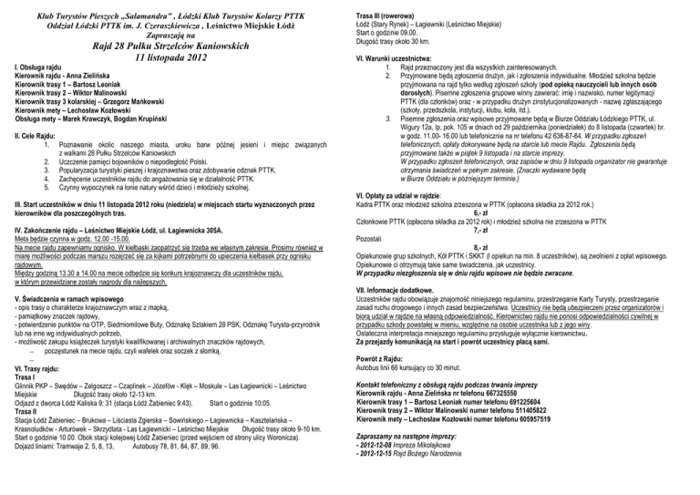 Klub Turystów Pieszych „Salamandra” , Łódzki Klub Turystów Kolarzy PTTK Oddział Łódzki PTTK im. J. Czeraszkiewicza , Leśnictwo Miejskie Łódź Zapraszają na Rajd 28 Pułku Strzelców Kaniowskich 11 listopada 2012 I. Obsługa rajdu Kierownik rajdu - Anna Zielińska Kierownik trasy 1 – Bartosz Leoniak Kierownik trasy 2 – Wiktor Malinowski Kierownik trasy 3 kolarskiej – Grzegorz Mańkowski Kierownik mety – Lechosław Kozłowski Obsługa mety – Marek Krawczyk, Bogdan Krupiński II. Cele Rajdu: 1. Poznawanie okolic naszego miasta, uroku barw późnej jesieni i miejsc związanych z walkami 28 Pułku Strzelców Kaniowskich 2. Uczczenie pamięci bojowników o niepodległość Polski. 3. Popularyzacja turystyki pieszej i krajoznawstwa oraz zdobywanie odznak PTTK, 4. Zachęcenie uczestników rajdu do angażowania się w działalność PTTK. 5. Czynny wypoczynek na łonie natury wśród dzieci i młodzieży szkolnej. III. Start uczestników w dniu 11 listopada 2012 roku (niedziela) w miejscach startu wyznaczonych przez kierowników dla poszczególnych tras. IV. Zakończenie rajdu – Leśnictwo Miejskie Łódź, ul. Łagiewnicka 305A. Meta będzie czynna w godz. 12.00 -15.00. Na mecie rajdu zapewniamy ognisko. W kiełbaski zaopatrzyć się trzeba we własnym zakresie. Prosimy również w miarę możliwości podczas marszu rozejrzeć się za kijkami potrzebnymi do upieczenia kiełbasek przy ognisku rajdowym. Między godziną 13.30 a 14.00 na mecie odbędzie się konkurs krajoznawczy dla uczestników rajdu, w którym przewidziane zostały nagrody dla najlepszych. V. Świadczenia w ramach wpisowego - opis trasy o charakterze krajoznawczym wraz z mapką, - pamiątkowy znaczek rajdowy, - potwierdzenie punktów na OTP, Siedmiomilowe Buty, Odznakę Szlakiem 28 PSK, Odznakę Turysta-przyrodnik lub na inne wg indywidualnych potrzeb, - możliwość zakupu książeczek turystyki kwalifikowanej i archiwalnych znaczków rajdowych, poczęstunek na mecie rajdu, czyli wafelek oraz soczek z słomką. VI. Trasy rajdu: Trasa I Glinnik PKP – Swędów – Zelgoszcz – Czaplinek – Józefów - Klęk – Moskule – Las Łagiewnicki – Leśnictwo Miejskie Długość trasy około 12-13 km. Odjazd z dworca Łódź Kaliska 9: 31 (stacja Łódź Żabieniec 9:43). Start o godzinie 10:05. Trasa II Stacja Łódź Żabieniec – Brukowa – Liściasta Zgierska – Sowińskiego – Łagiewnicka – Kasztelańska – Krasnoludków - Arturówek – Skrzydlata - Las Łagiewnicki – Leśnictwo Miejskie Długość trasy około 9-10 km. Start o godzinie 10.00. Obok stacji kolejowej Łódź Żabieniec (przed wejściem od strony ulicy Woronicza). Dojazd liniami: Tramwaje 2, 5, 8, 13, Autobusy 78, 81, 84, 87, 89, 96. Trasa III (rowerowa) Łódź (Stary Rynek) – Łagiewniki (Leśnictwo Miejskie) Start o godzinie 09.00. Długość trasy około 30 km. VI. Warunki uczestnictwa: 1. Rajd przeznaczony jest dla wszystkich zainteresowanych. 2. Przyjmowane będą zgłoszenia drużyn, jak i zgłoszenia indywidualne. Młodzież szkolna będzie przyjmowana na rajd tylko według zgłoszeń szkoły (pod opieką nauczycieli lub innych osób dorosłych). Pisemne zgłoszenia grupowe winny zawierać: imię i nazwisko, numer legitymacji PTTK (dla członków) oraz - w przypadku drużyn zinstytucjonalizowanych - nazwę zgłaszającego (szkoły, przedszkola, instytucji, klubu, koła, itd.). 3. Pisemne zgłoszenia oraz wpisowe przyjmowane będą w Biurze Oddziału Łódzkiego PTTK, ul. Wigury 12a, Ip, pok. 105 w dniach od 29 października (poniedziałek) do 8 listopada (czwartek) br. w godz. 11.00- 16.00 lub telefonicznie na nr telefonu 42 636-87-64. W przypadku zgłoszeń telefonicznych, opłaty dokonywane będą na starcie lub mecie Rajdu. Zgłoszenia będą przyjmowane także w piątek 9 listopada i na starcie imprezy. W przypadku zgłoszeń telefonicznych, oraz zapisów w dniu 9 listopada organizator nie gwarantuje otrzymania świadczeń w pełnym zakresie. (Znaczki wydawane będą w Biurze Oddziału w późniejszym terminie.) VI. Opłaty za udział w rajdzie: Kadra PTTK oraz młodzież szkolna zrzeszona w PTTK (opłacona składka za 2012 rok.) 6,- zł Członkowie PTTK (opłacona składka za 2012 rok) i młodzież szkolna nie zrzeszona w PTTK 7,- zł Pozostali 8,- zł Opiekunowie grup szkolnych, Kół PTTK i SKKT (l opiekun na min. 8 uczestników), są zwolnieni z opłat wpisowego. Opiekunowie ci otrzymują takie same świadczenia, jak uczestnicy. W przypadku niezgłoszenia się w dniu rajdu wpisowe nie będzie zwracane. VII. Informacje dodatkowe. Uczestników rajdu obowiązuje znajomość niniejszego regulaminu, przestrzeganie Karty Turysty, przestrzeganie zasad ruchu drogowego i innych zasad bezpieczeństwa. Uczestnicy nie będą ubezpieczeni przez organizatorów i biorą udział w rajdzie na własną odpowiedzialność. Kierownictwo rajdu nie ponosi odpowiedzialności cywilnej w przypadku szkody powstałej w mieniu, względnie na osobie uczestnika lub z jego winy. Ostateczna interpretacja mniejszego regulaminu przysługuje wyłącznie kierownictwu. Za przejazdy komunikacją na start i powrót uczestnicy płacą sami. Powrót z Rajdu: Autobus linii 66 kursujący co 30 minut. Kontakt telefoniczny z obsługą rajdu podczas trwania imprezy Kierownik rajdu - Anna Zielińska nr telefonu 667325550 Kierownik trasy 1 – Bartosz Leoniak numer telefonu 691225604 Kierownik trasy 2 – Wiktor Malinowski numer telefonu 511405822 Kierownik mety – Lechosław Kozłowski numer telefonu 605957519 Zapraszamy na następne imprezy: - 2012-12-08 Impreza Mikołajkowa - 2012-12-15 Rajd Bożego Narodzenia